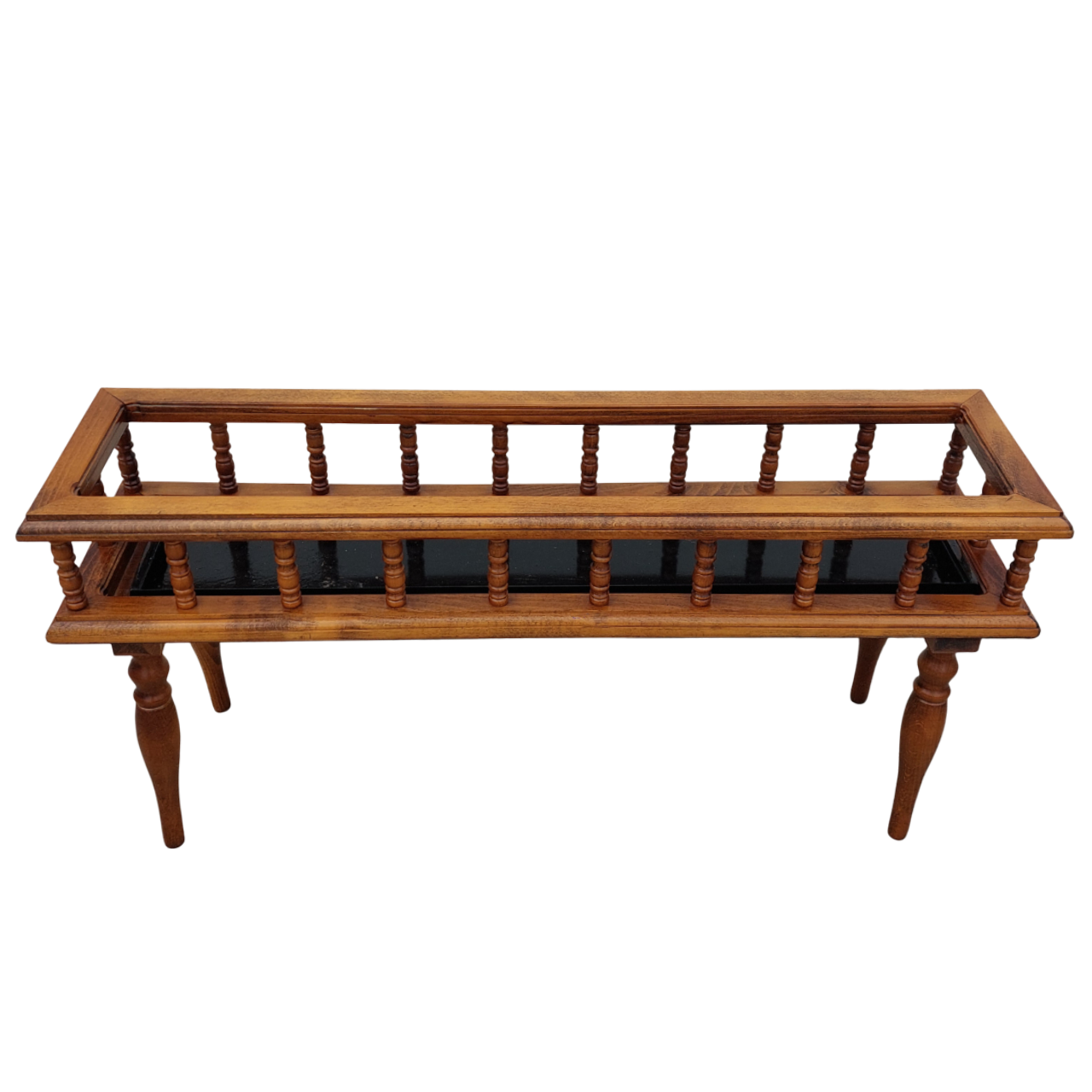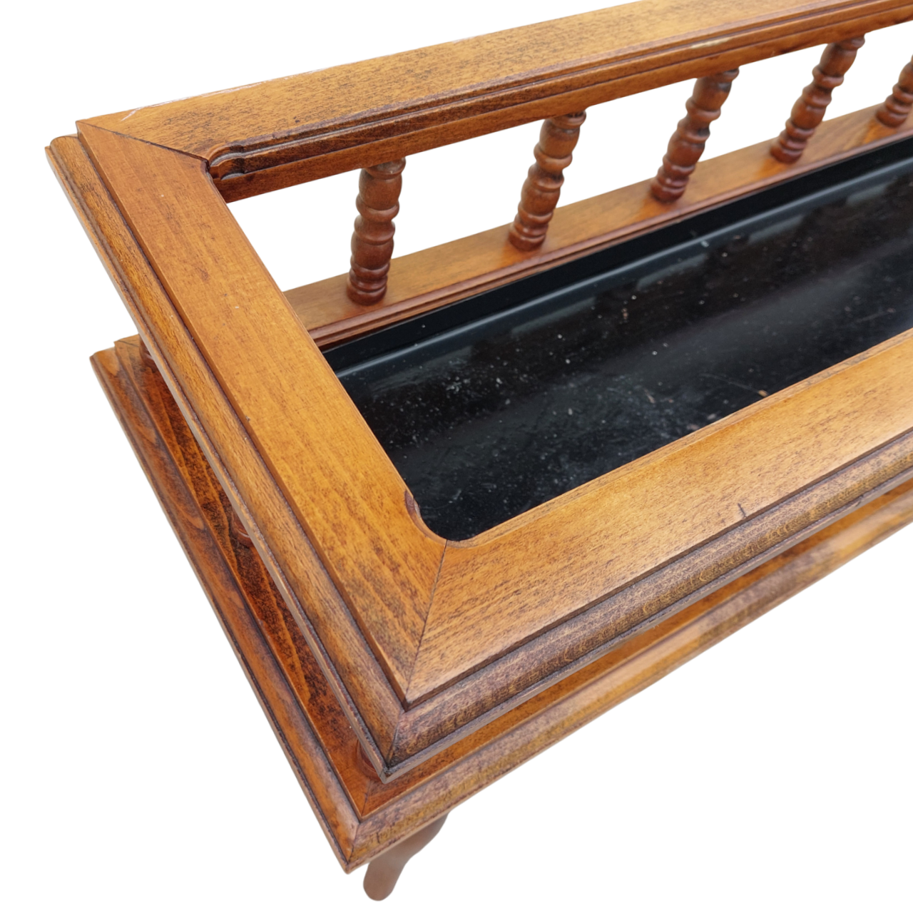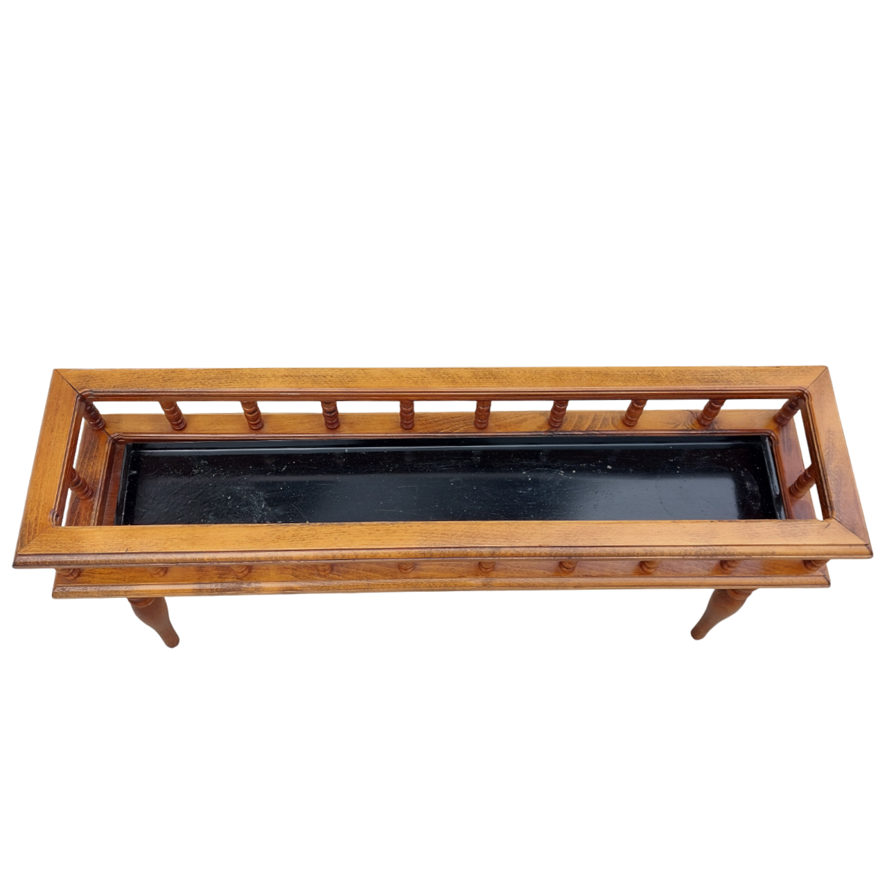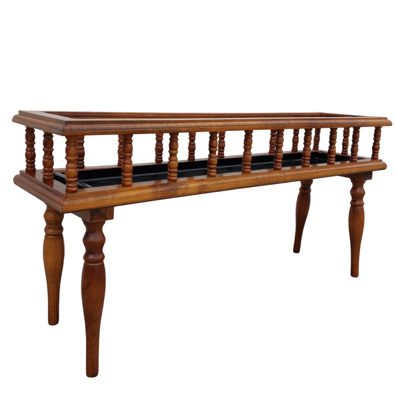 Medinis stovas augalams su tekintomis, išsukamomis kojelėmis. Viduje – juodas metalinis išimamas įdėklas vazonams. Patogus naudoti namuose ar terasoje.