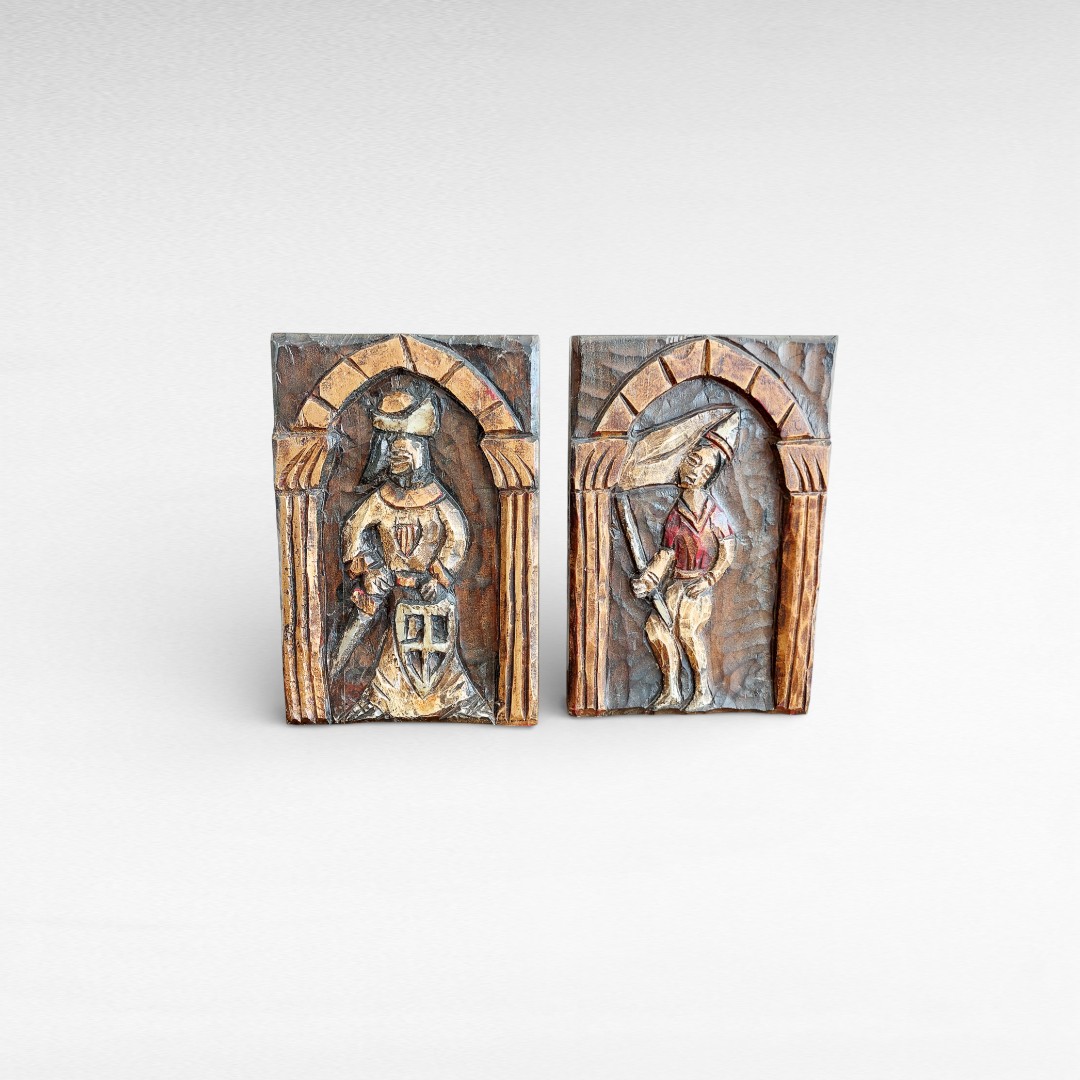 Drožinėti mediniai bareljefai, vaizduojantys du viduramžių karius.
