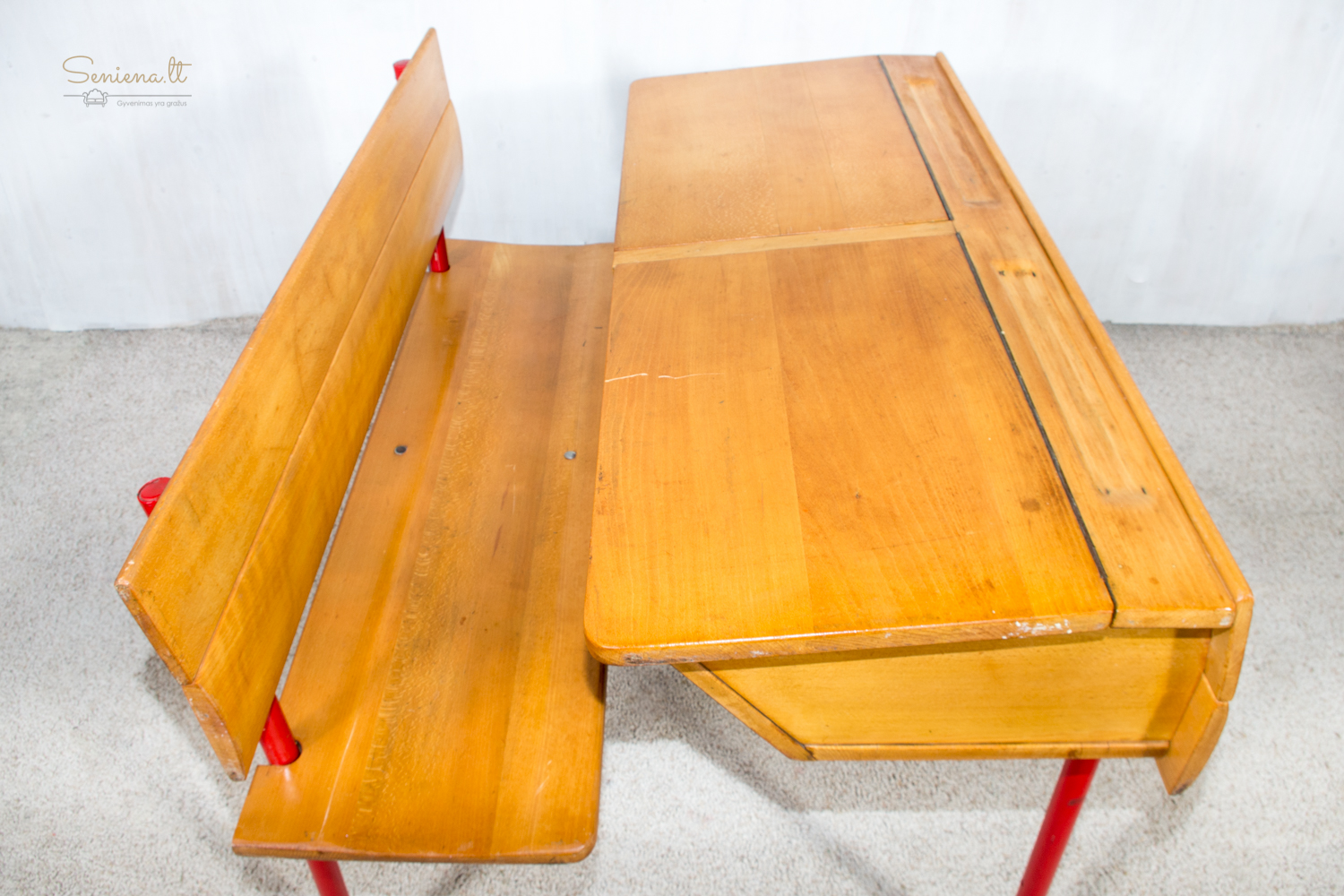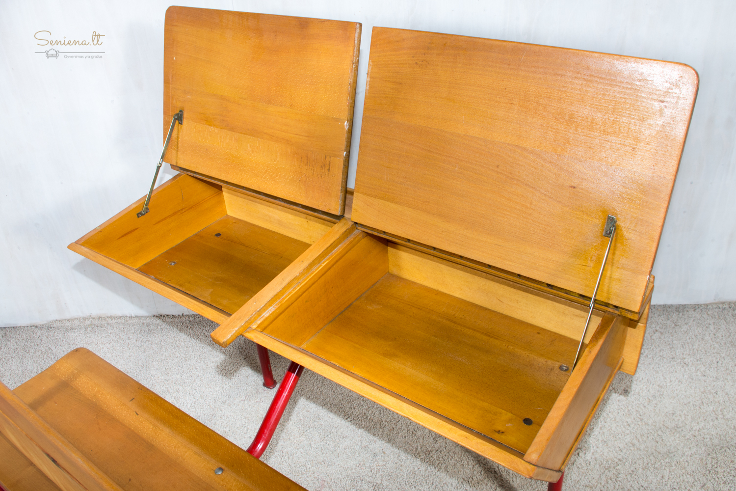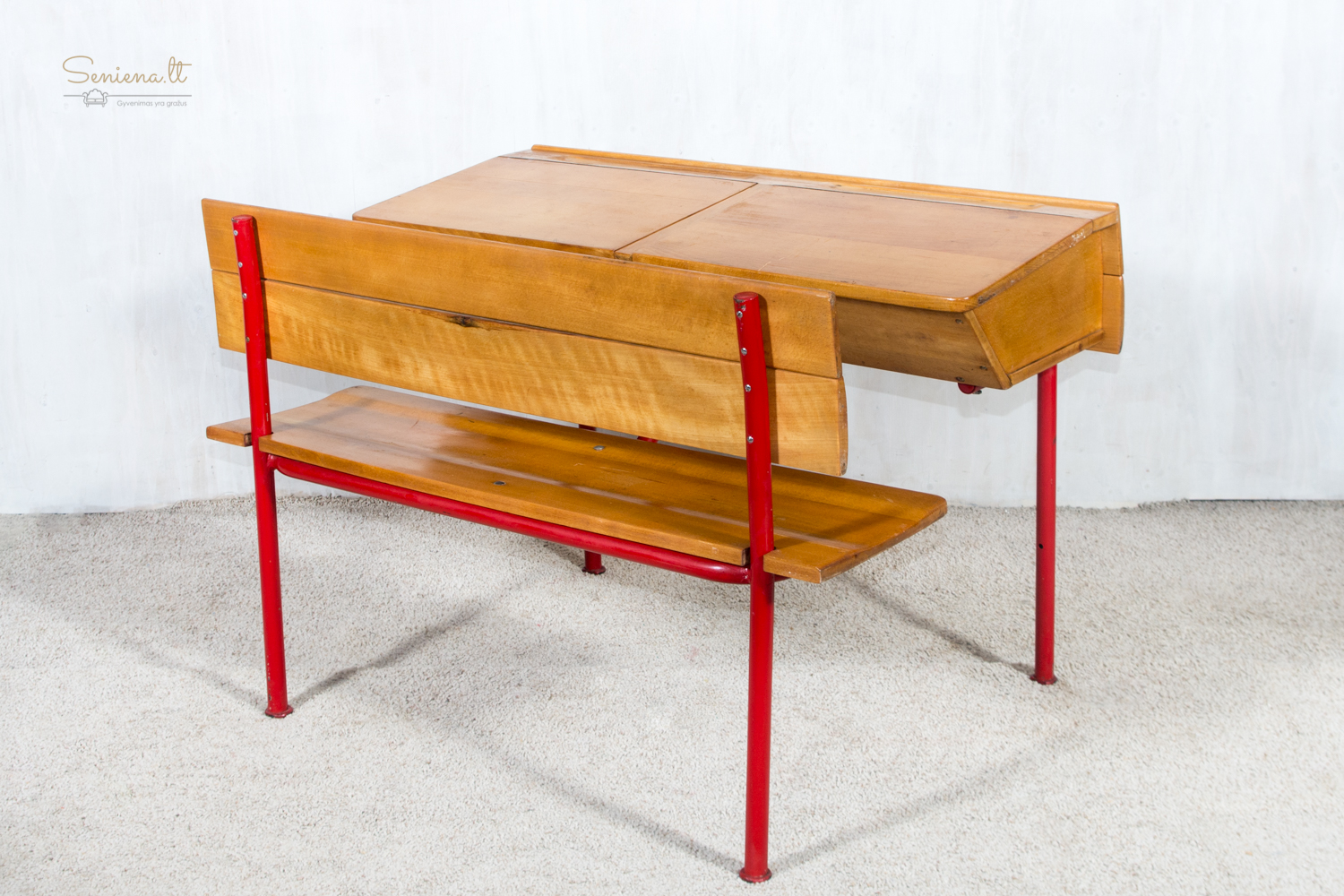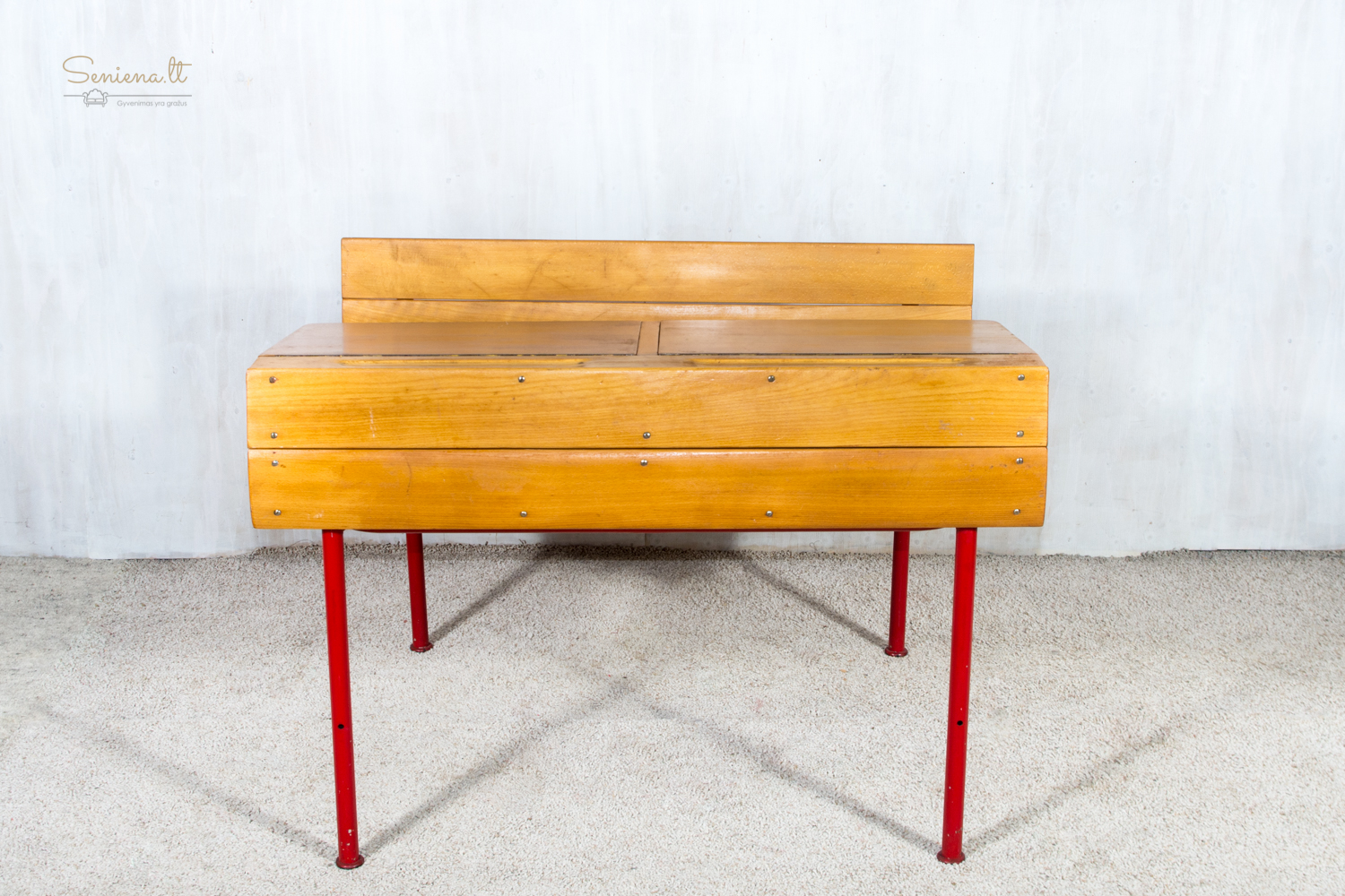 Mokyklinis dvivietis suolas. Metalo kojelės. Tvirtas ir stabilus. Parvežta iš Prancūzijos