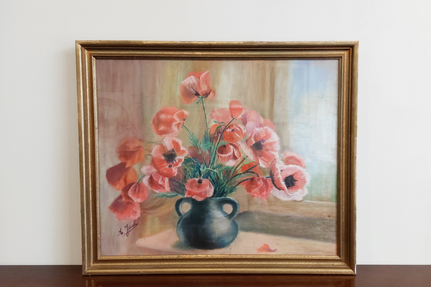 Klasikinio stiliaus natiurmortas su aguonomis. Tapytas ant kietos plokštės. Įrėmintas su stiklu.