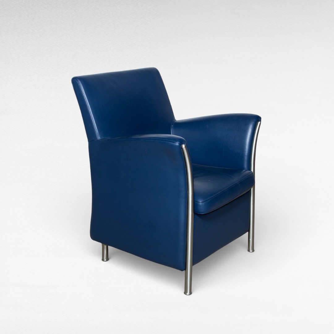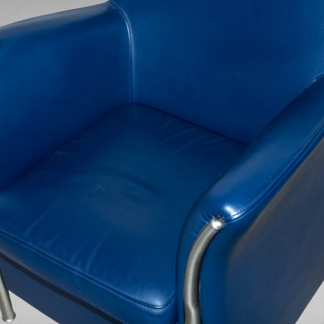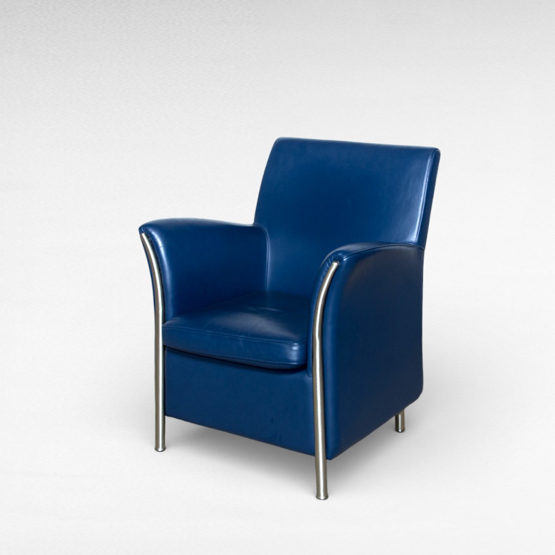 Modernus fotelis su chromuotais metaliniais porankiais ir tvirtu korpusu, aptrauktas mėlyna natūralia oda. Dizainas italų gamintojo Giulio Marelli, veikiančio nuo 1964 m. Brianza regione, žinomo dėl aukštos kokybės minkštųjų baldų gamybos. Tikėtina šis fotelis pagamintas apie 1990 m, kai Marelli aktyviai plėtėsi į tarptautinę rinką.