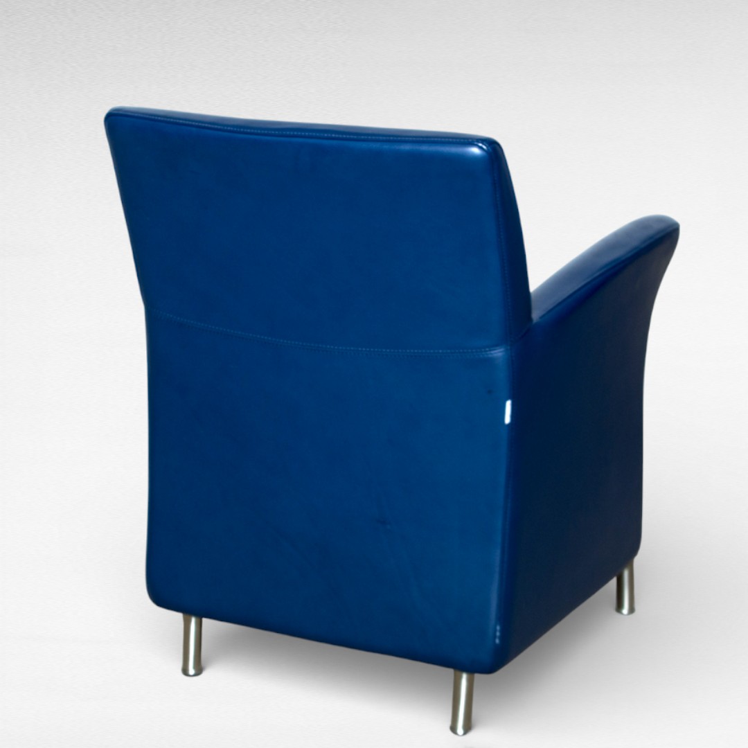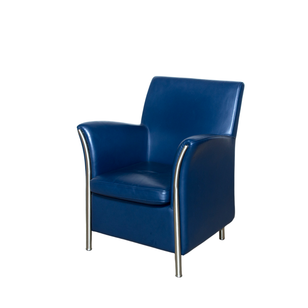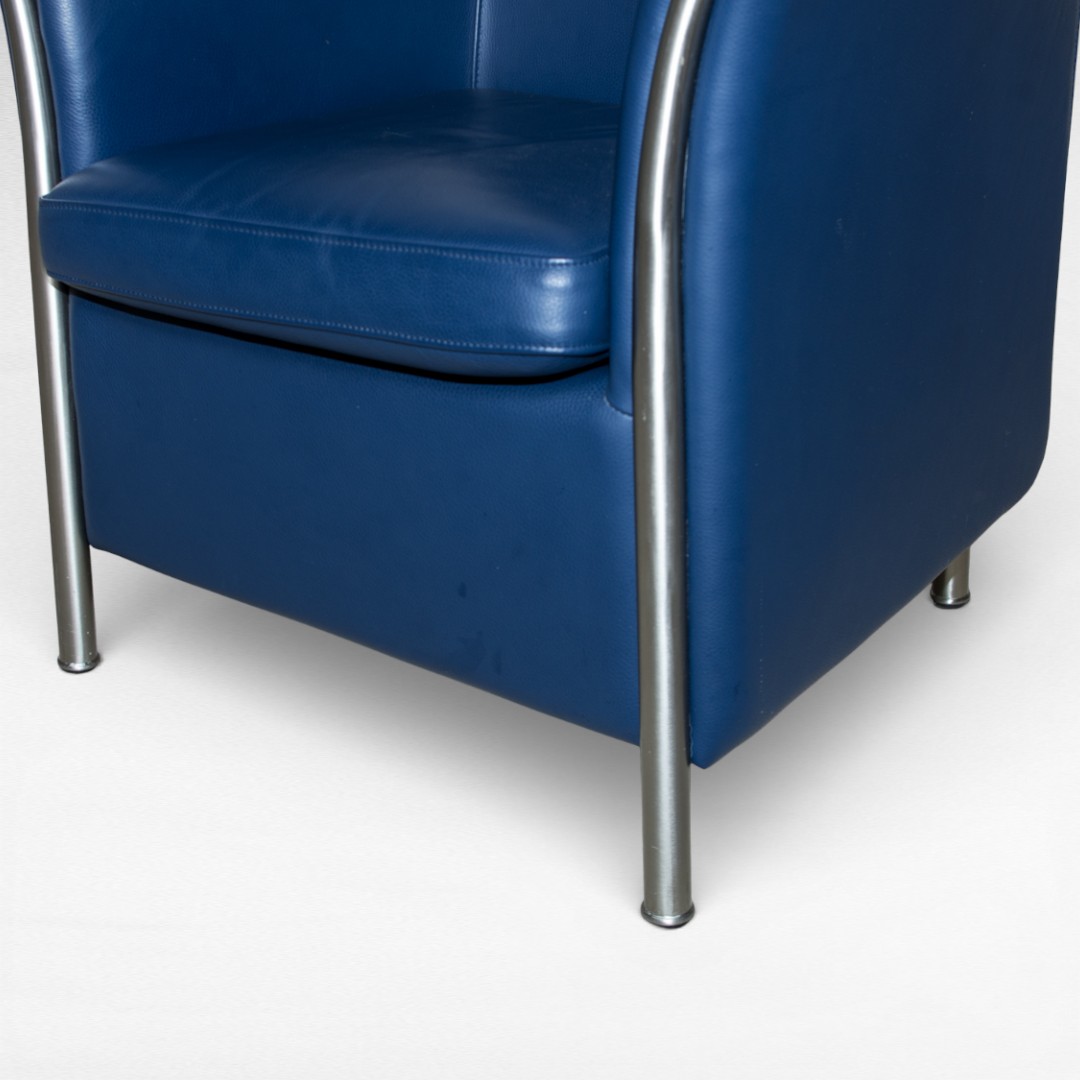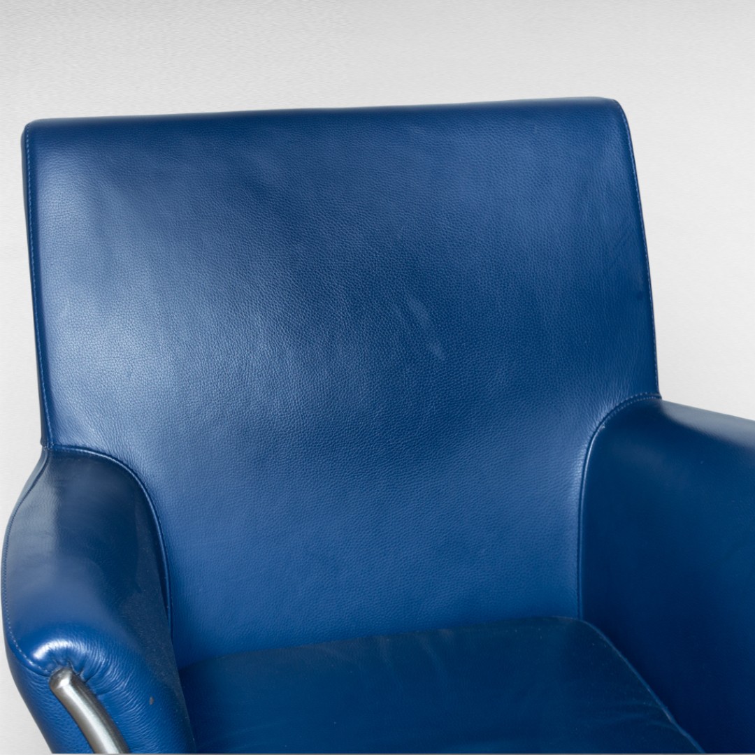 Modernus fotelis su chromuotais metaliniais porankiais ir tvirtu korpusu, aptrauktas mėlyna natūralia oda. Dizainas italų gamintojo Giulio Marelli, veikiančio nuo 1964 m. Brianza regione, žinomo dėl aukštos kokybės minkštųjų baldų gamybos. Tikėtina šis fotelis pagamintas apie 1990 m, kai Marelli aktyviai plėtėsi į tarptautinę rinką.
