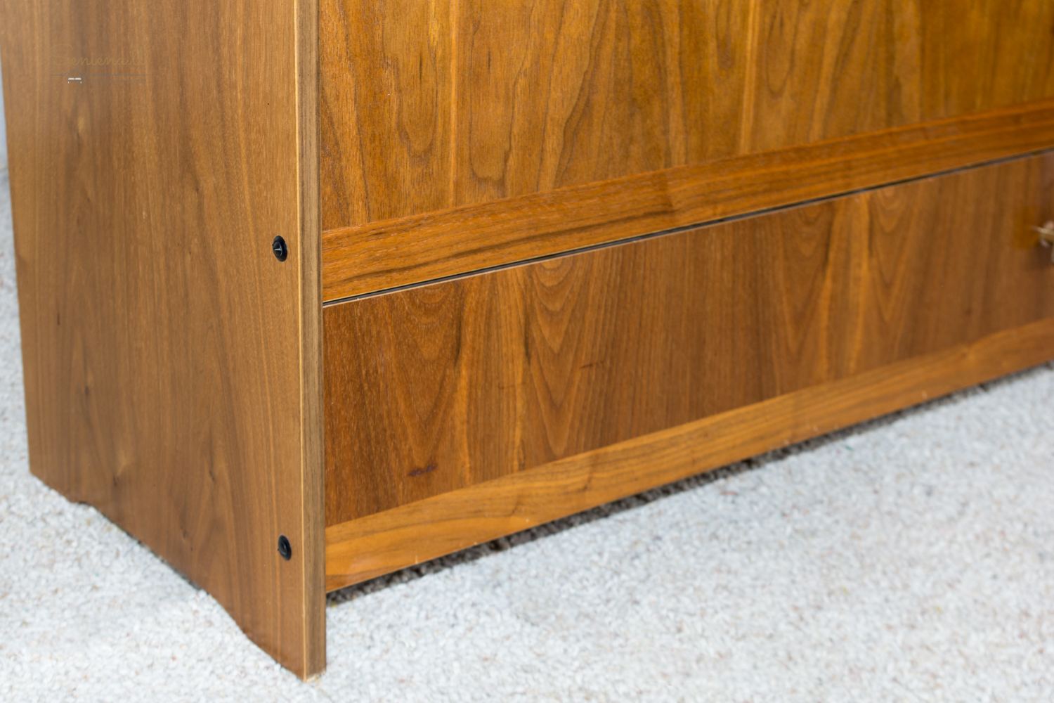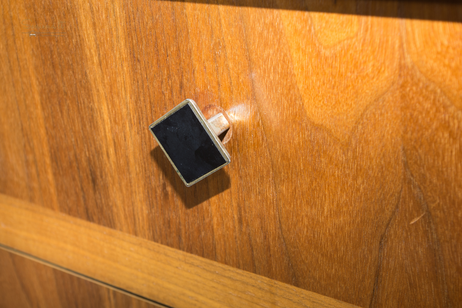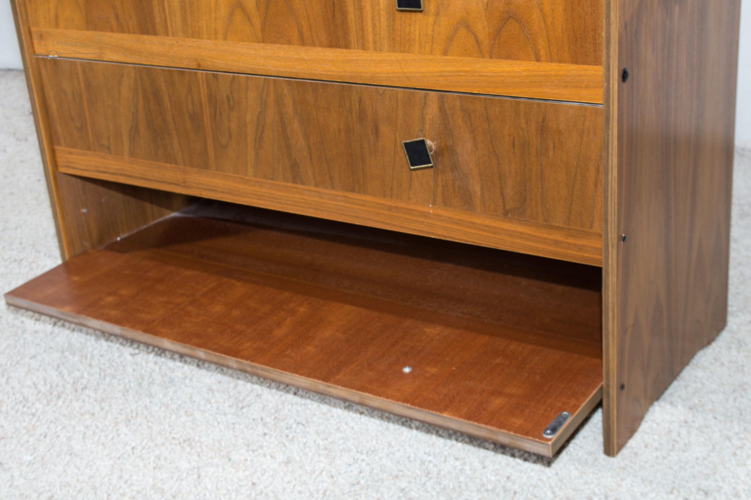 Keturių lentynų spintelė avalynei, parvežta iš Prancūzijos. Pagaminta iš faneruotos medienos, su ryškiu medžio raštu ir tamsiomis rombo formos rankenėlėmis. Durelės atsidaro žemyn, viduje ventiliuojamos lentynos su perforuotu pagrindu. Apie 1960 m.