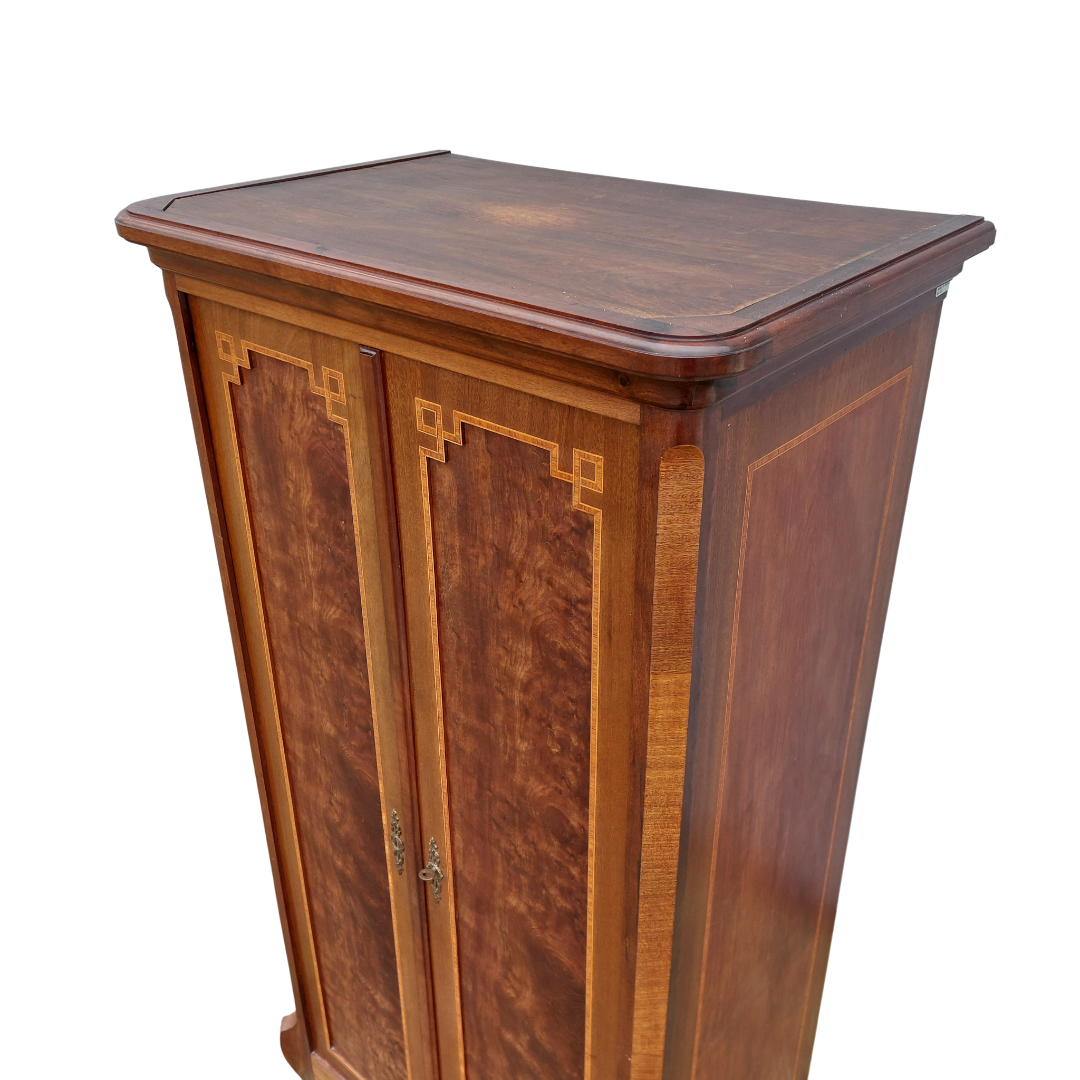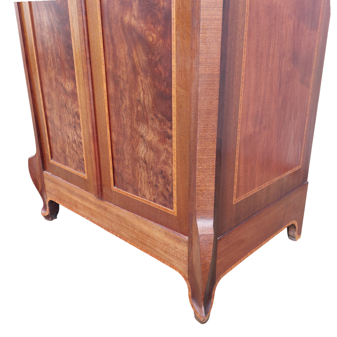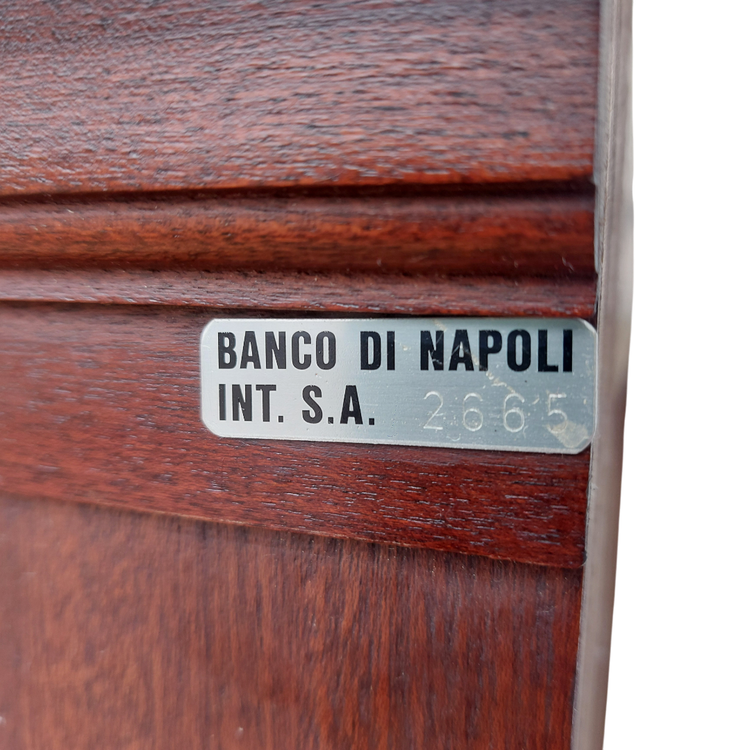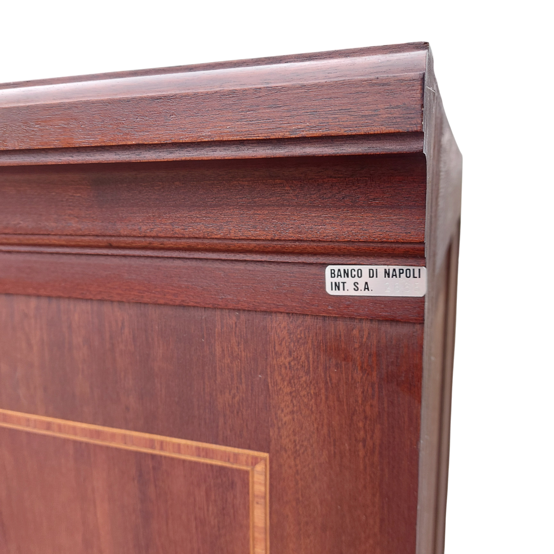 Itališka raudonmedžio spinta, artima Umbertino laikotarpiui. Durys dengtos raštuota faneruote, formos ramios, su lengvu lenkimu ties kojelėmis. Ant šono yra „Banco di Napoli“ inventoriaus plokštelė, kuri reiškia, kad ši spinta kažkada priklausė Italijos bankui ir buvo jų vidaus apstatymo dalis. Geros būklės.