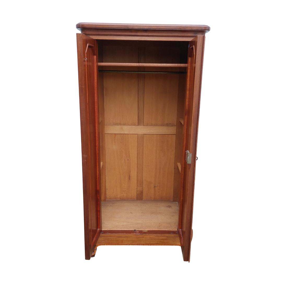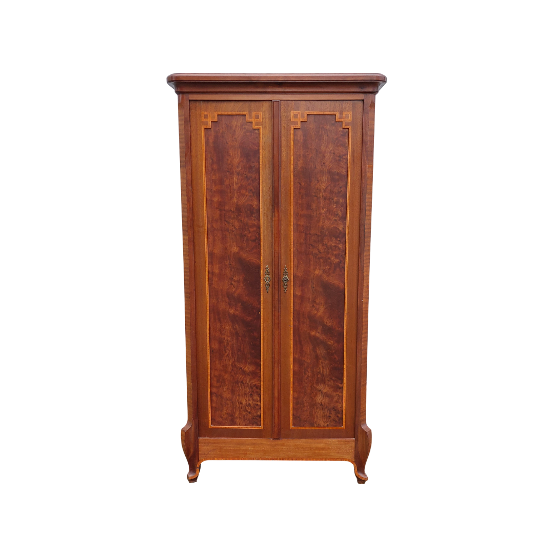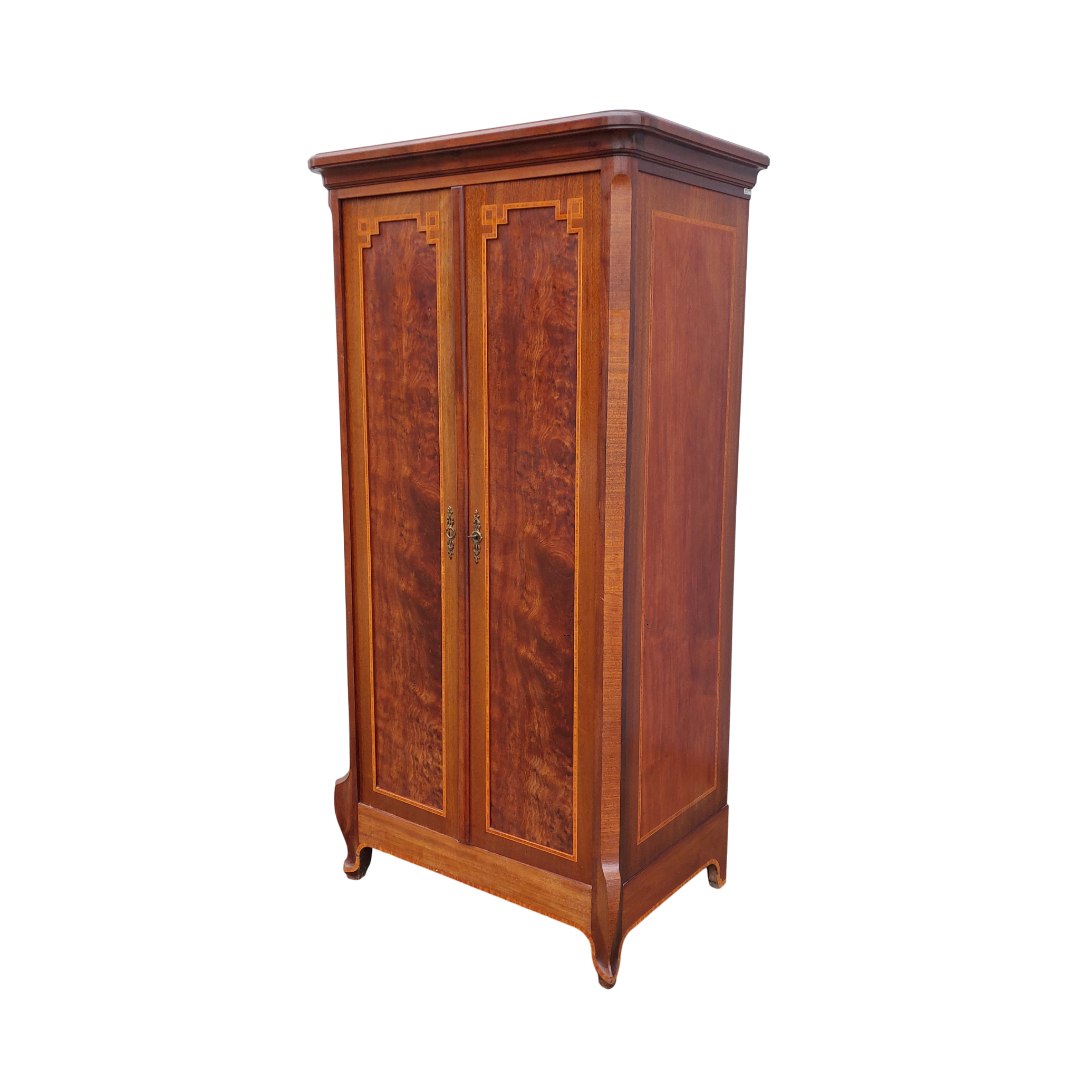 Itališka raudonmedžio spinta, artima Umbertino laikotarpiui. Durys dengtos raštuota faneruote, formos ramios, su lengvu lenkimu ties kojelėmis. Ant šono yra „Banco di Napoli“ inventoriaus plokštelė, kuri reiškia, kad ši spinta kažkada priklausė Italijos bankui ir buvo jų vidaus apstatymo dalis. Geros būklės.