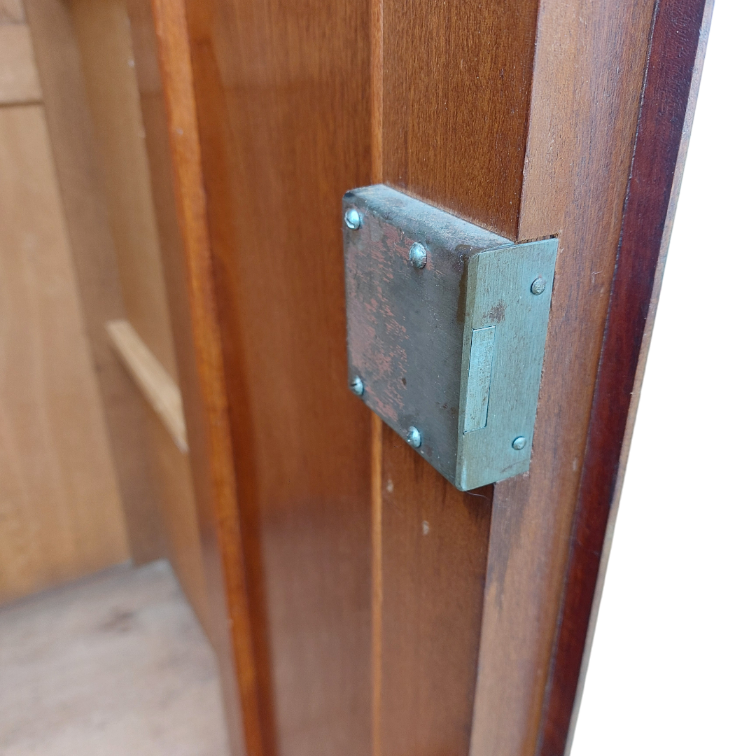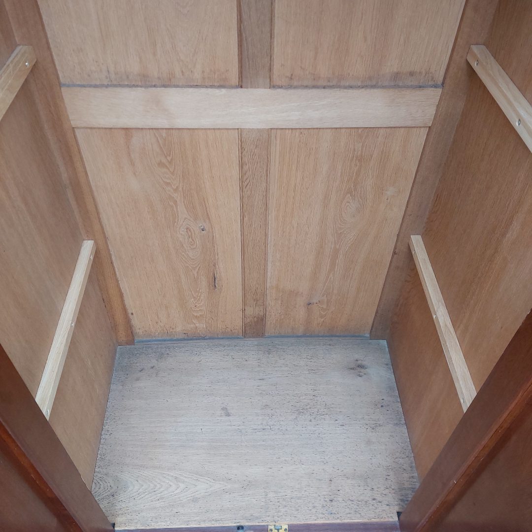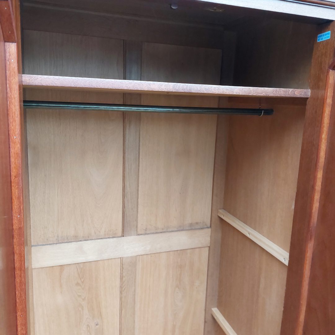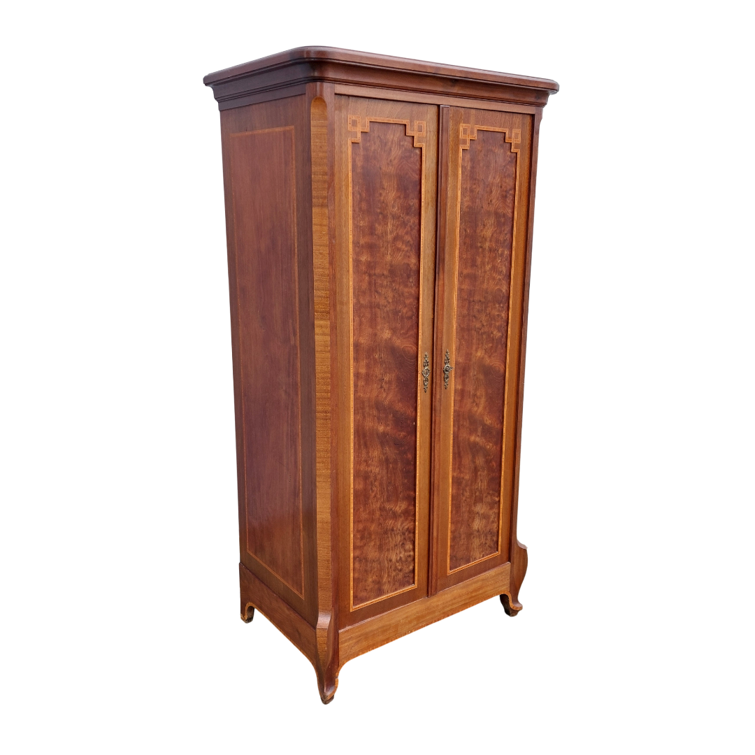 Itališka raudonmedžio spinta, artima Umbertino laikotarpiui. Durys dengtos raštuota faneruote, formos ramios, su lengvu lenkimu ties kojelėmis. Ant šono yra „Banco di Napoli“ inventoriaus plokštelė, kuri reiškia, kad ši spinta kažkada priklausė Italijos bankui ir buvo jų vidaus apstatymo dalis. Geros būklės.