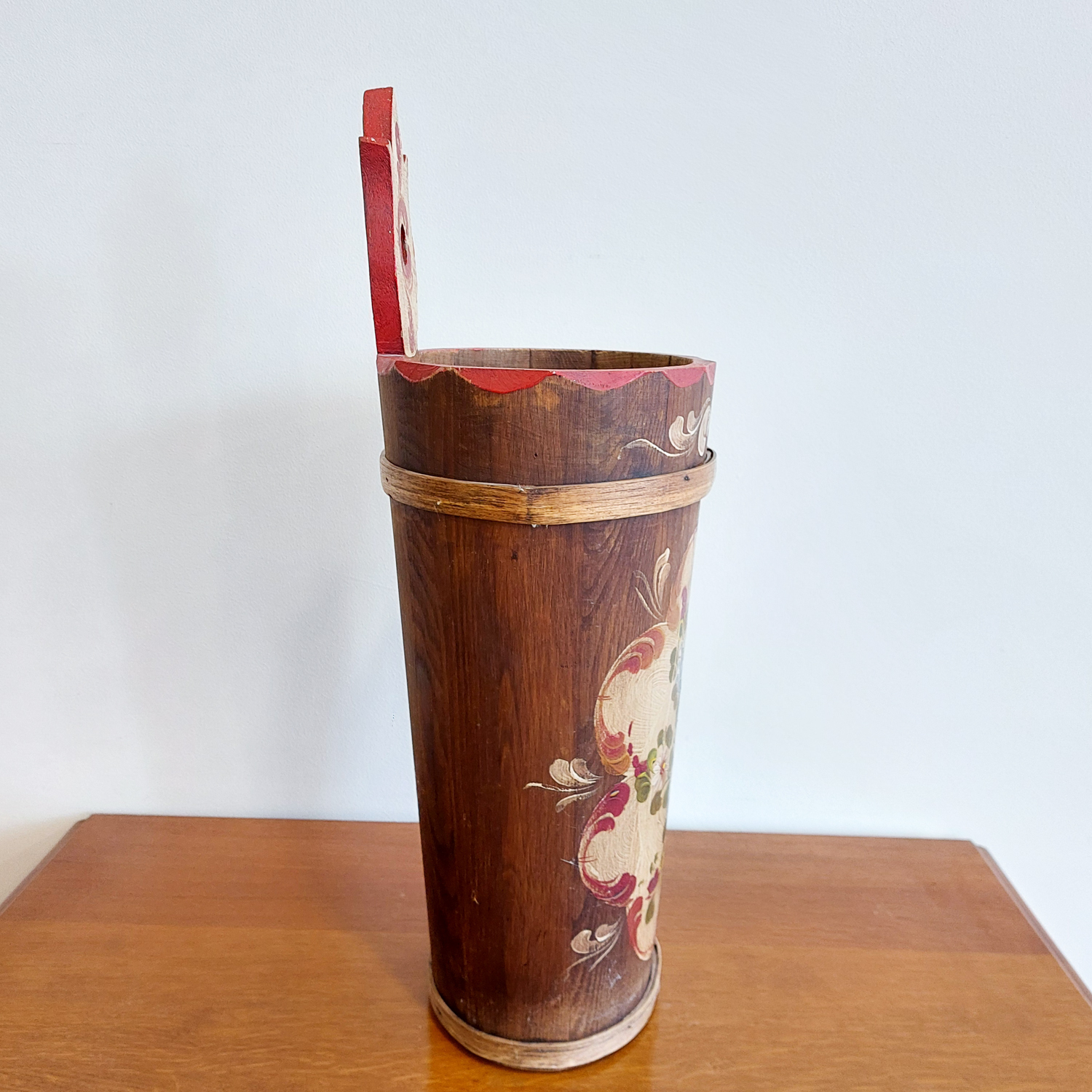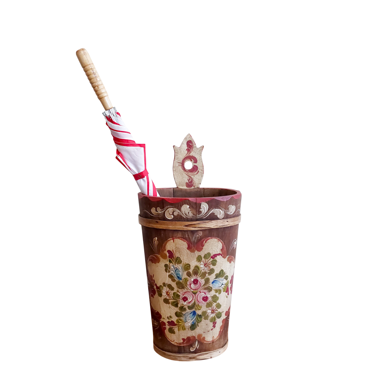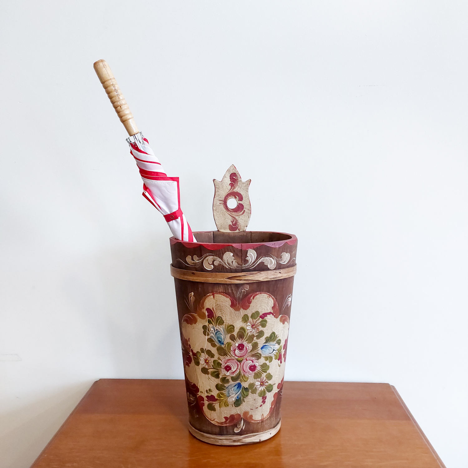 Medinė skėtinė, dekoruota rankų tapyba, spalvingais gėlių raštais, būdingais Bauernmalerei stiliui, kilusiam iš Vokietijos ir Austrijos kaimiškų vietovių.