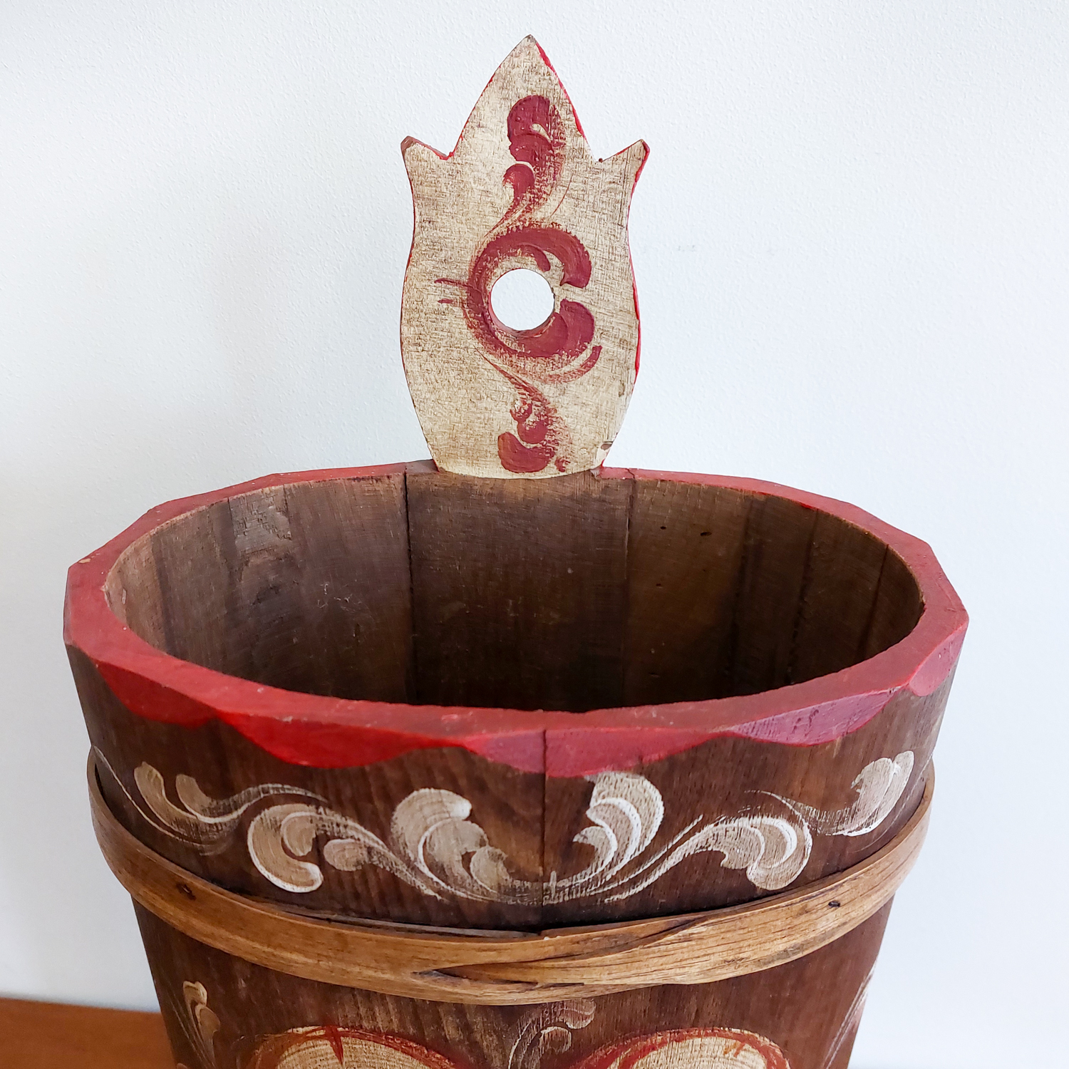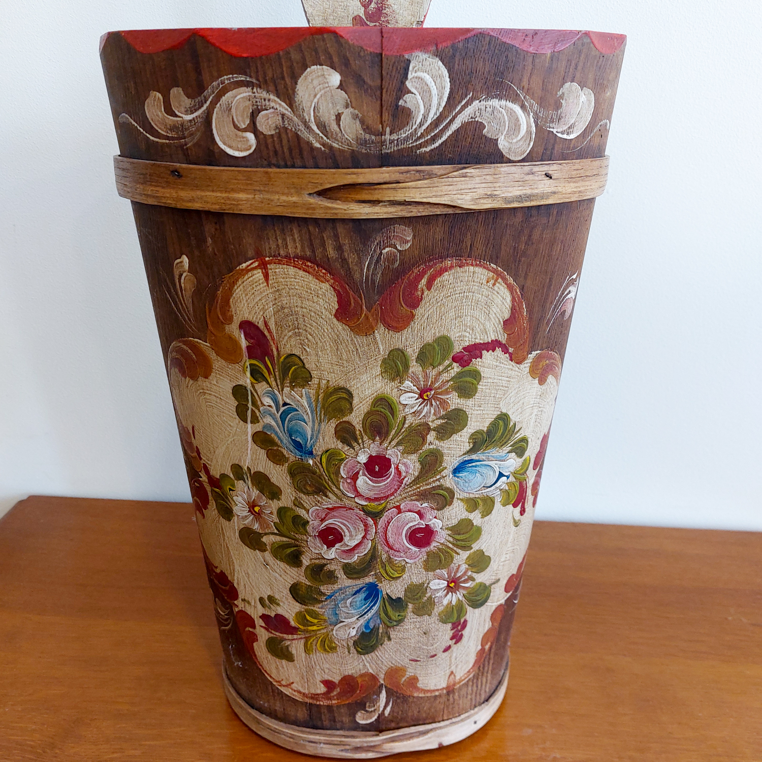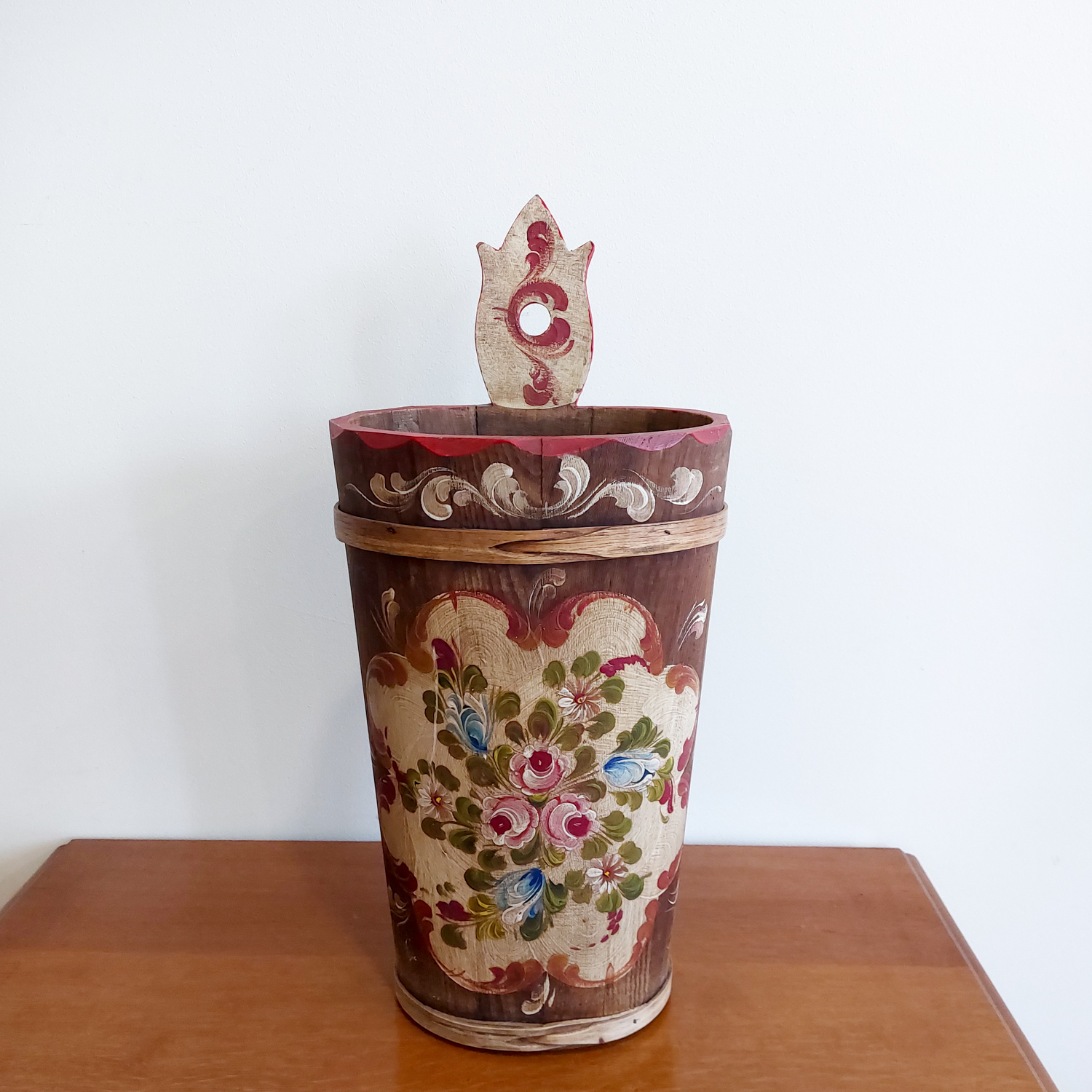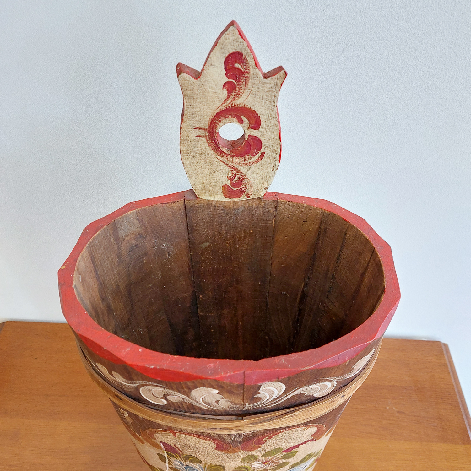 Medinė skėtinė, dekoruota rankų tapyba, spalvingais gėlių raštais, būdingais Bauernmalerei stiliui, kilusiam iš Vokietijos ir Austrijos kaimiškų vietovių.