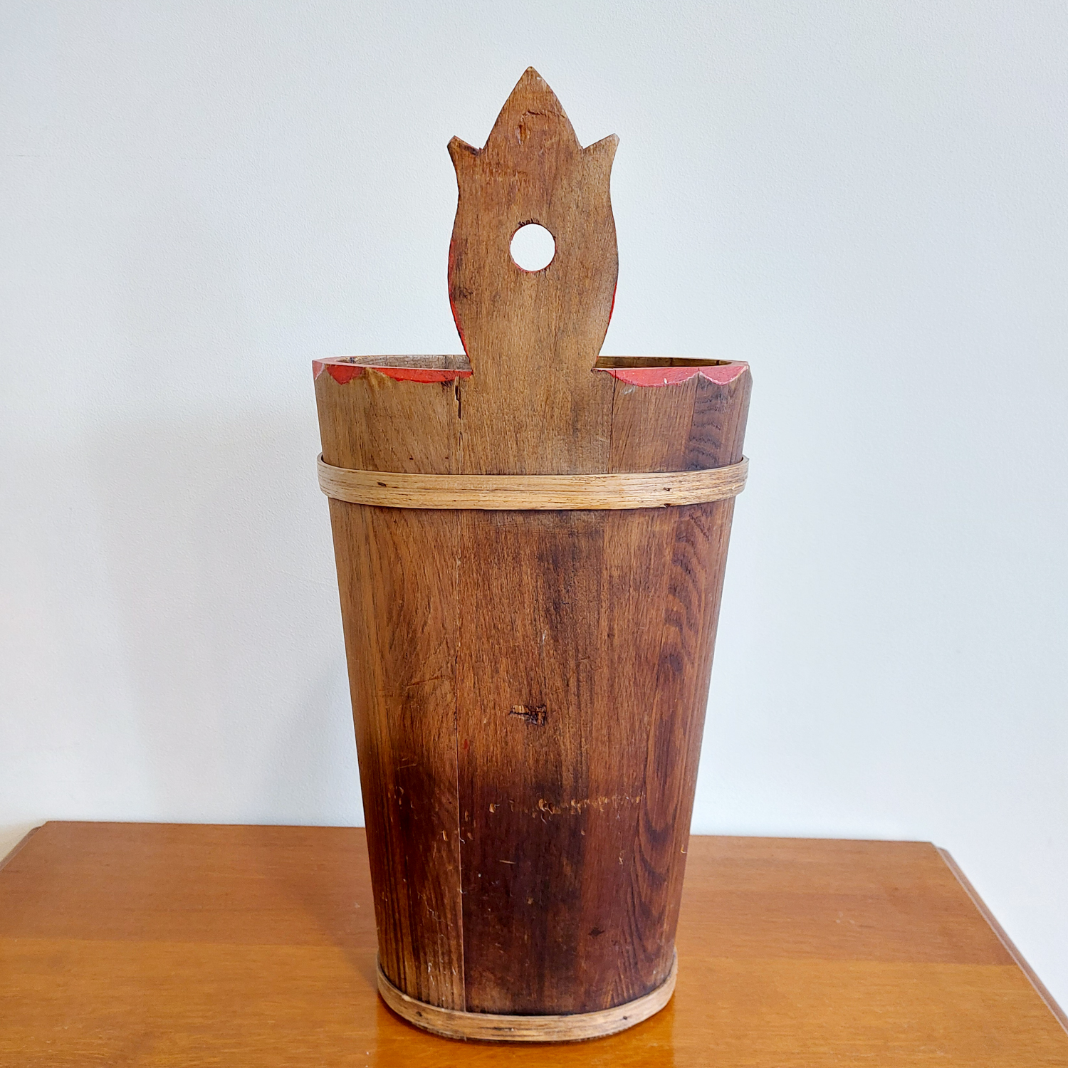 Pagaminta iš medinių lentelių, viršuje dekoratyvinė nugarėlė su skylute, kad būtų galima pakabinti.