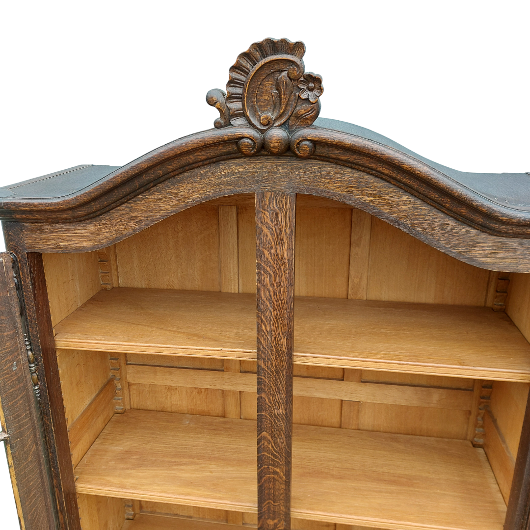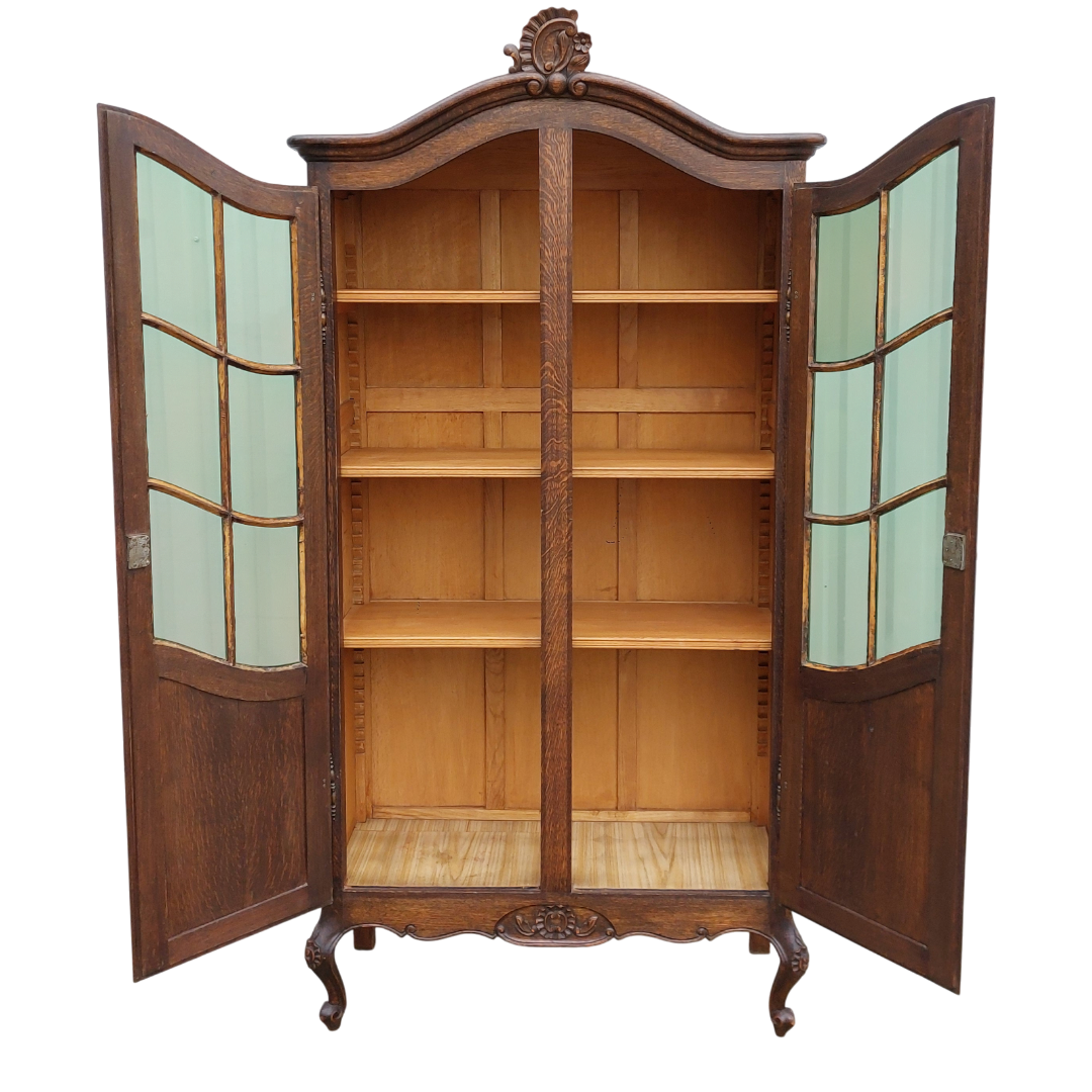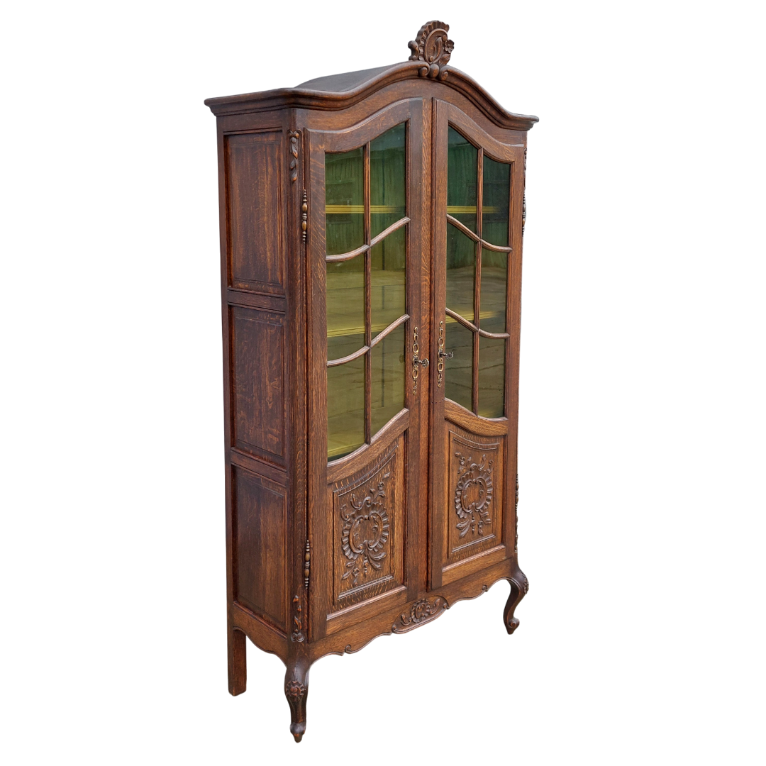 Ąžuolinė dviejų durų vitrina, sukurta pagal Liudviko XV stiliaus tradicijas. Lenktos linijos, kabriolė kojelės ir augaliniai raižiniai suteikia jai būdingą to laikotarpio formą. Viduje yra reguliuojamos lentynos, tinka indams ar knygoms. Būklė tvarkinga. Parvežta iš Prancūzijos.