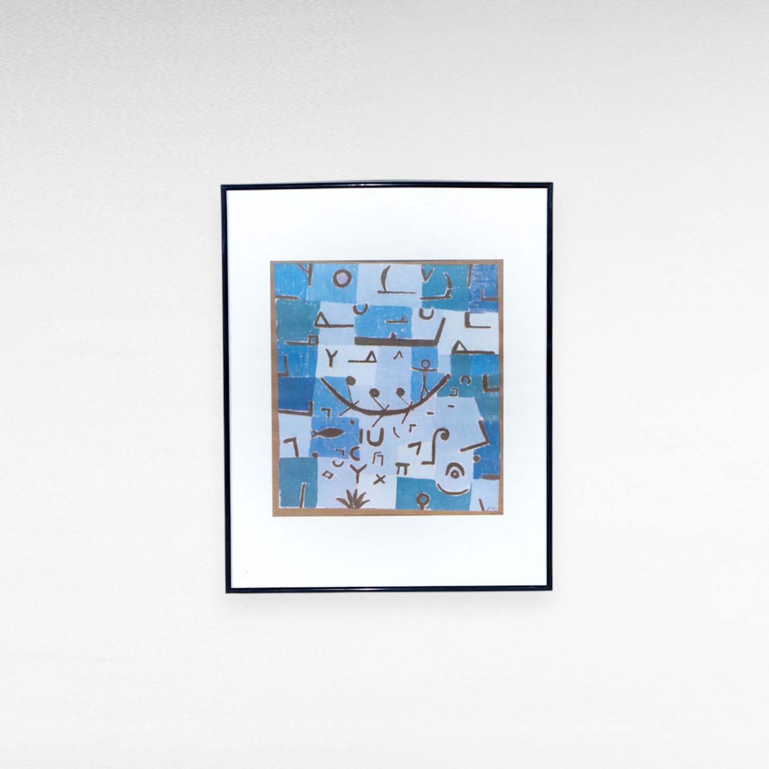 Žymaus šveicarų kilmės vokiečių menininko Paul Klee spauda, žaisminga, muzikos ir simbolių įkvėpta kompozicija mėlynų tonų fone. Oficialiai licencijuota Paul Klee darbų reprodukcija, pažymėta ADAGP 1993. Įrėminta po stiklu, su baltu pasportu ir plonu juodu rėmeliu.