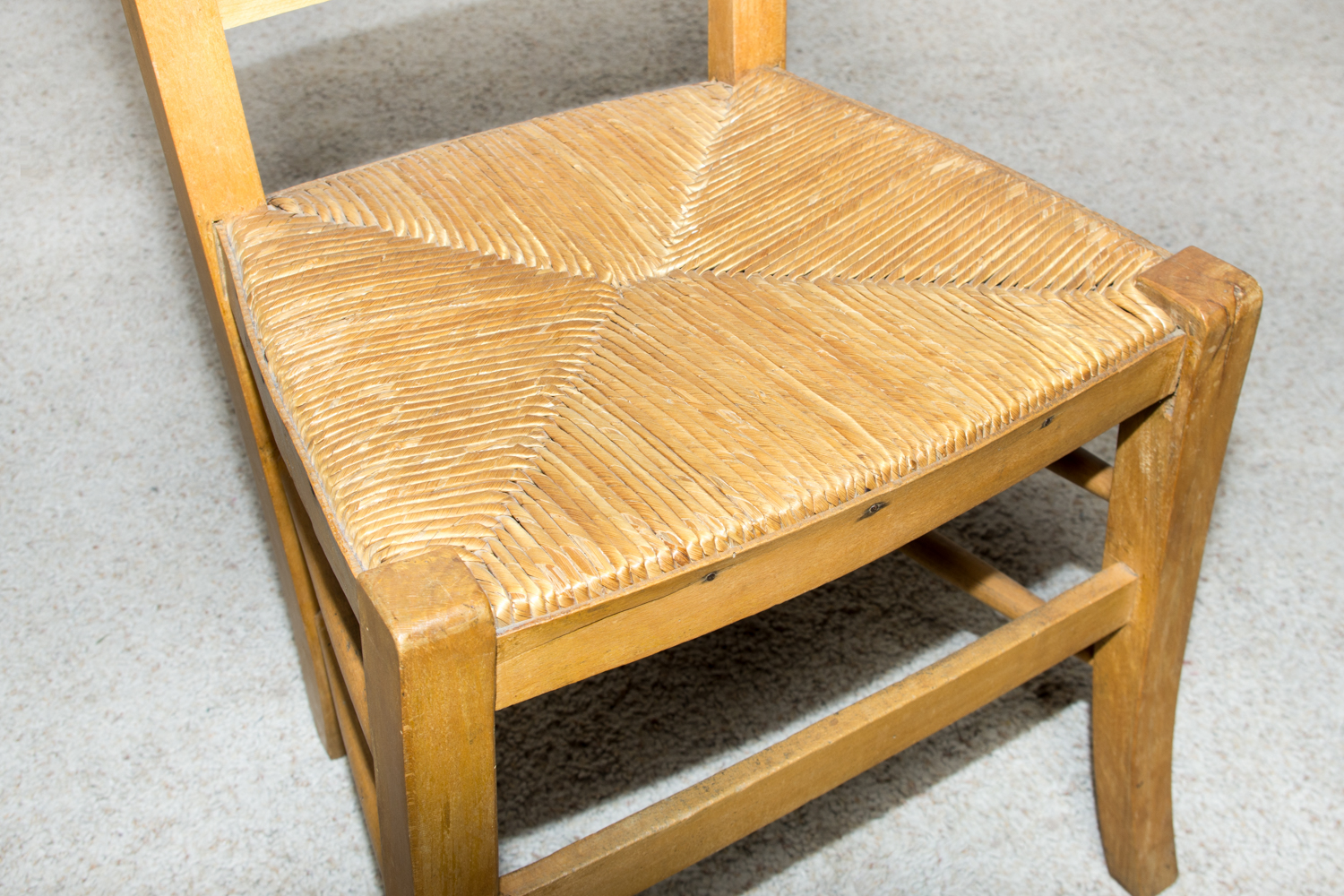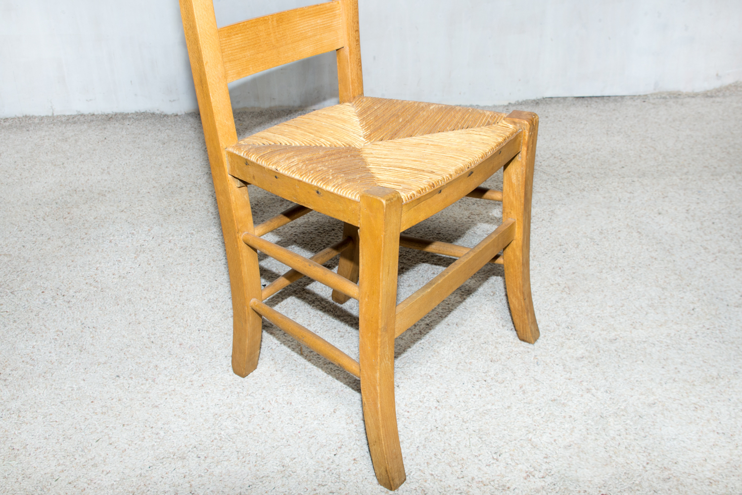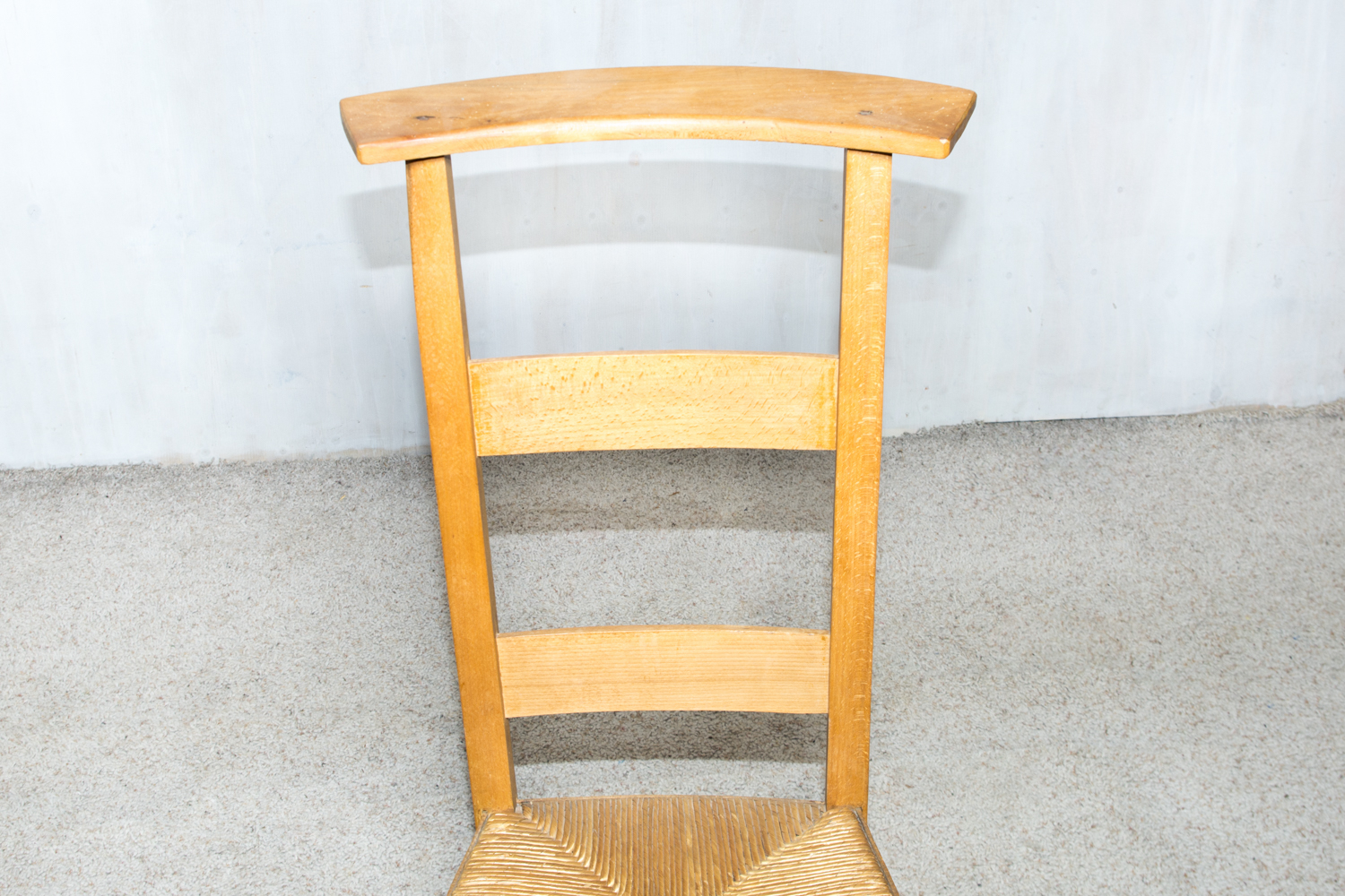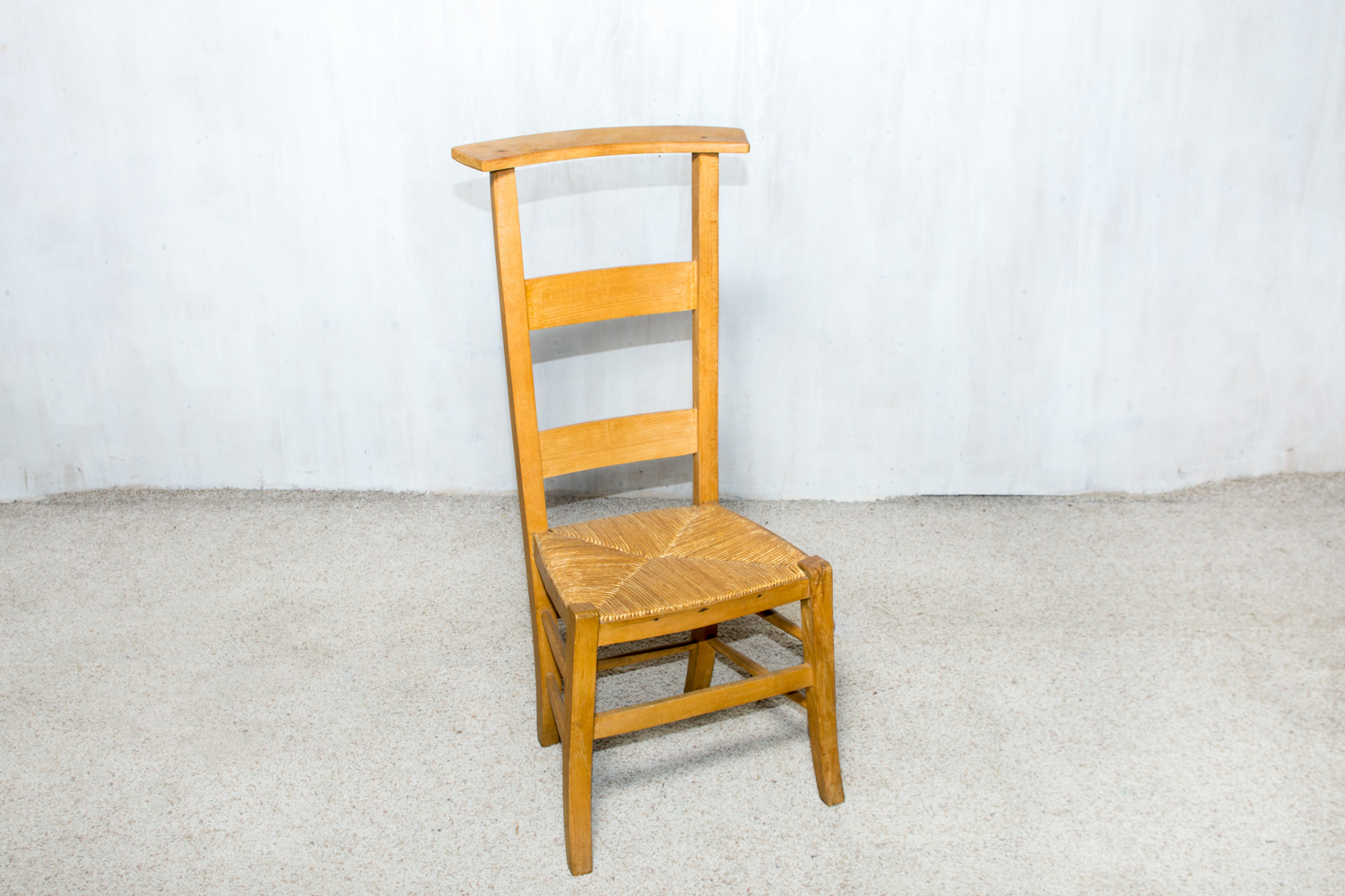 Prancūziška maldos kėdė su aukštu mediniu atlošu ir pinta sėdyne. Rėmas pagamintas iš ąžuolo, konstrukcija tvirta ir stabili. Sėdynė pinta iš natūralių šiaudų. Kėdė naudota bažnyčiose ar namų koplyčiose asmeninei maldai. Tinka autentiškam interjerui arba pagal paskirtį.
