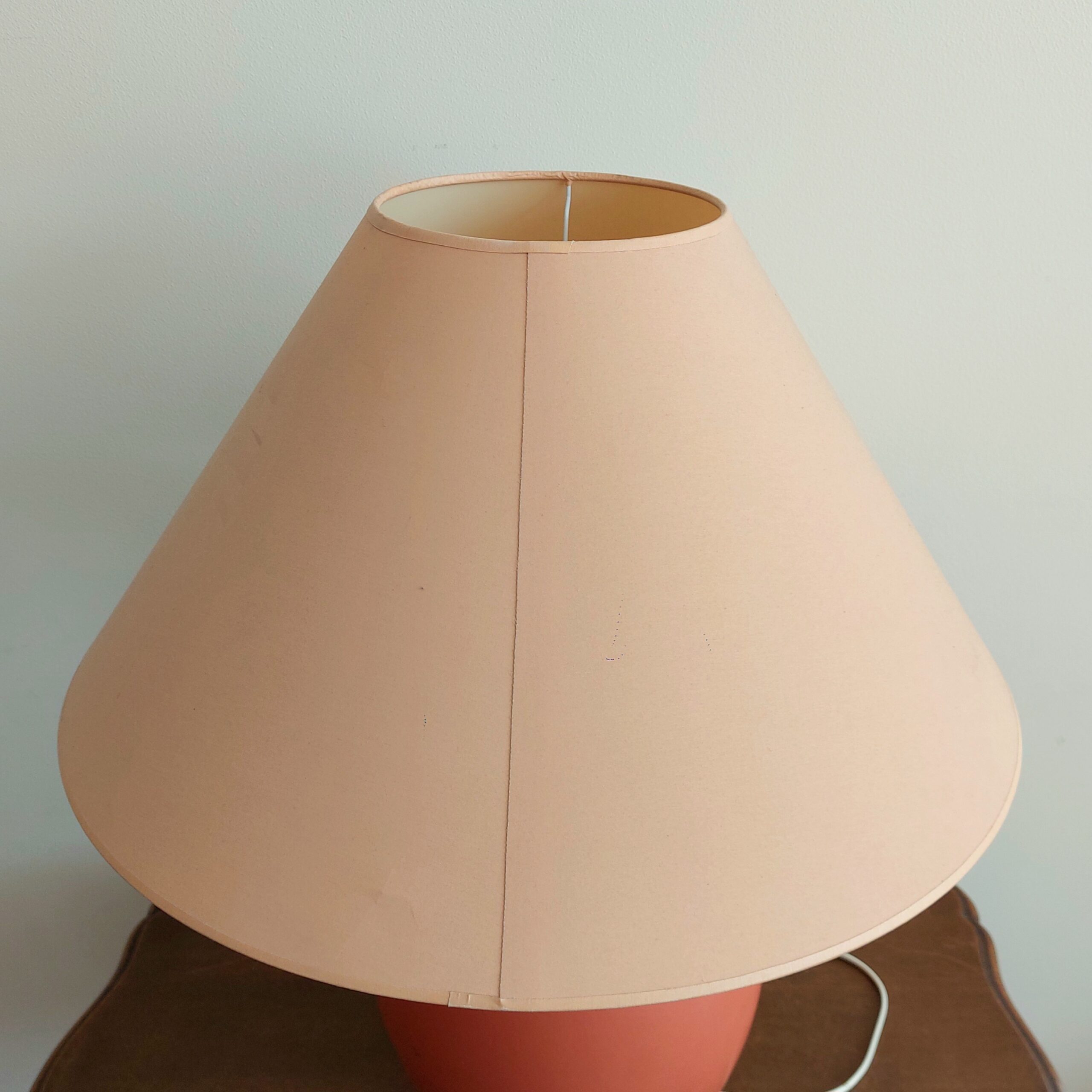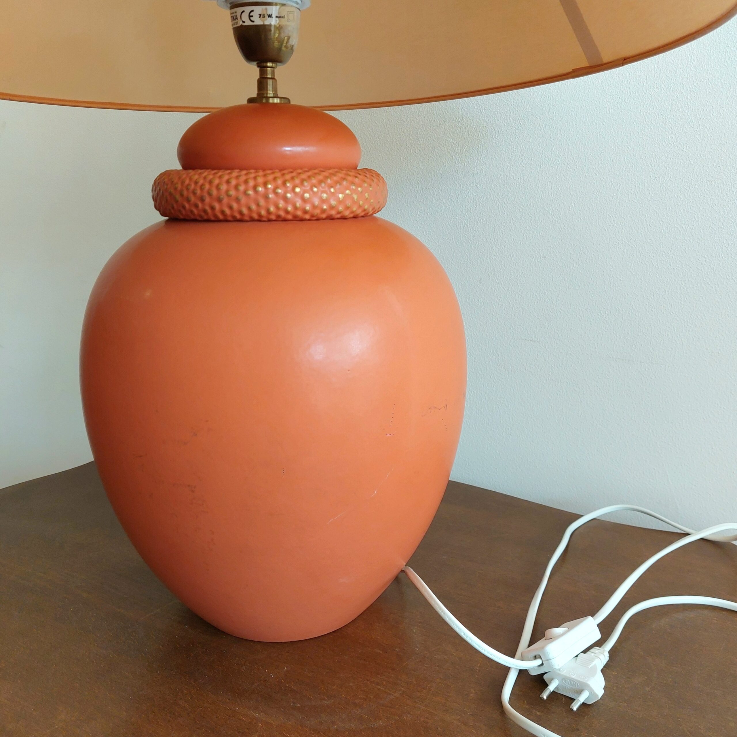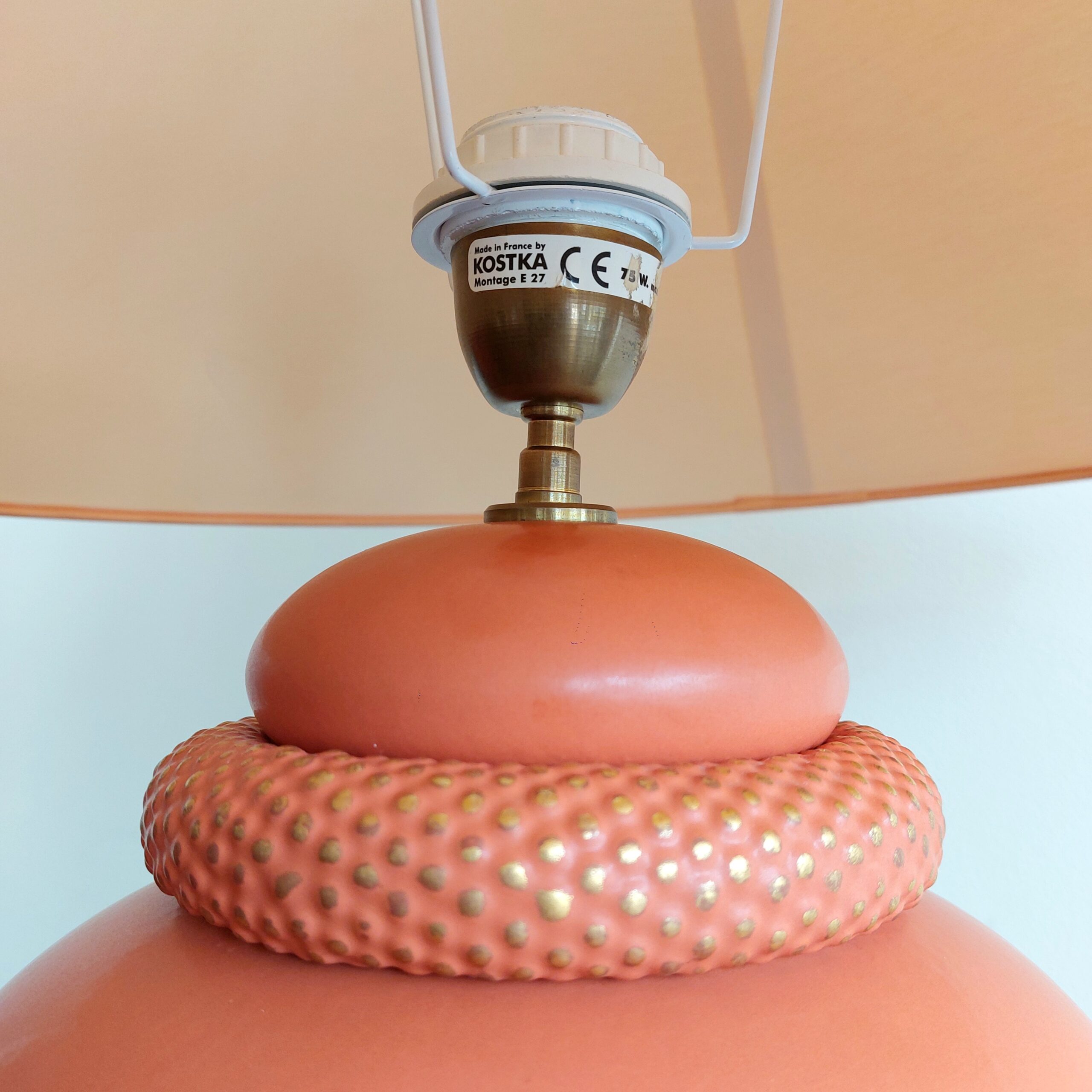 Prancūziška stalinė lempa. Keramikinis stovas šiltos oranžinės spalvos, klasikinės formos kūginis gaubtas. Prancūzų gamintojas KOSTKA, pagaminta apie 1985–1995 m., modelis Galluchat Lampe PM. Veikianti. Gaubtas tvarkingas, su lengvomis dėvėjimo žymėmis. Keramikinis stovas turi smulkių pabraižimų vienoje pusėje.