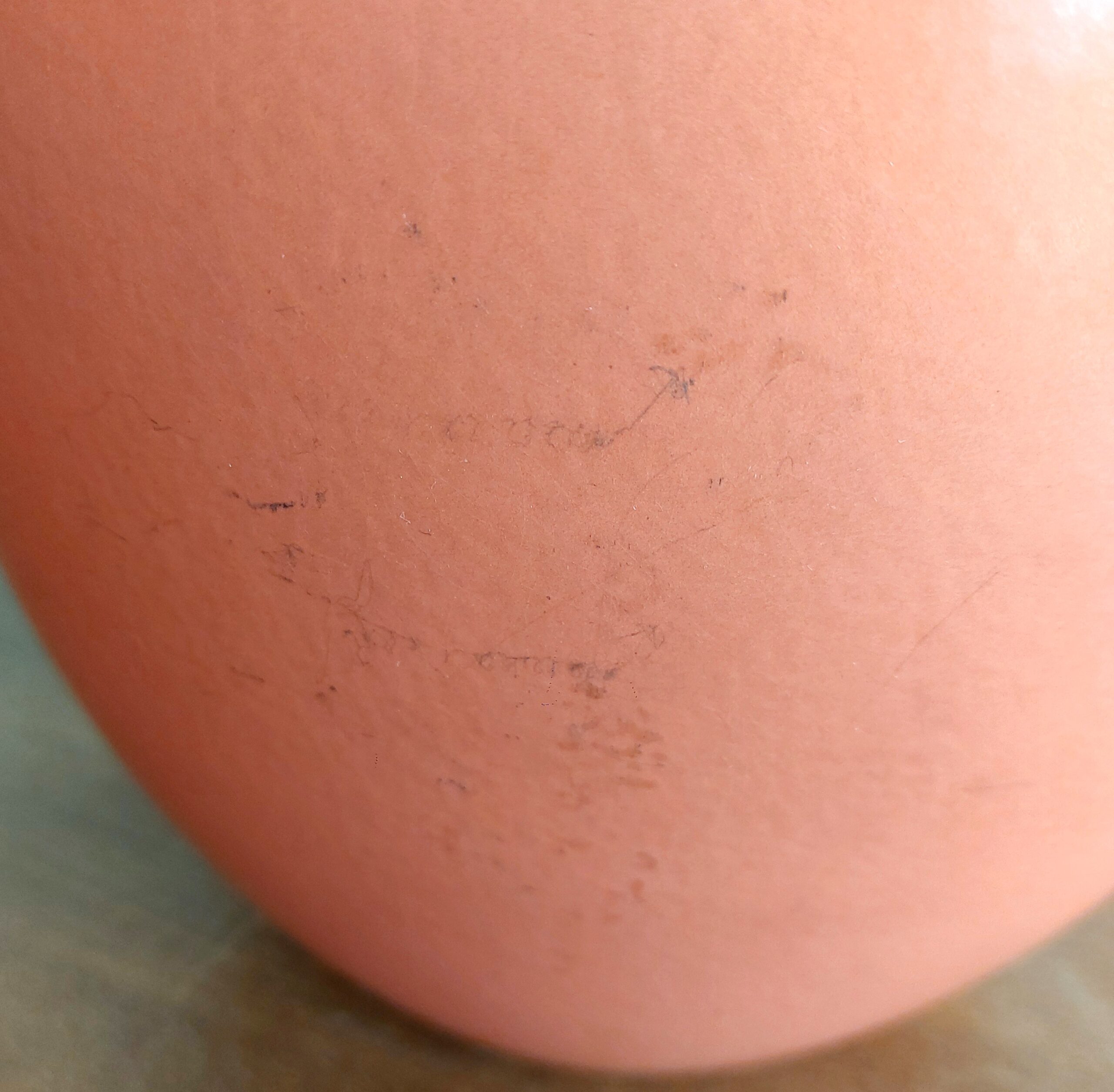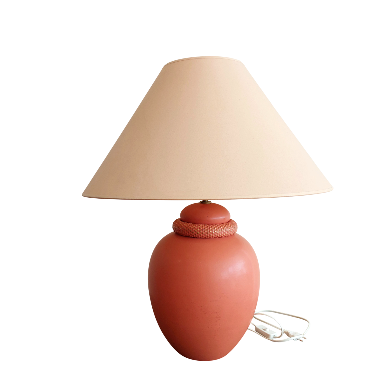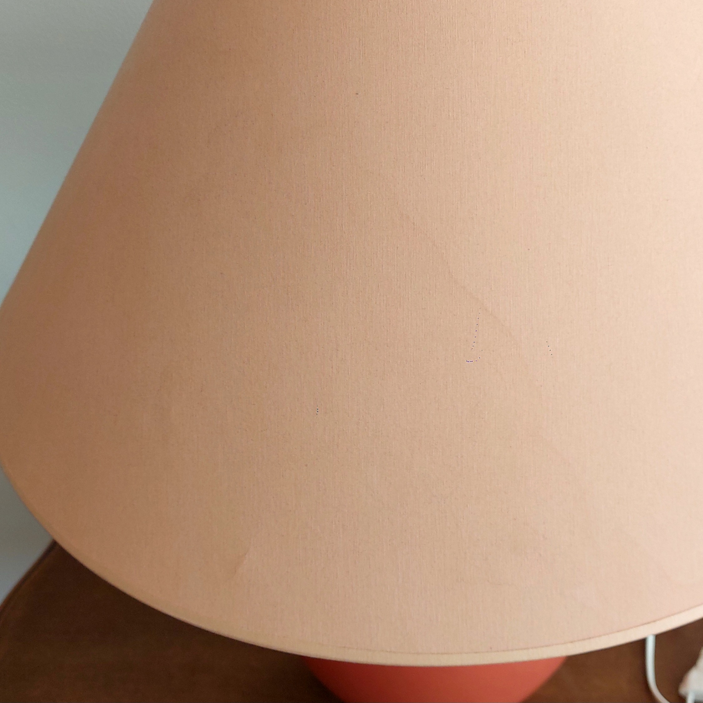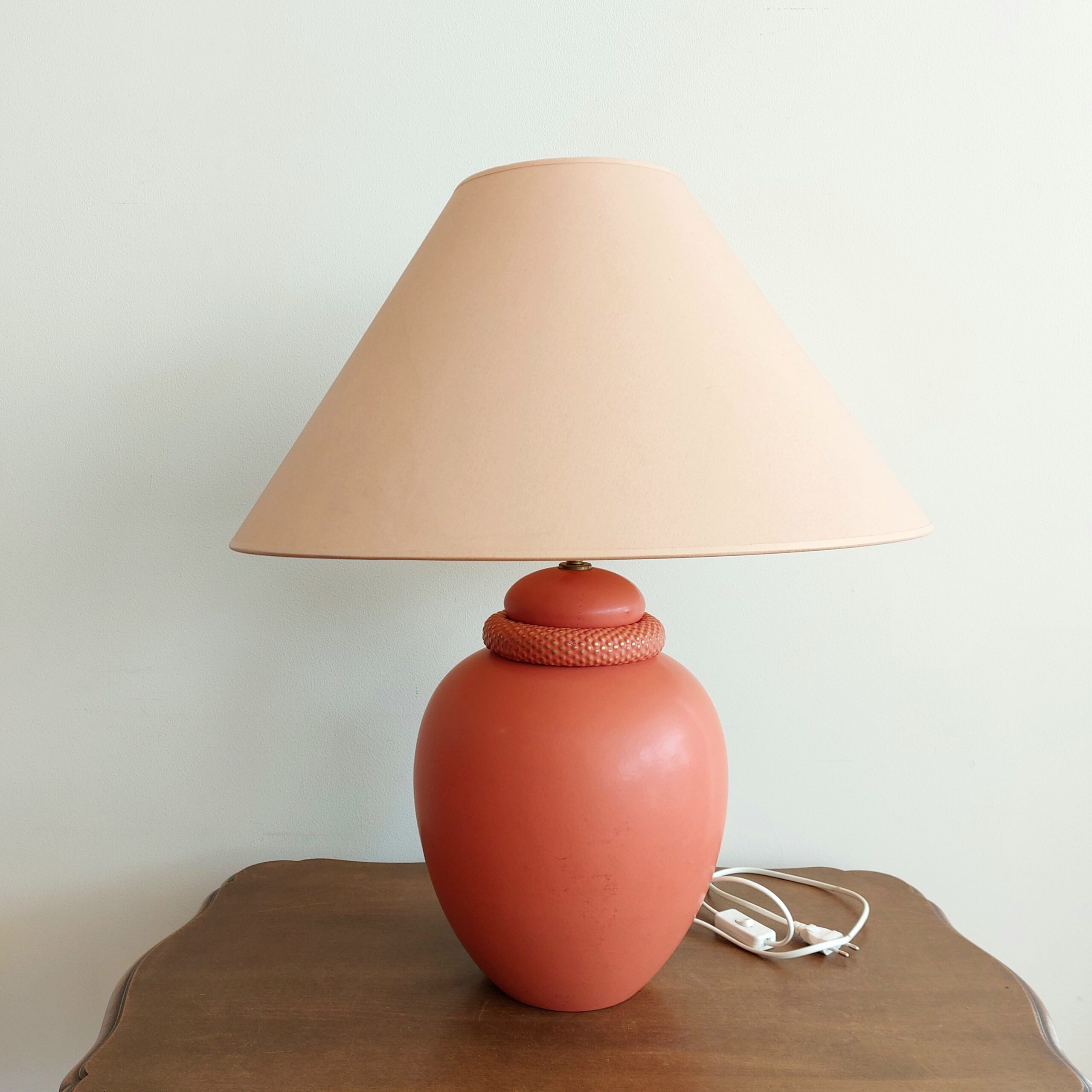 Prancūziška stalinė lempa. Keramikinis stovas šiltos oranžinės spalvos, klasikinės formos kūginis gaubtas. Prancūzų gamintojas KOSTKA, pagaminta apie 1985–1995 m., modelis Galluchat Lampe PM. Veikianti. Gaubtas tvarkingas, su lengvomis dėvėjimo žymėmis. Keramikinis stovas turi smulkių pabraižimų vienoje pusėje.