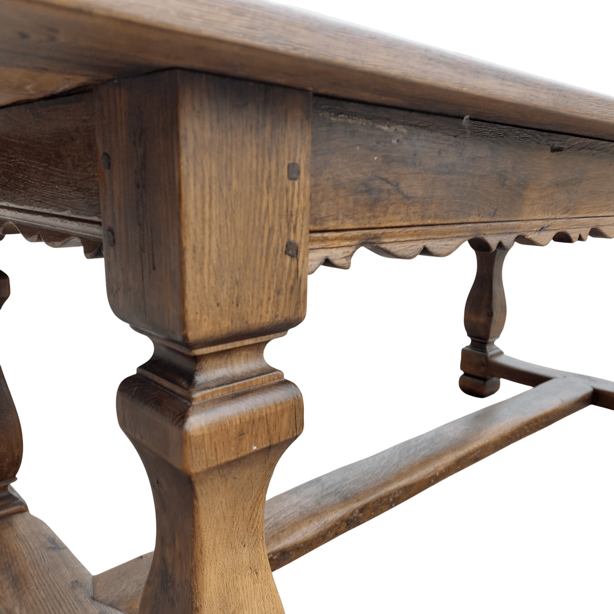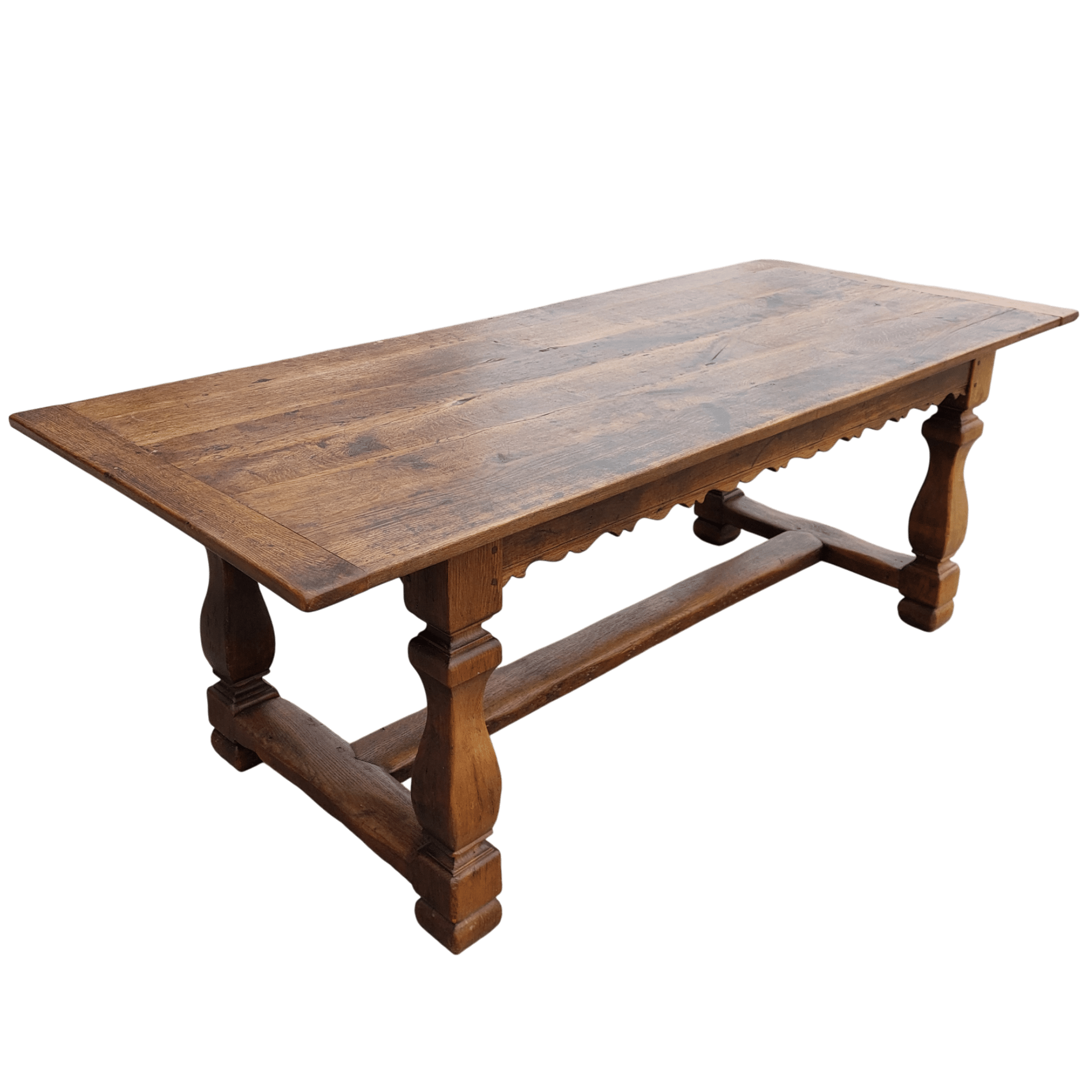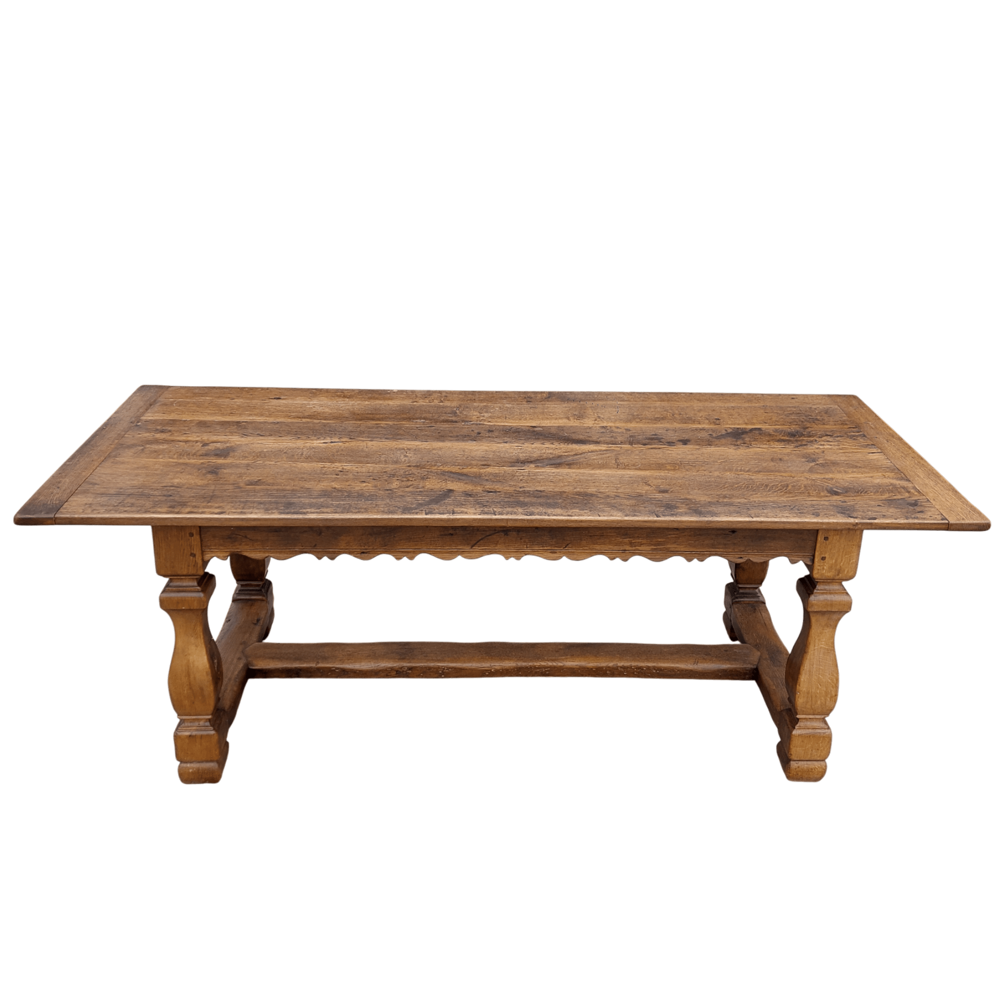 Prancūziškas ąžuolinis valgomojo stalas. Stalas iš masyvaus ąžuolo, tikras prancūziško kaimo klasikos atspindys. Stalviršis sudėtas iš plačių masyvo lentų, su matomomis jungtimis ir natūralia senėjimo patina. Kojos balusterinės formos, sujungtos centrine skersine sija. Stabilus, sunkus, laikys dar ilgai. Nesiardo. Konstrukcija sujungta mediniais kaiščiais. Parvežta iš Prancūzijos