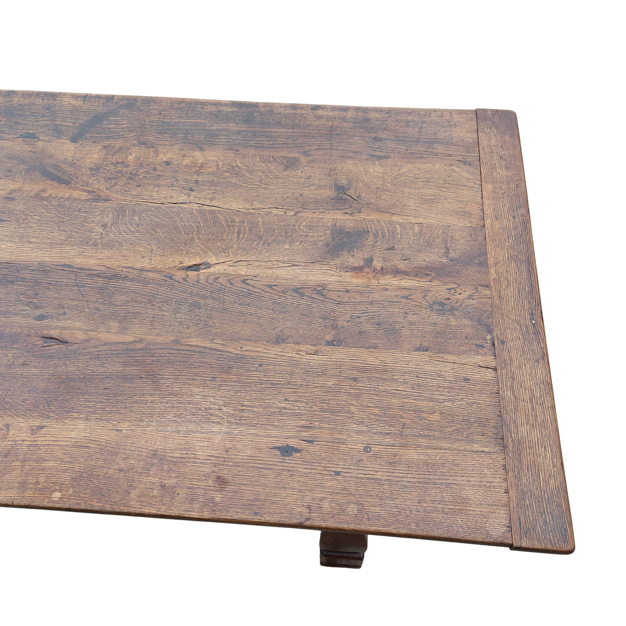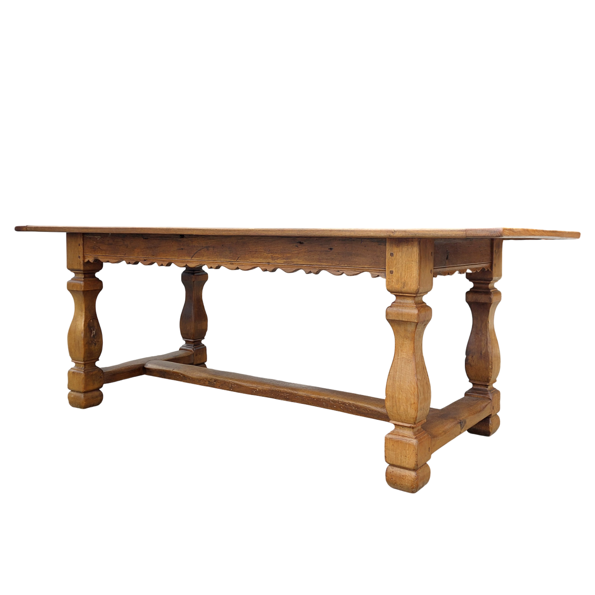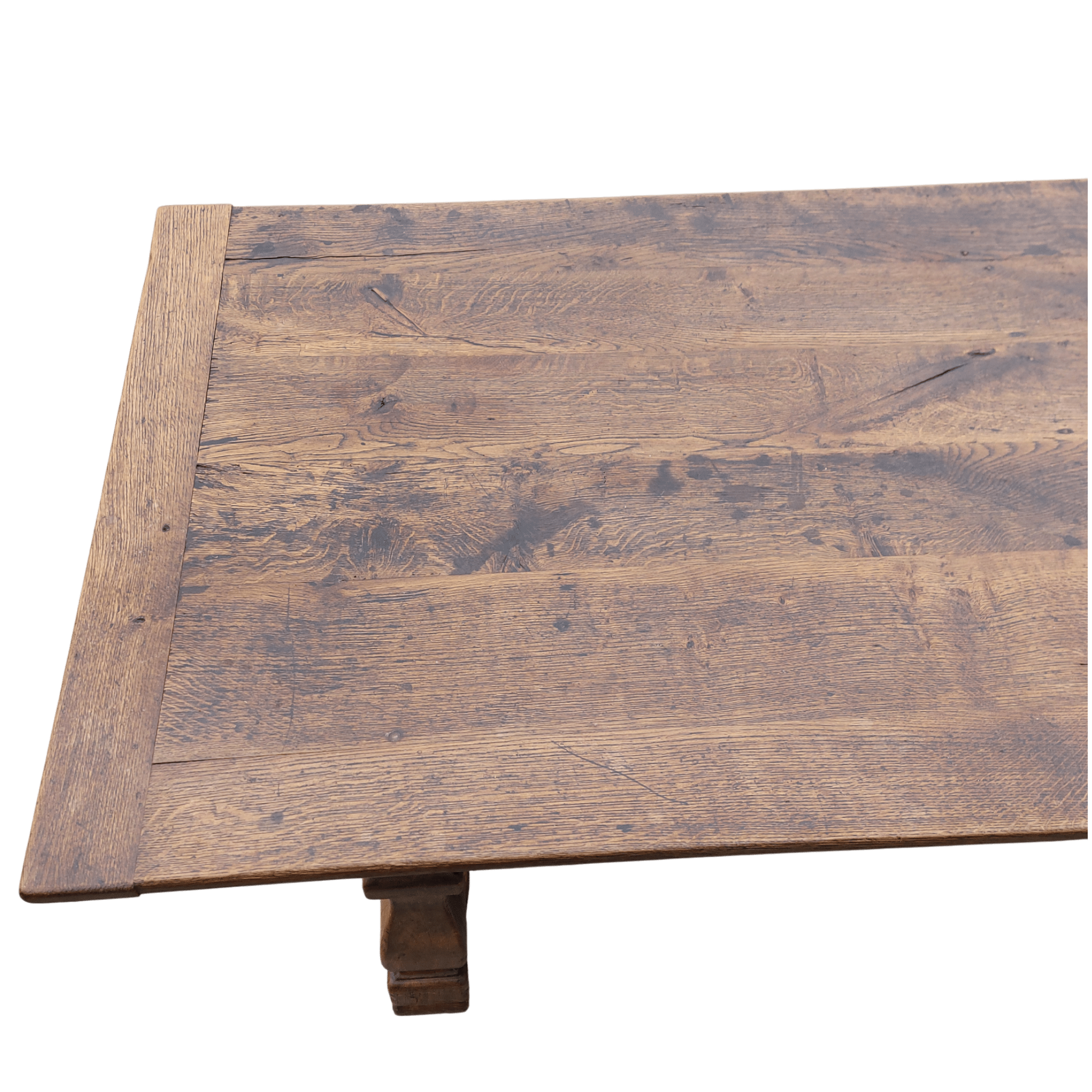 Prancūziškas ąžuolinis valgomojo stalas. Stalas iš masyvaus ąžuolo, tikras prancūziško kaimo klasikos atspindys. Stalviršis sudėtas iš plačių masyvo lentų, su matomomis jungtimis ir natūralia senėjimo patina. Kojos balusterinės formos, sujungtos centrine skersine sija. Stabilus, sunkus, laikys dar ilgai. Nesiardo. Konstrukcija sujungta mediniais kaiščiais. Parvežta iš Prancūzijos