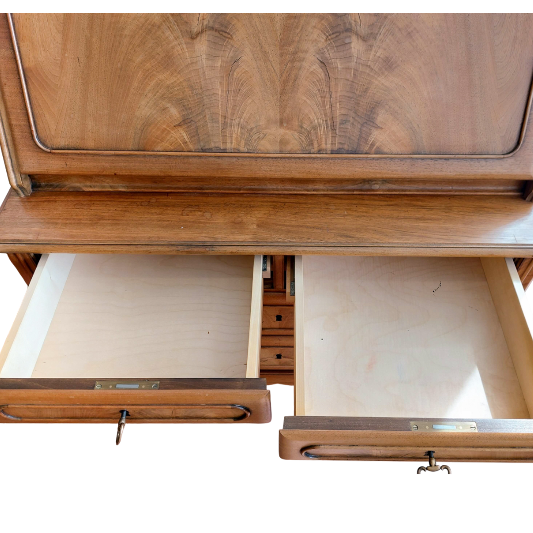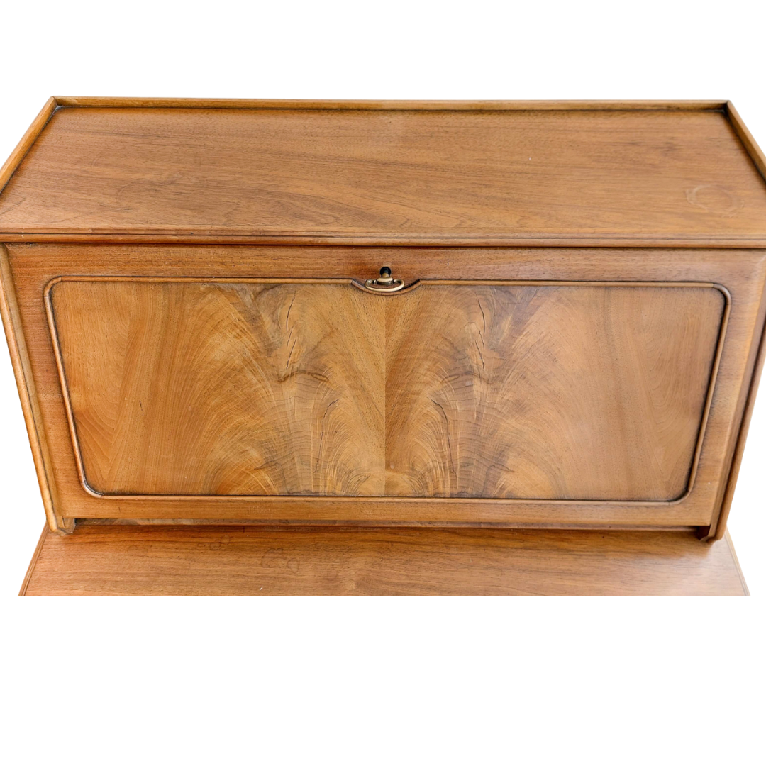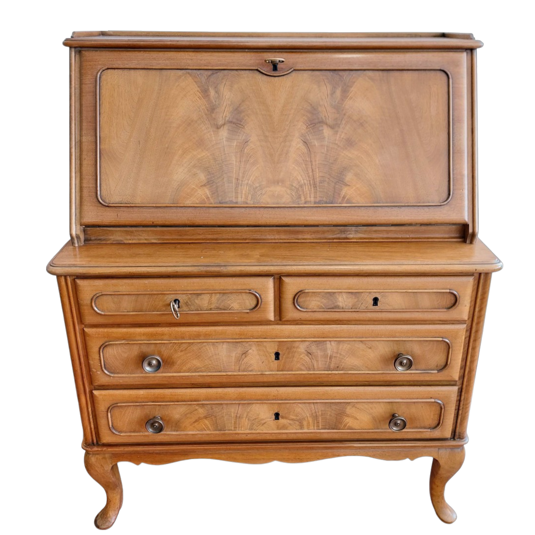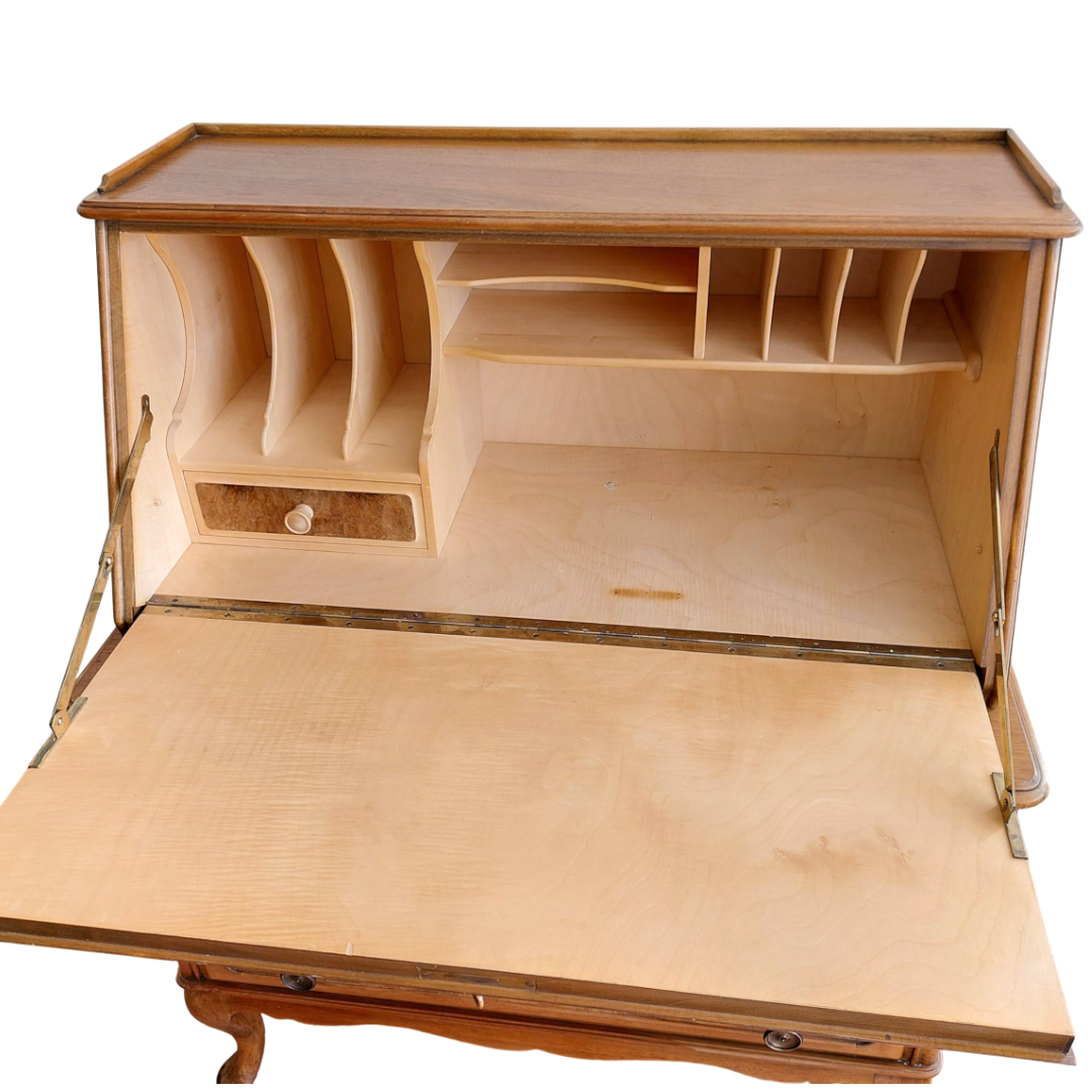 Prancūziško stiliaus sekreteras, tikėtina pagamintas XX a. viduryje. Kompaktiškas, bet talpus baldas, tinkantis tiek rašymui, tiek smulkmenų laikymui. Apatinėje dalyje trys stalčiai, viršutinė dalis atidaromas rašymo stalviršis su skyreliais. Matomas šoninis paviršiaus defektas. Tvirtas ir stabilus baldas.
