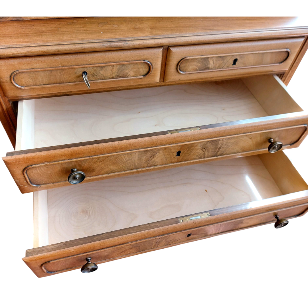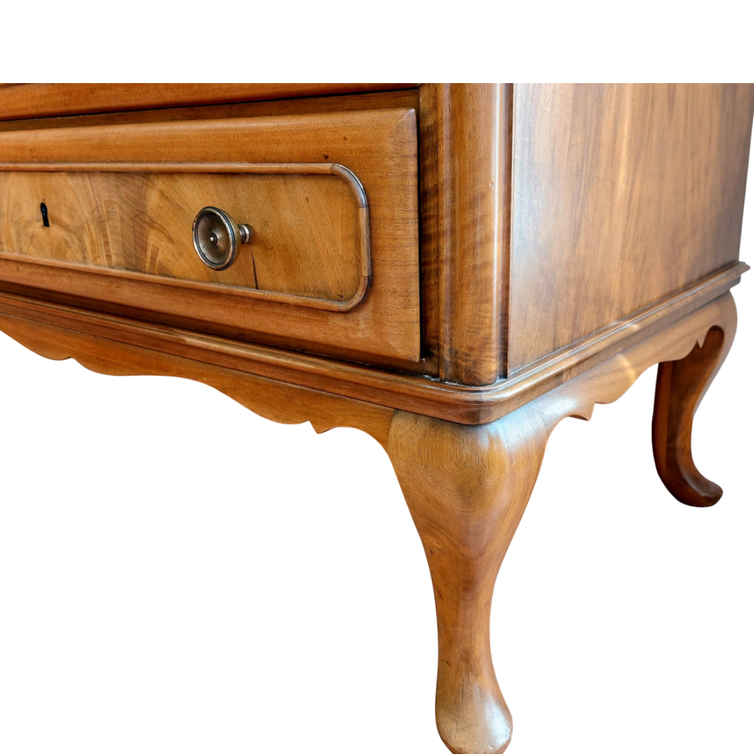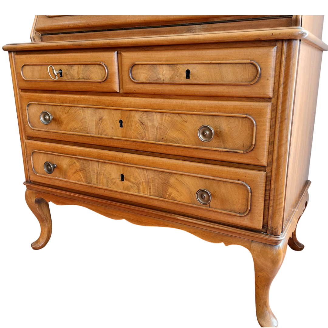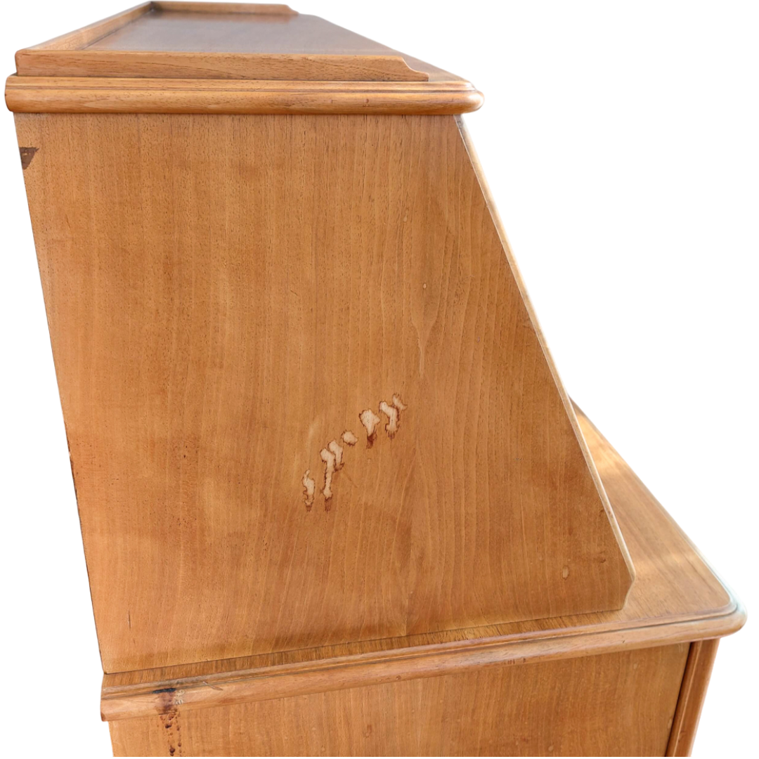 Prancūziško stiliaus sekreteras, tikėtina pagamintas XX a. viduryje. Kompaktiškas, bet talpus baldas, tinkantis tiek rašymui, tiek smulkmenų laikymui. Apatinėje dalyje trys stalčiai, viršutinė dalis atidaromas rašymo stalviršis su skyreliais. Matomas šoninis paviršiaus defektas. Tvirtas ir stabilus baldas.