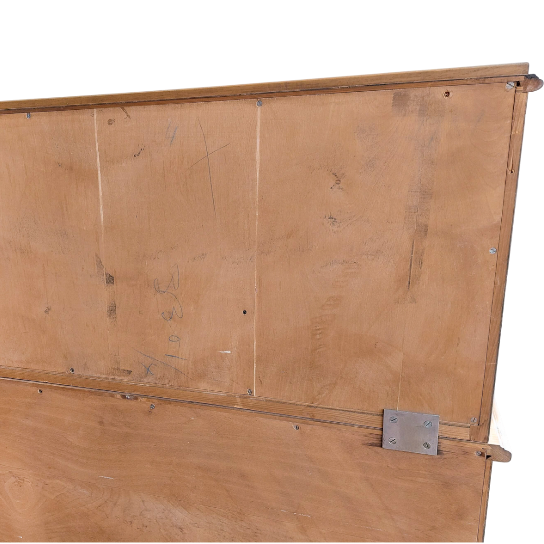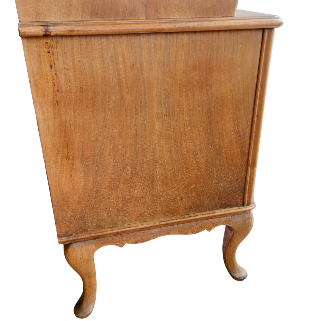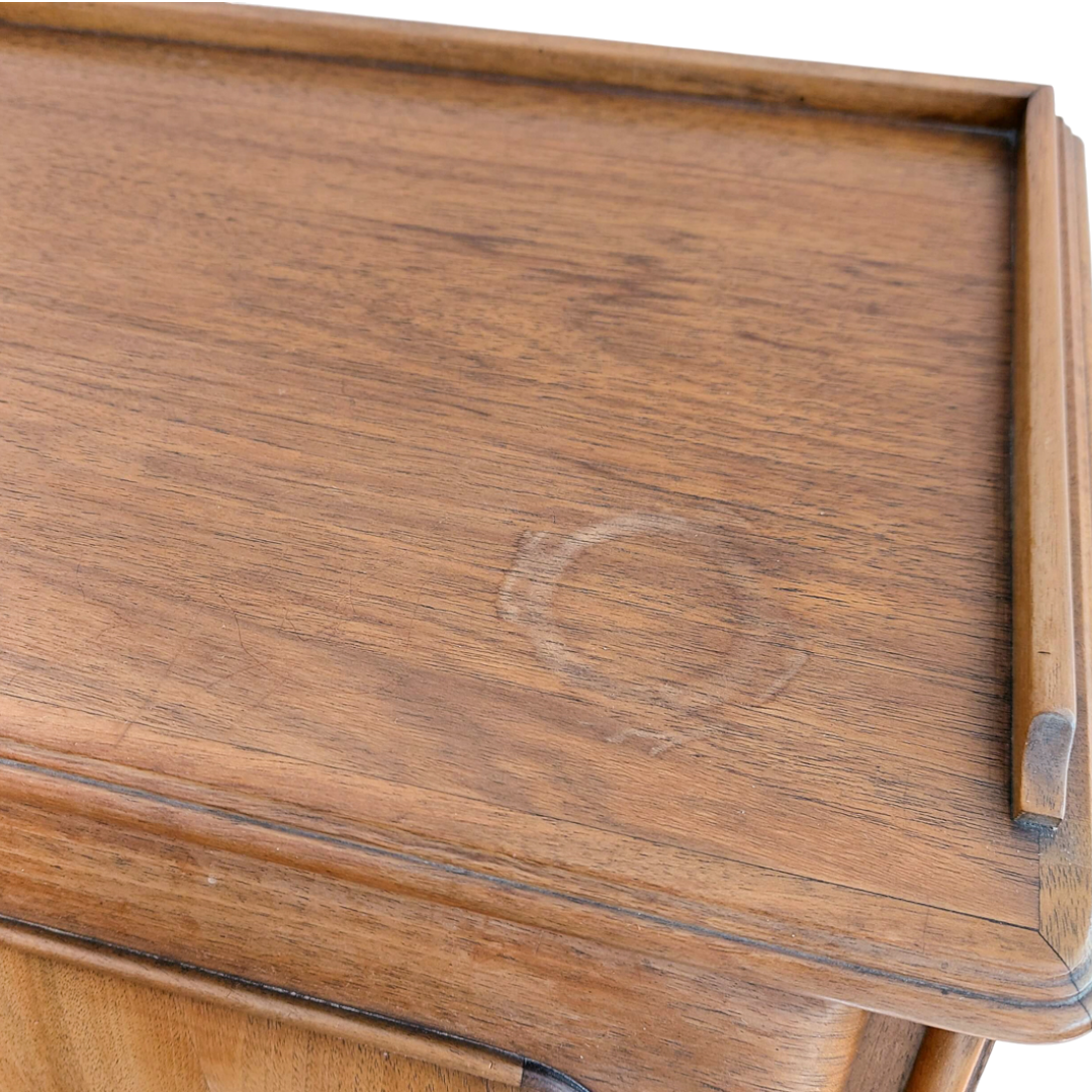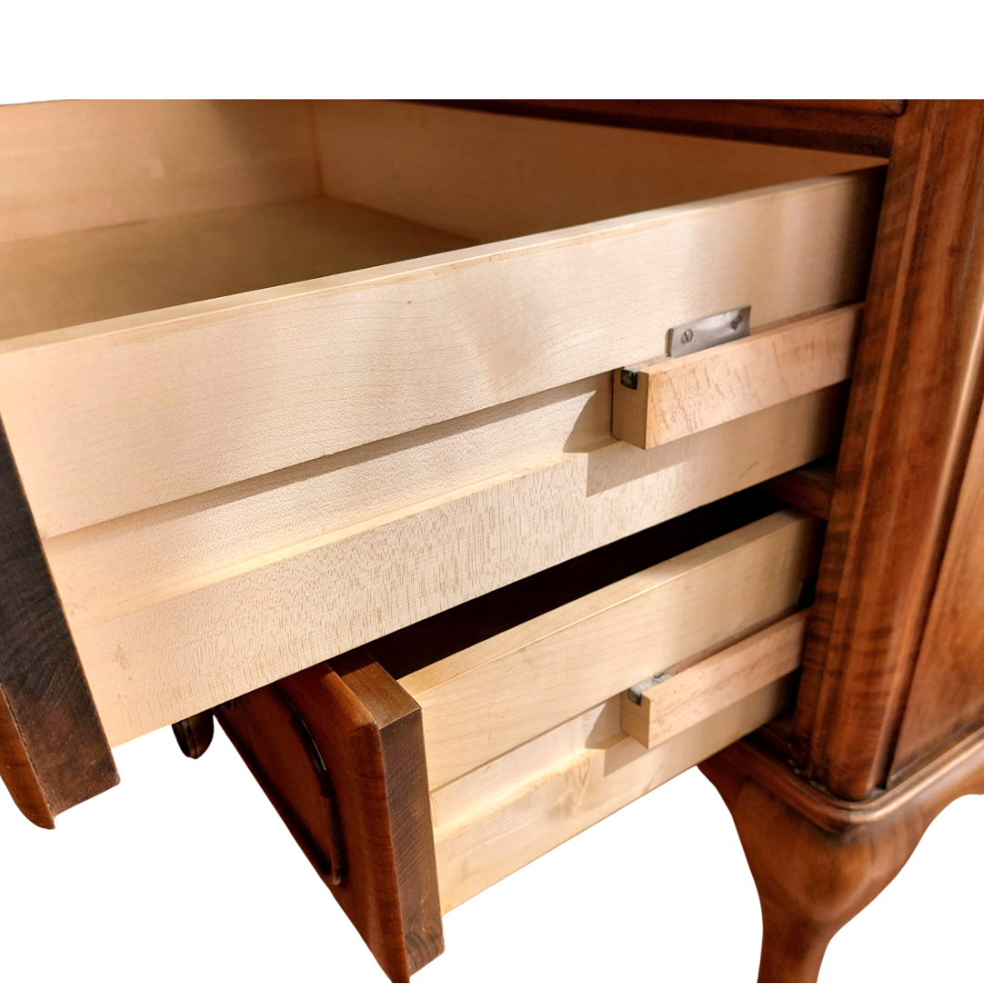 Prancūziško stiliaus sekreteras, tikėtina pagamintas XX a. viduryje. Kompaktiškas, bet talpus baldas, tinkantis tiek rašymui, tiek smulkmenų laikymui. Apatinėje dalyje trys stalčiai, viršutinė dalis atidaromas rašymo stalviršis su skyreliais. Matomas šoninis paviršiaus defektas. Tvirtas ir stabilus baldas.