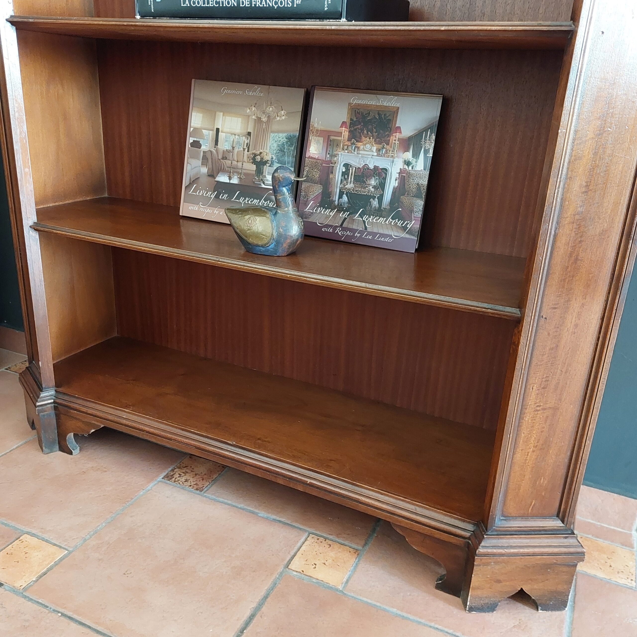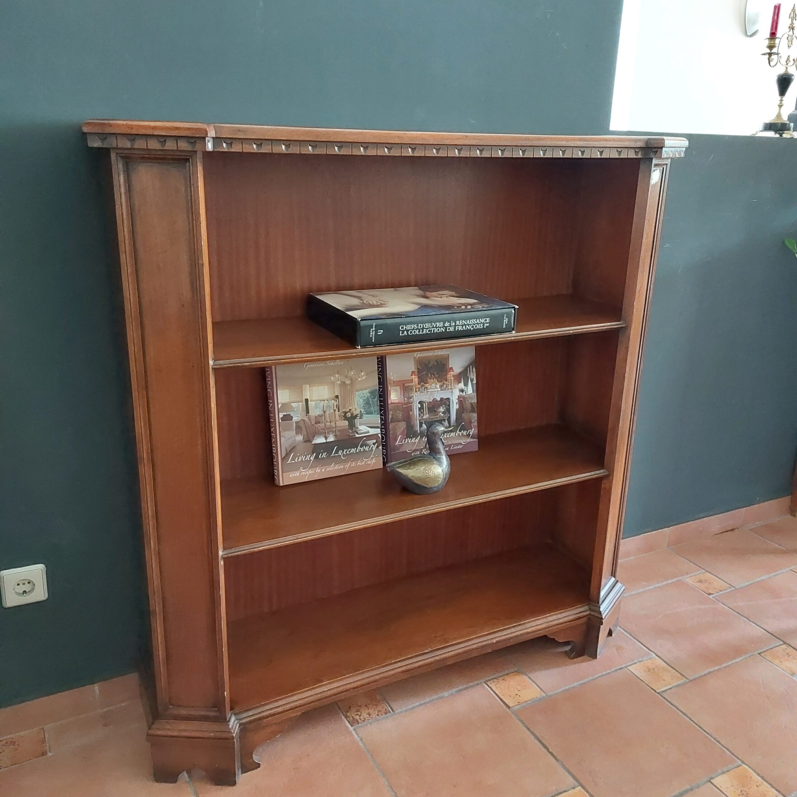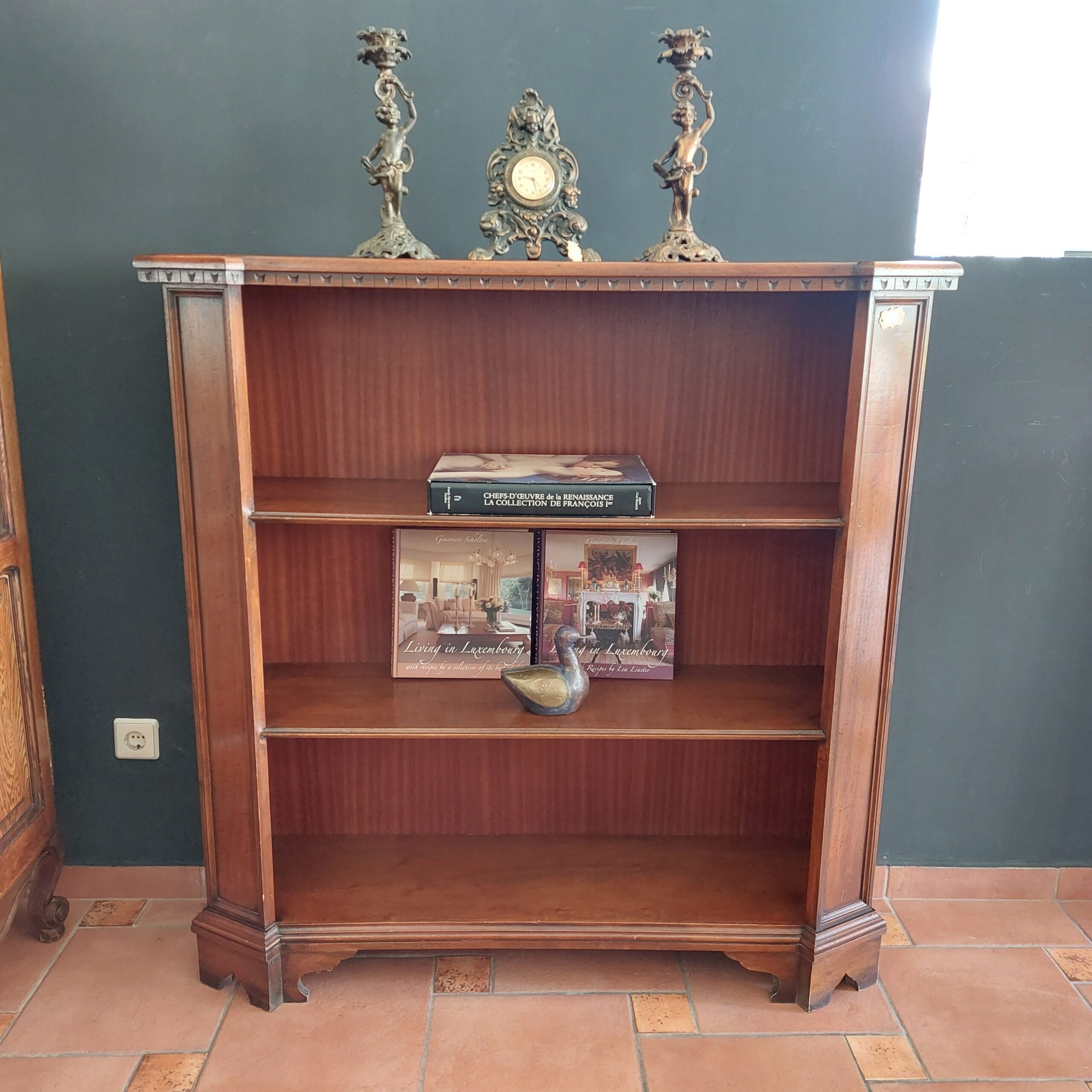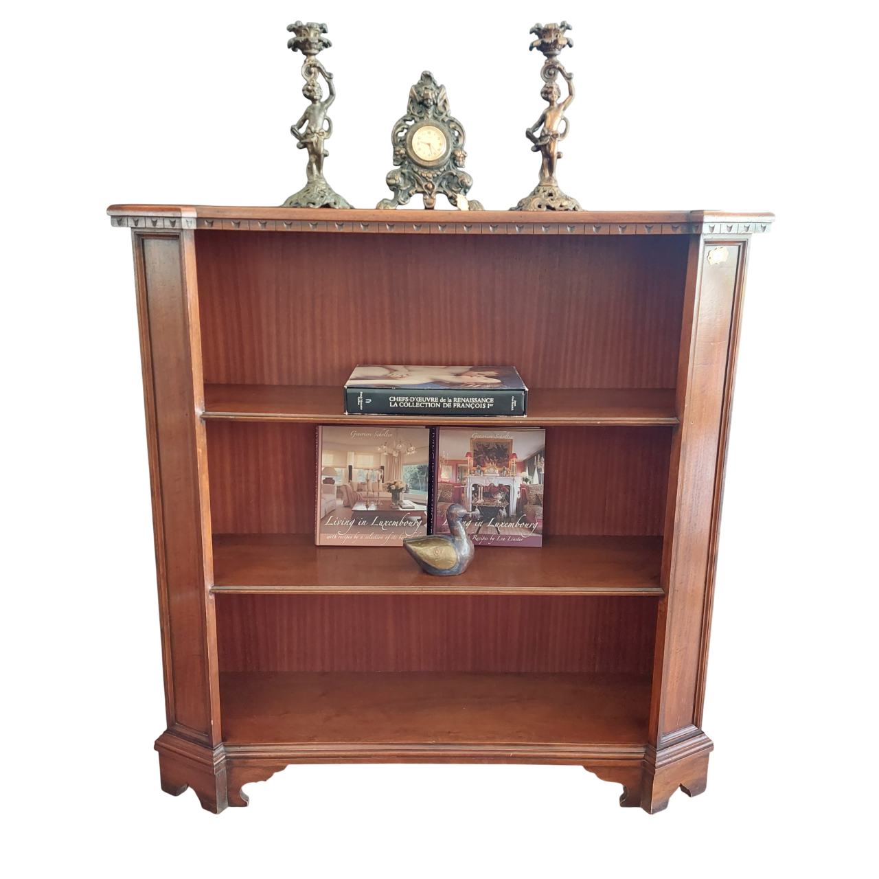 Knygų lentyna. Klasikinės formos, iš faneruoto medžio, su dekoratyvia viršutine briauna. Dvi lentynos, jų aukštis nereguliuojamas. Būklė gera. Parvežta iš Prancūzijos