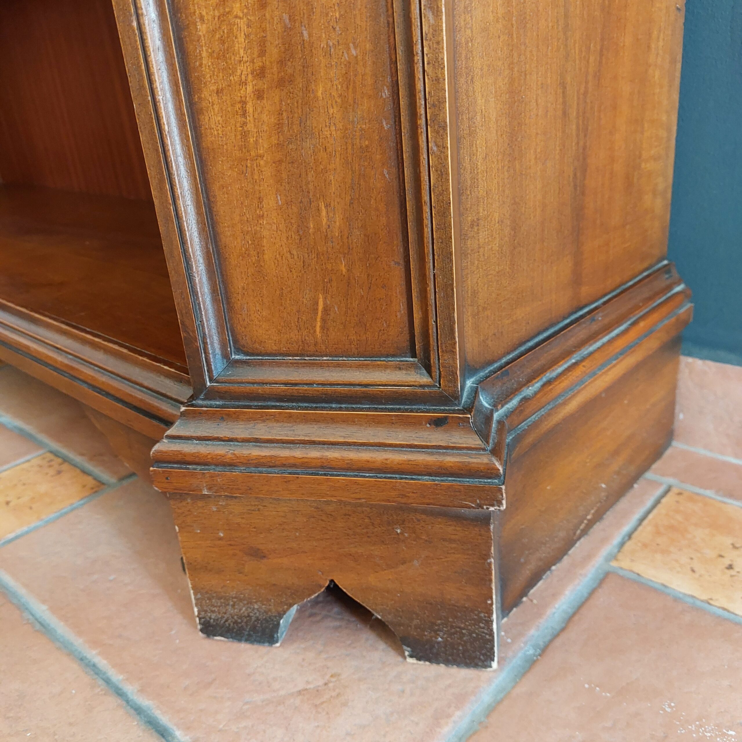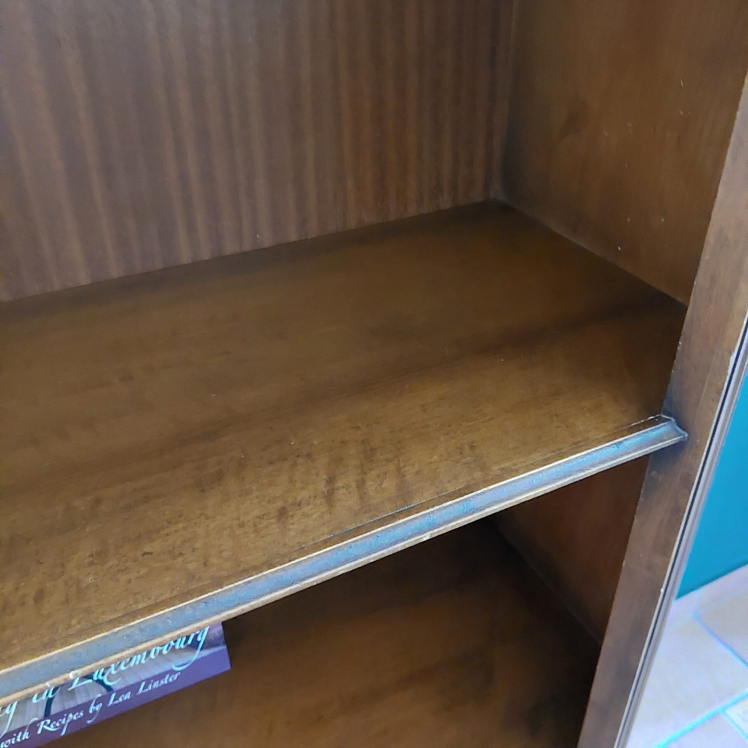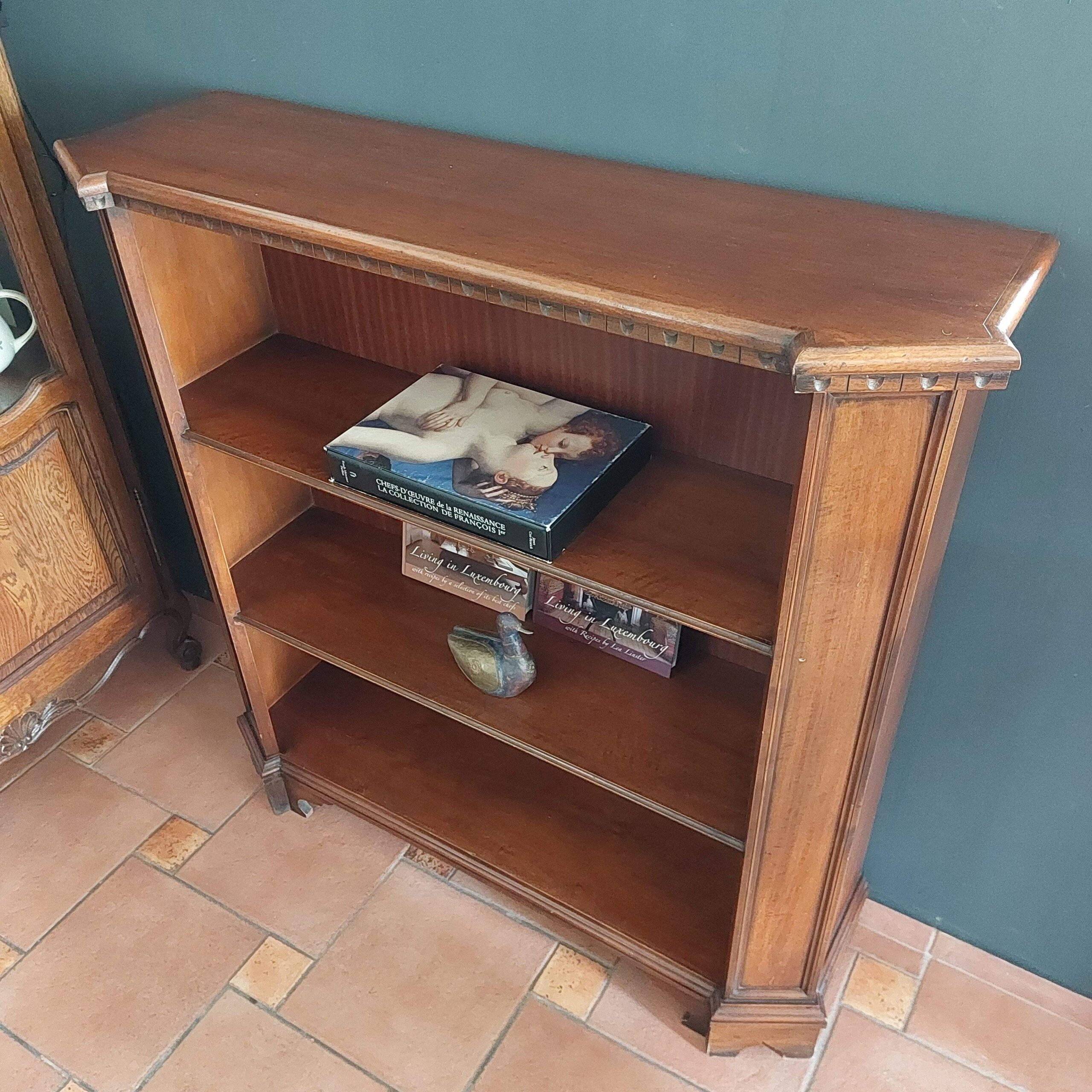 Knygų lentyna. Klasikinės formos, iš faneruoto medžio, su dekoratyvia viršutine briauna. Dvi lentynos, jų aukštis nereguliuojamas. Būklė gera. Parvežta iš Prancūzijos