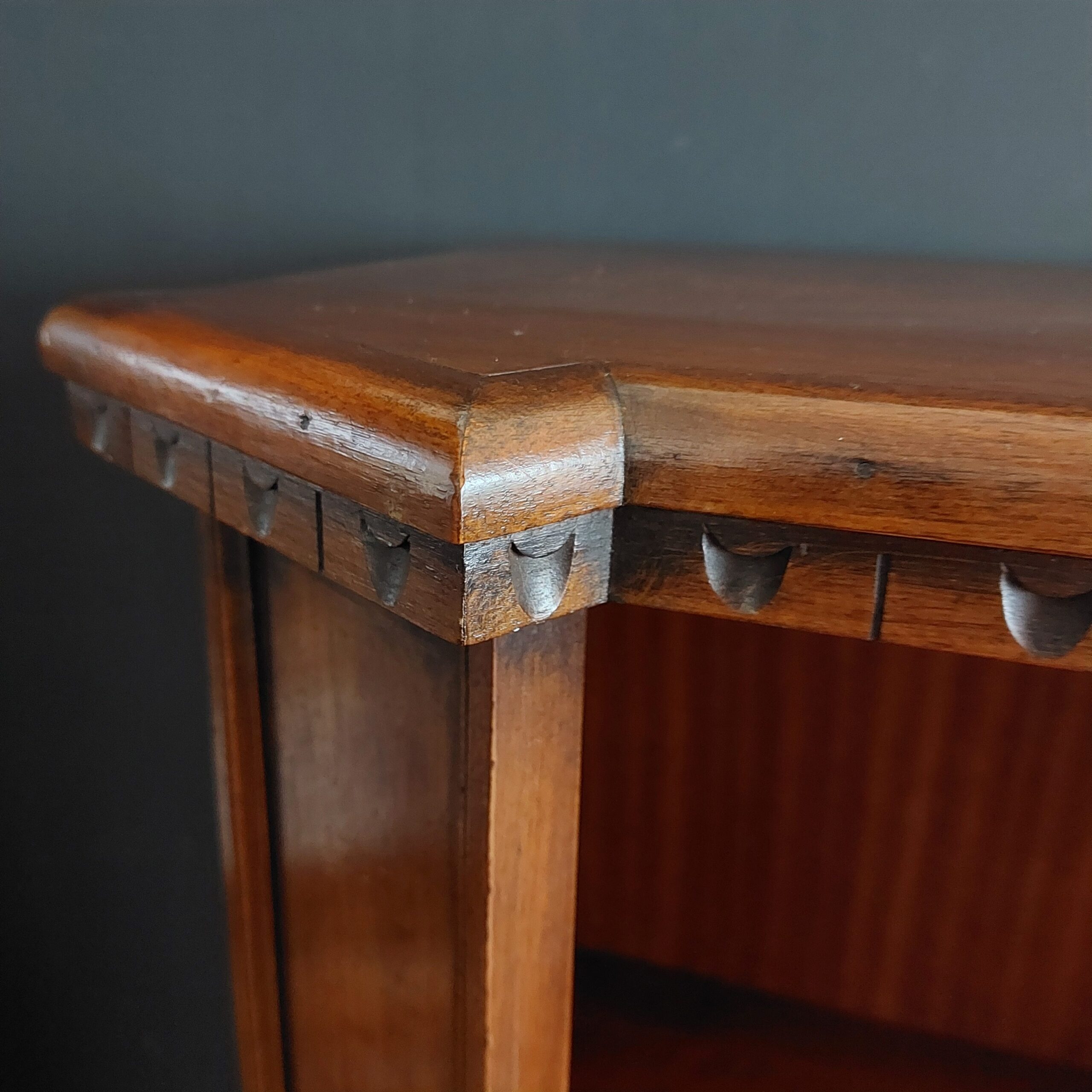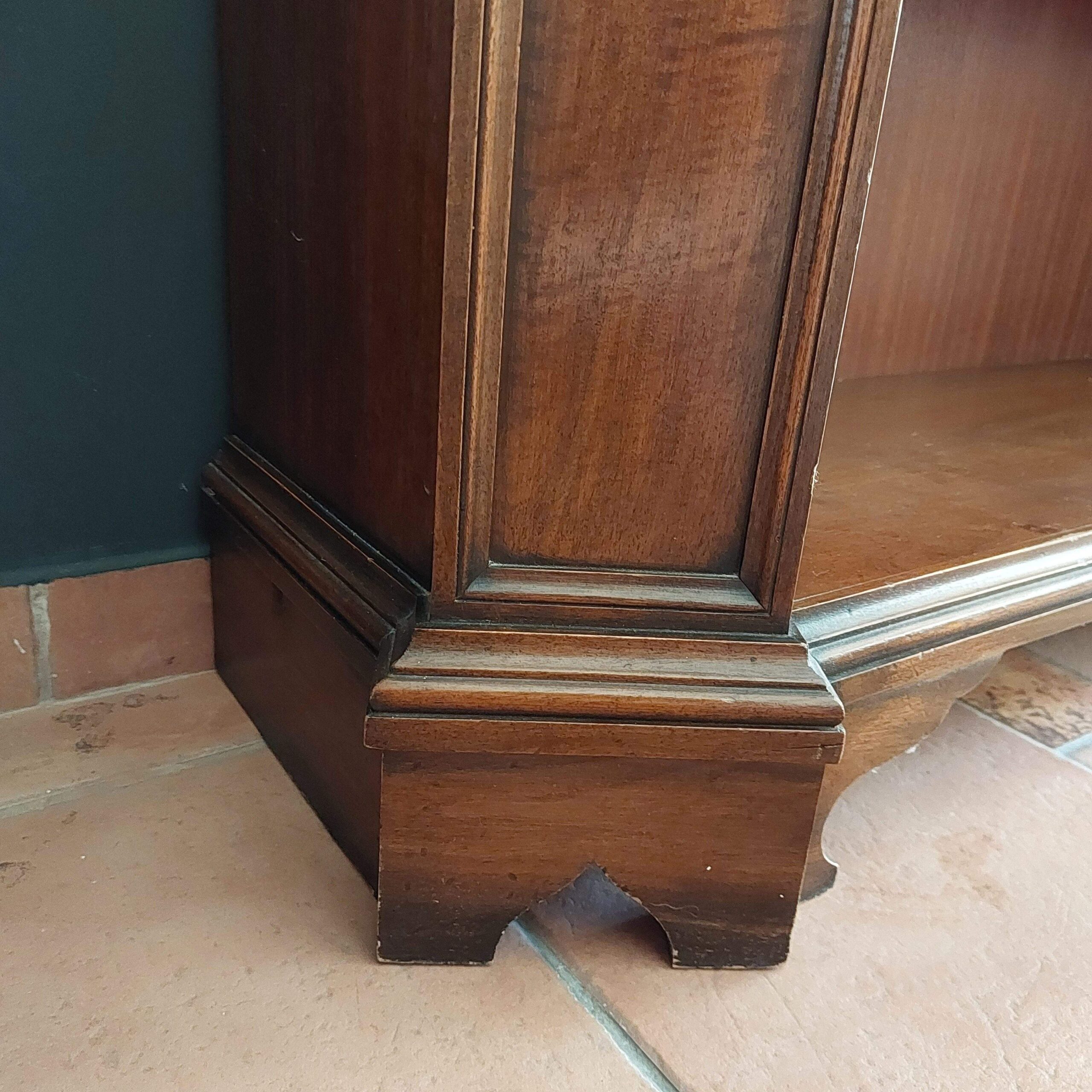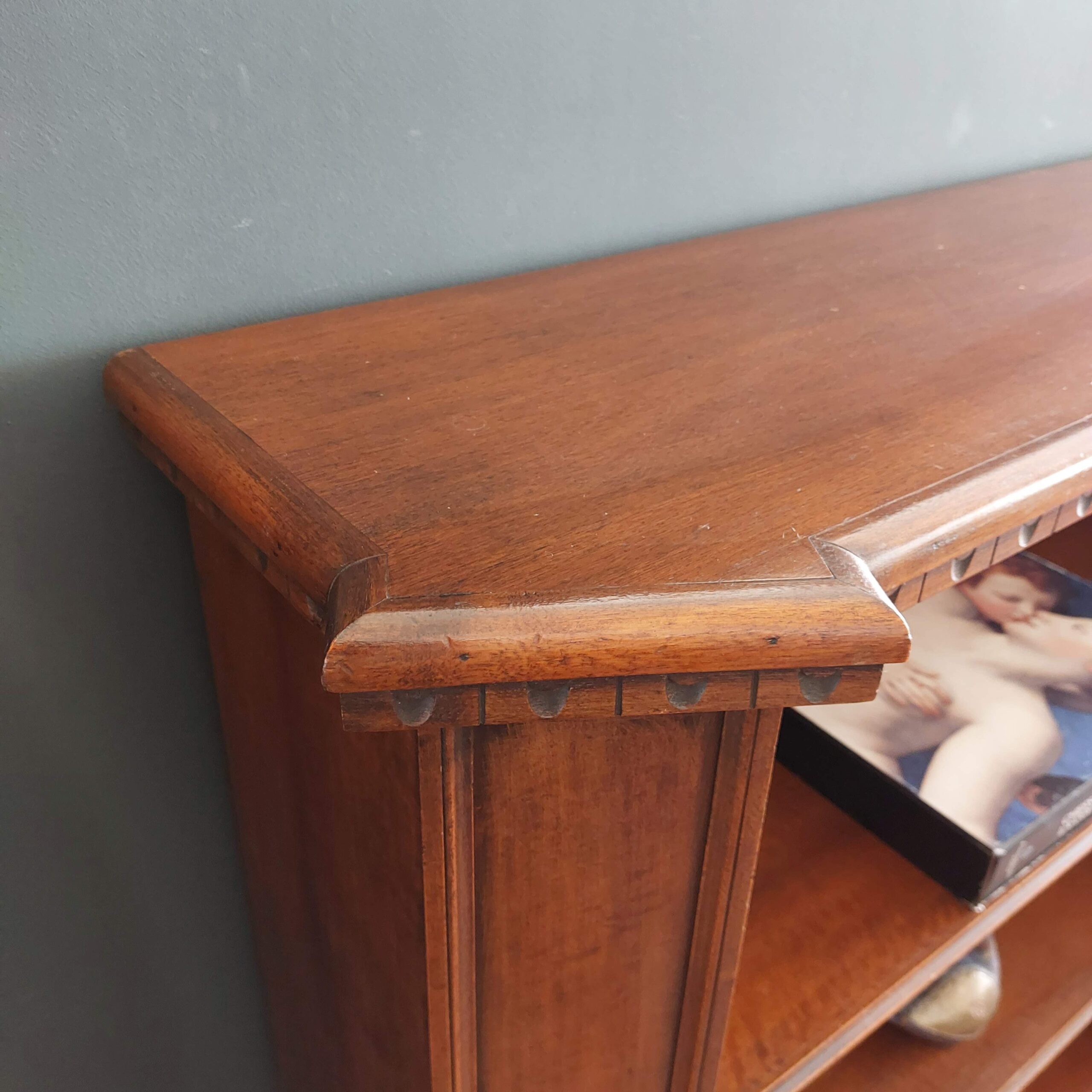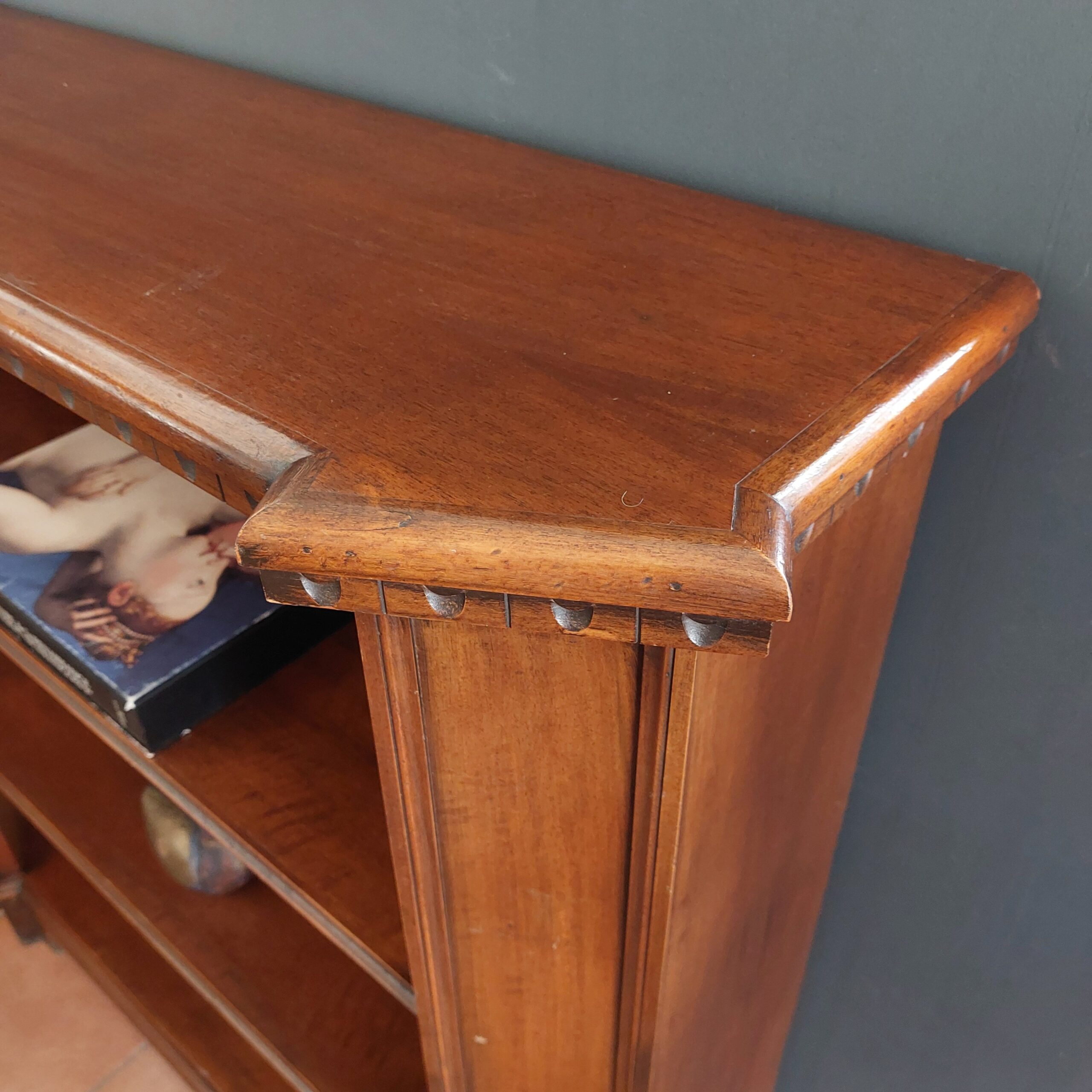 Knygų lentyna. Klasikinės formos, iš faneruoto medžio, su dekoratyvia viršutine briauna. Dvi lentynos, jų aukštis nereguliuojamas. Būklė gera. Parvežta iš Prancūzijos