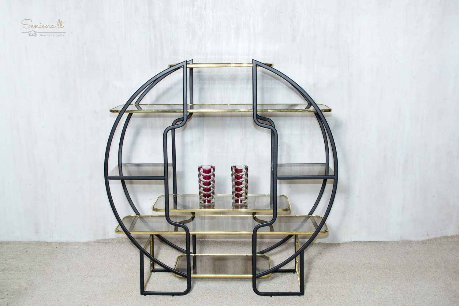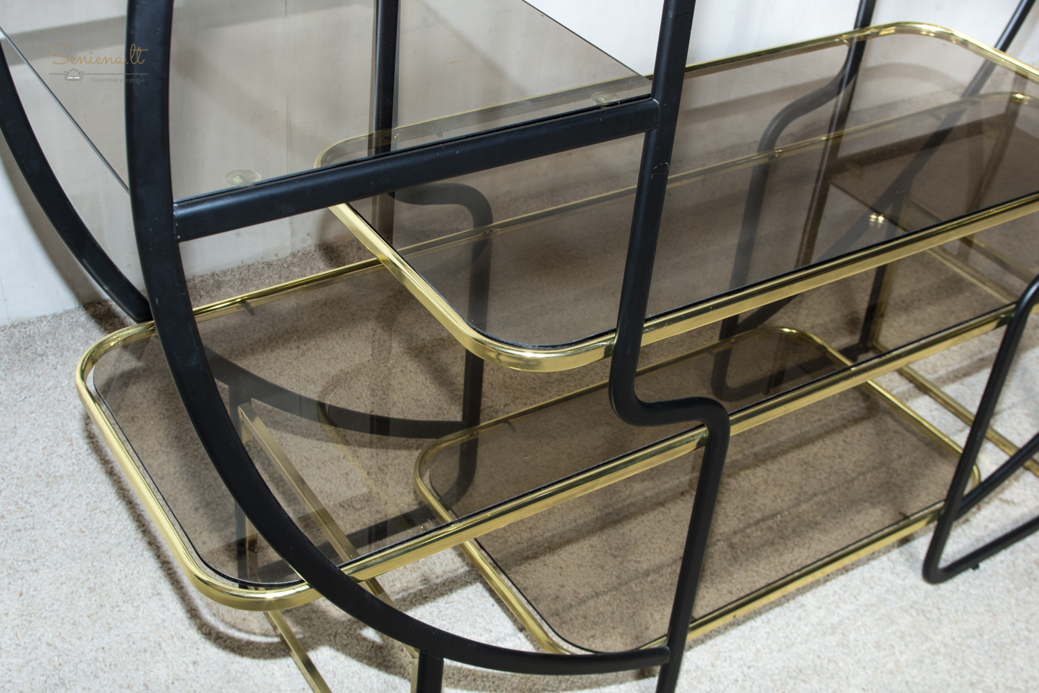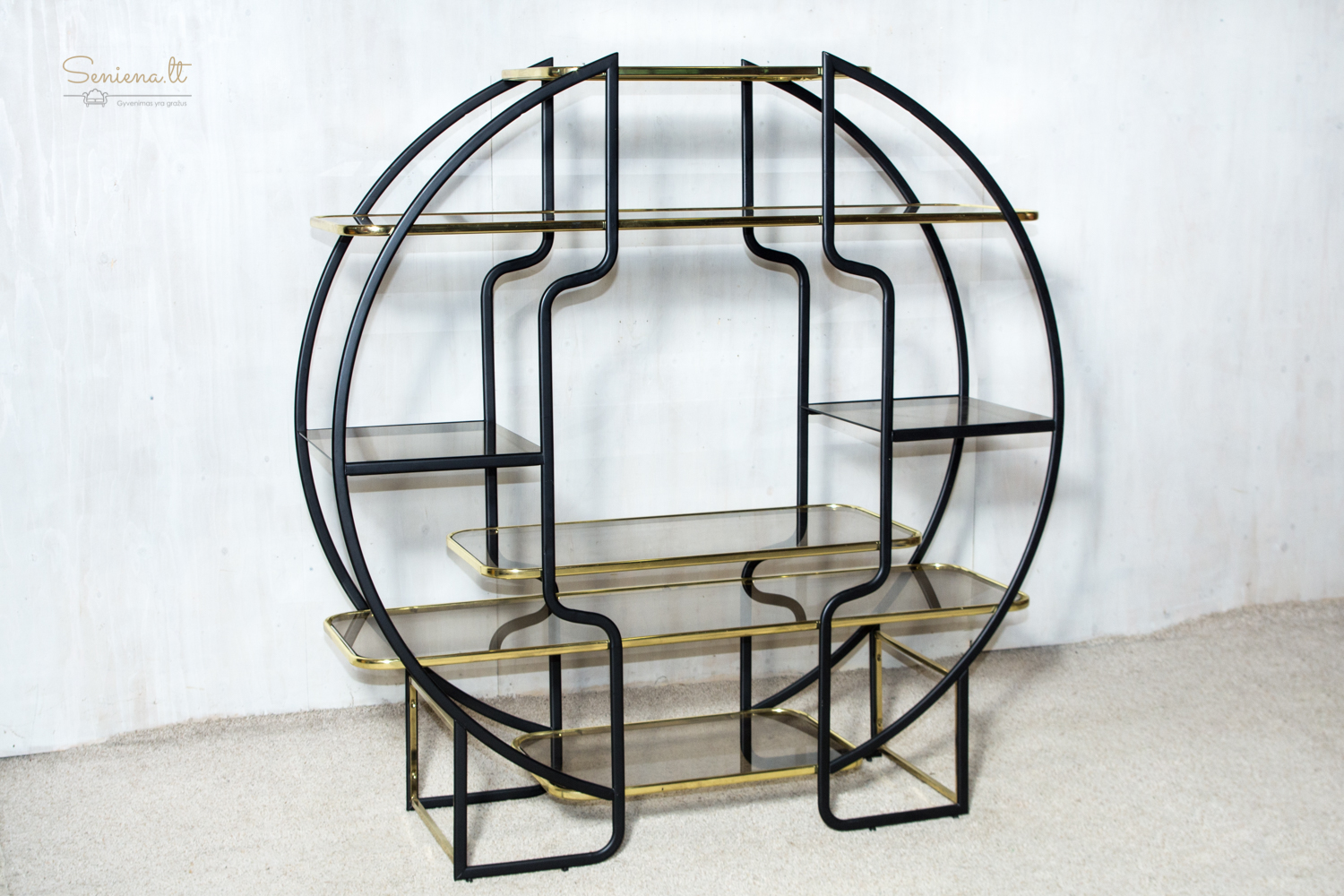 Vintažinė itališka lentyna/vitrina, labai dekoratyvi bei tinkanti tiek Art Deko, tiek Bohemiško stiliaus interjerui. Gali būti naudojama kaip kambario pertvara. Juodo bei paauksuoto metalo tvirtas rėmas, tonuoto stiklo septynios lentynos. Geros būklės. Apie 1970 m.