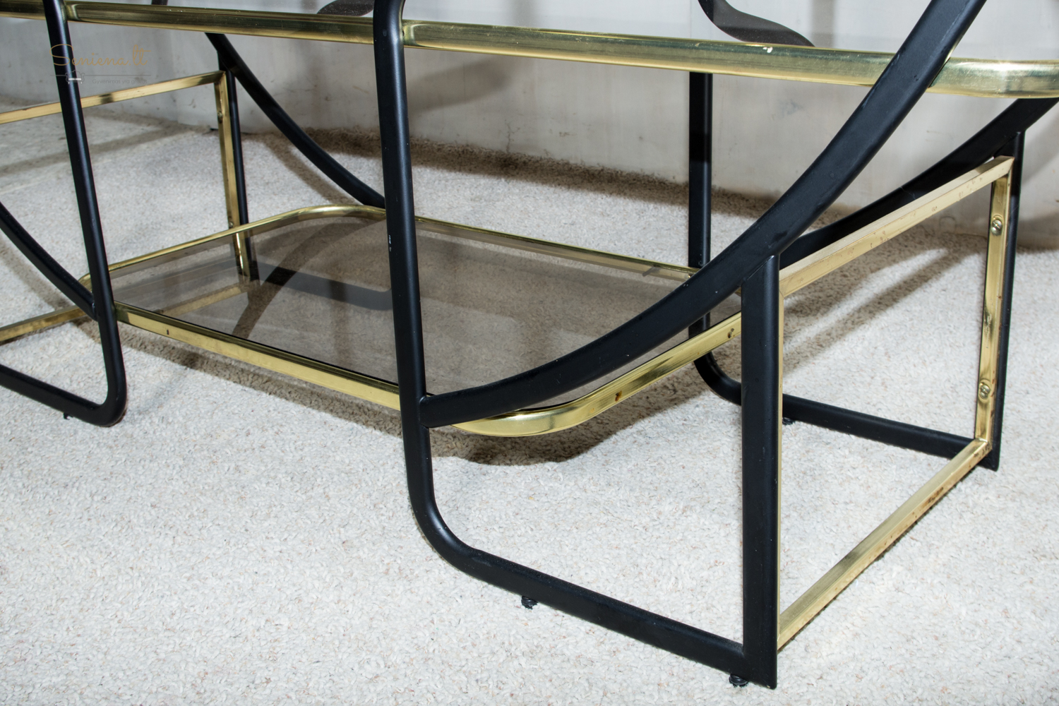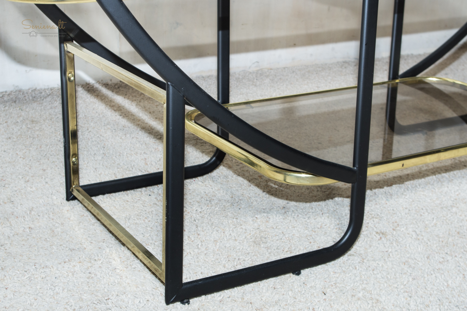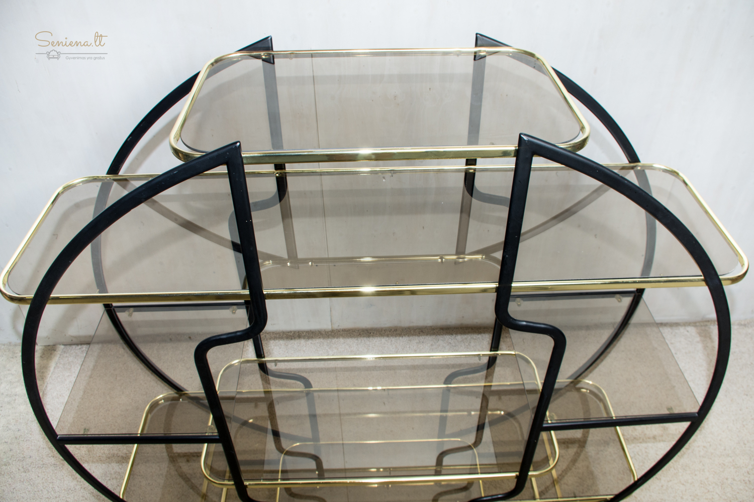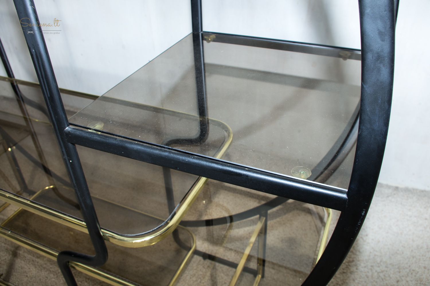 Vintažinė itališka lentyna/vitrina, labai dekoratyvi bei tinkanti tiek Art Deko, tiek Bohemiško stiliaus interjerui. Gali būti naudojama kaip kambario pertvara. Juodo bei paauksuoto metalo tvirtas rėmas, tonuoto stiklo septynios lentynos. Geros būklės. Apie 1970 m.