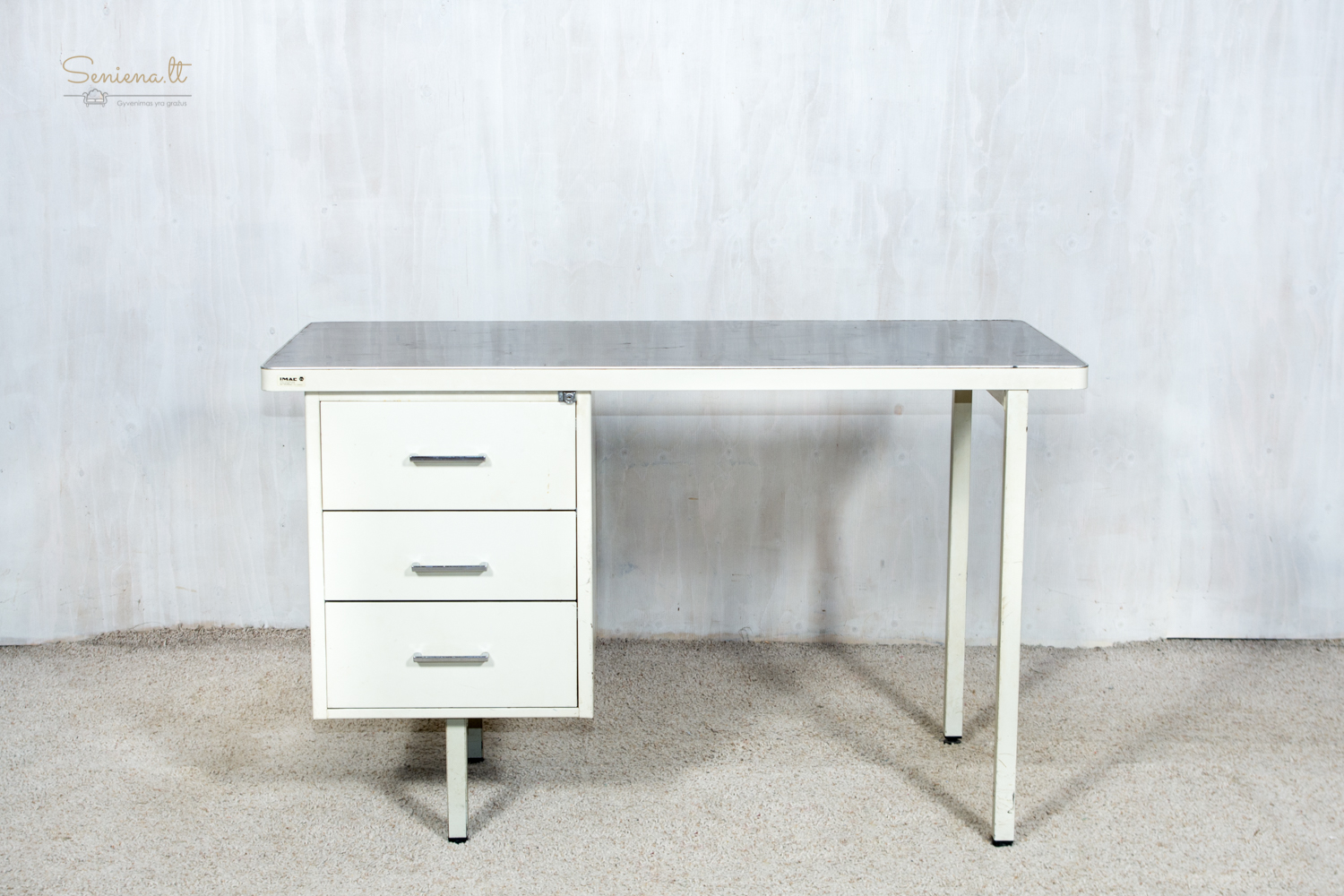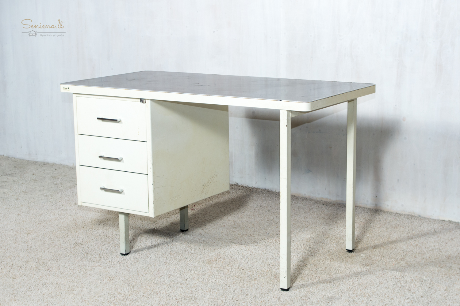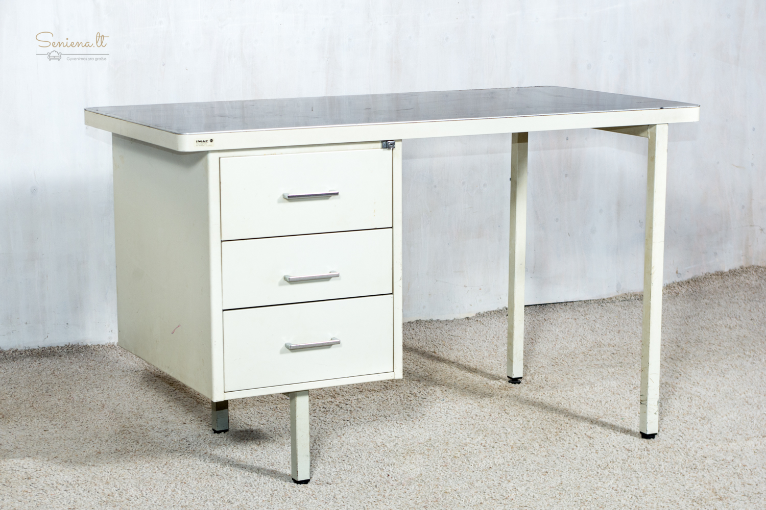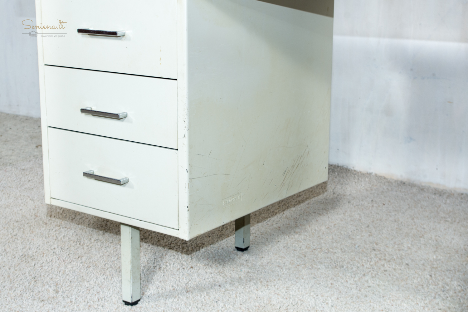 Vintažinis metalinis rašomasis stalas, industrinis stilius, pagaminta Prancūzijoje apie 1960-70 m., gamintojas “Strafor”. Nėra raktelio stalčiams rakinti.