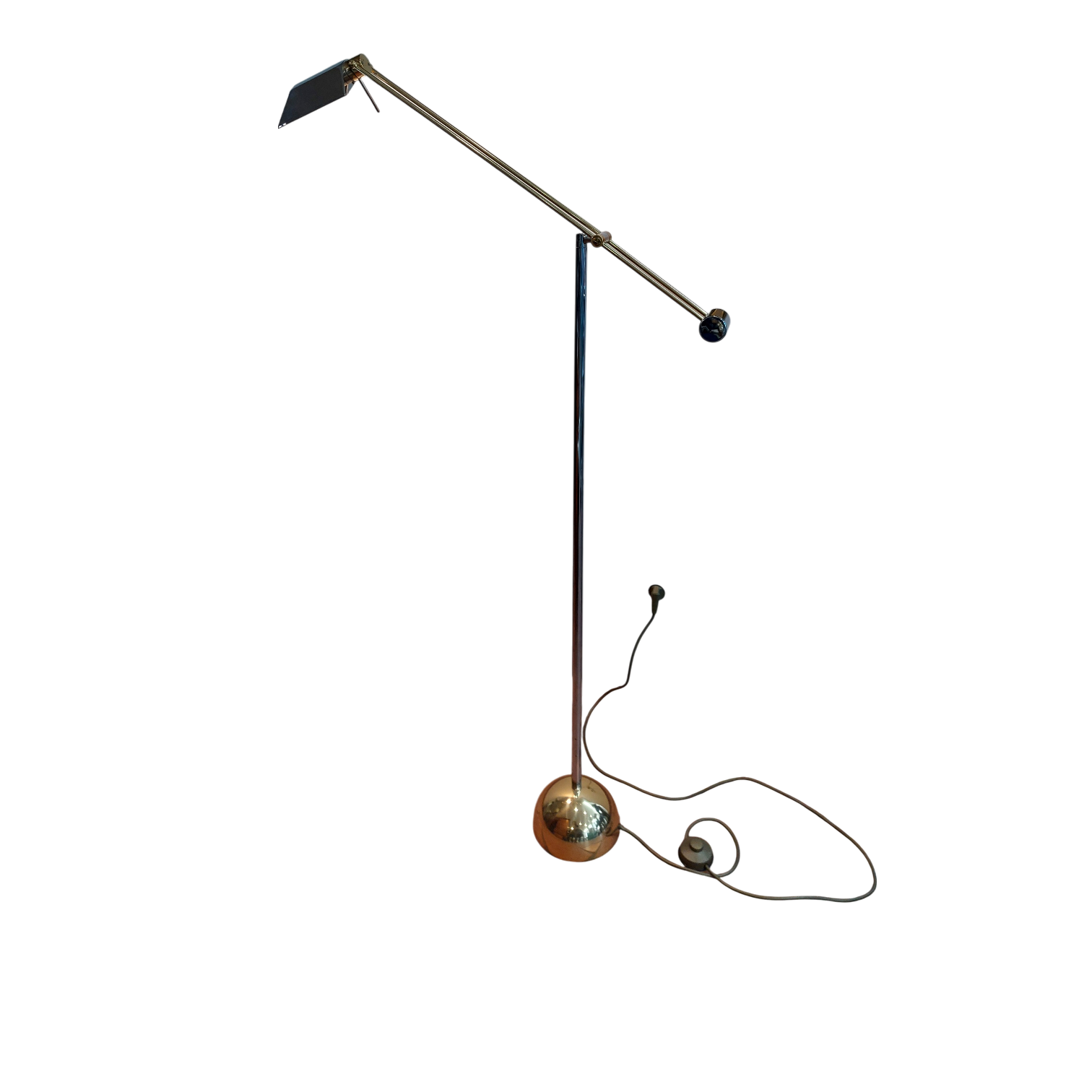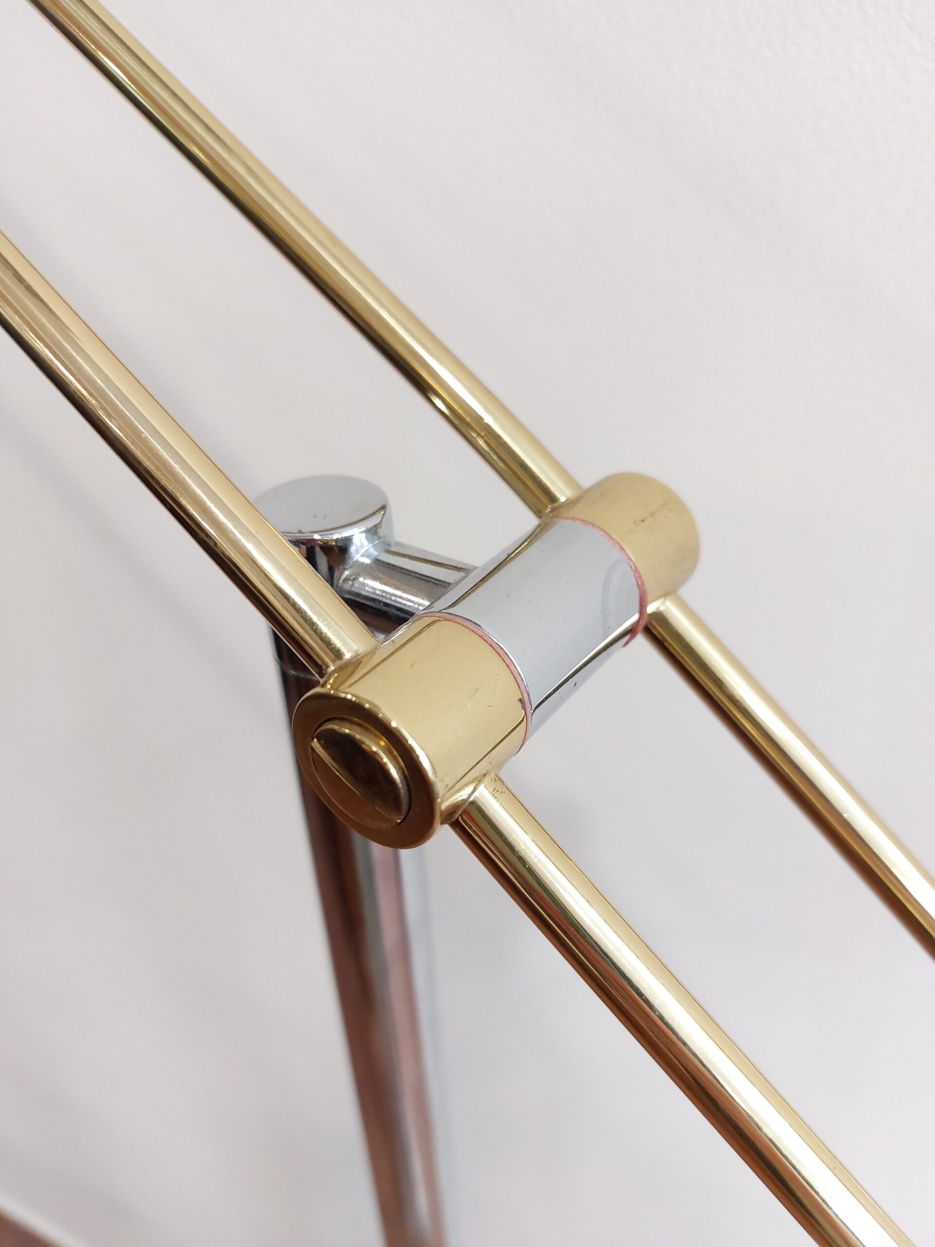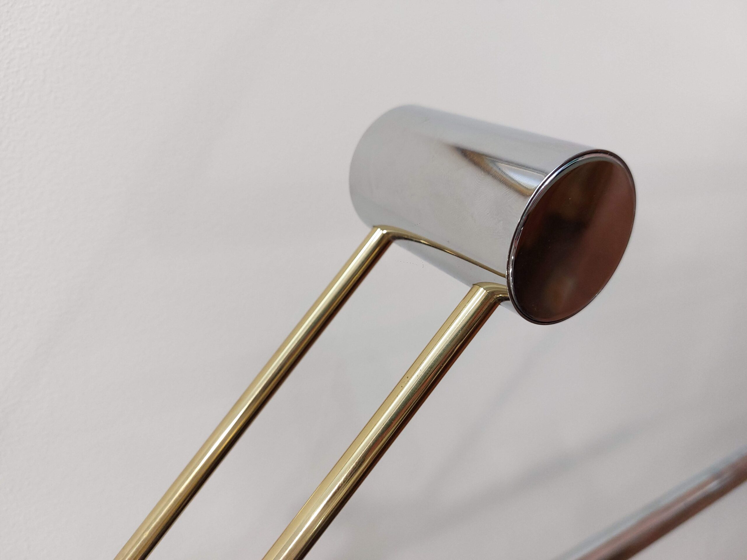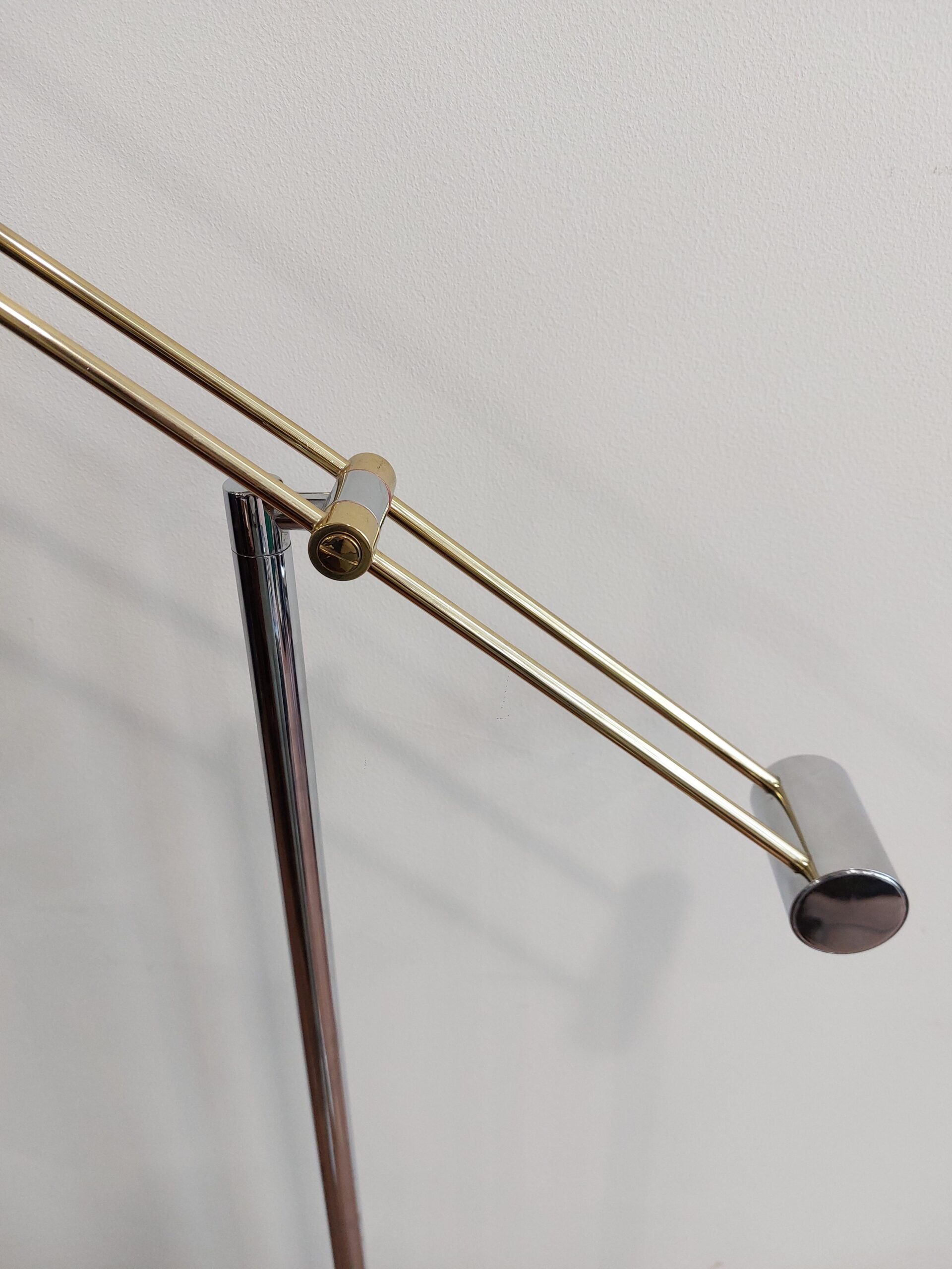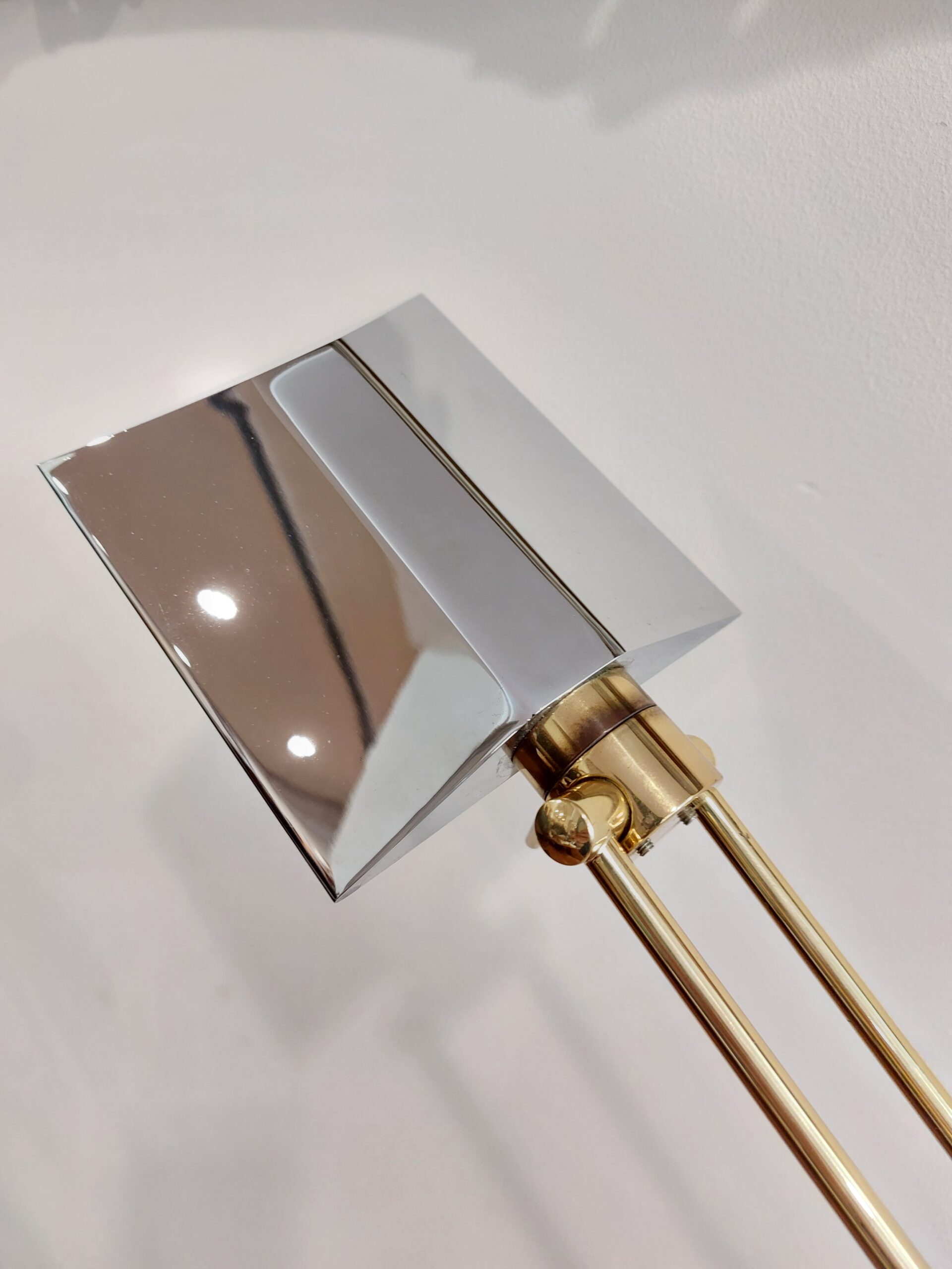 Chromuotas stovas, žalvario spalvos pagrindas, aiškios proporcijos. Galvutė pasisuka ir reguliuojasi, todėl šviesą galima nukreipti tiksliai ten, kur reikia, tiek skaitymui, tiek akcentiniam apšvietimui. Lempa tvirta, kokybiška.