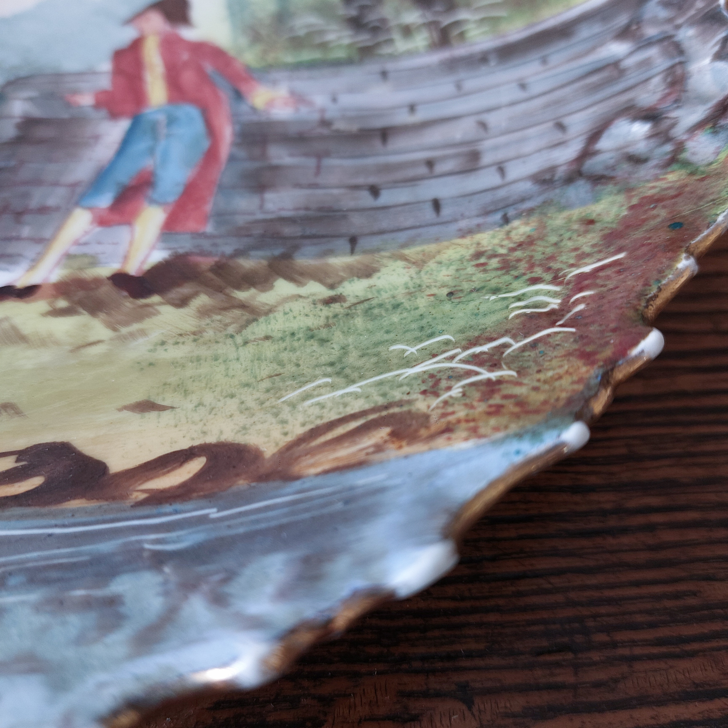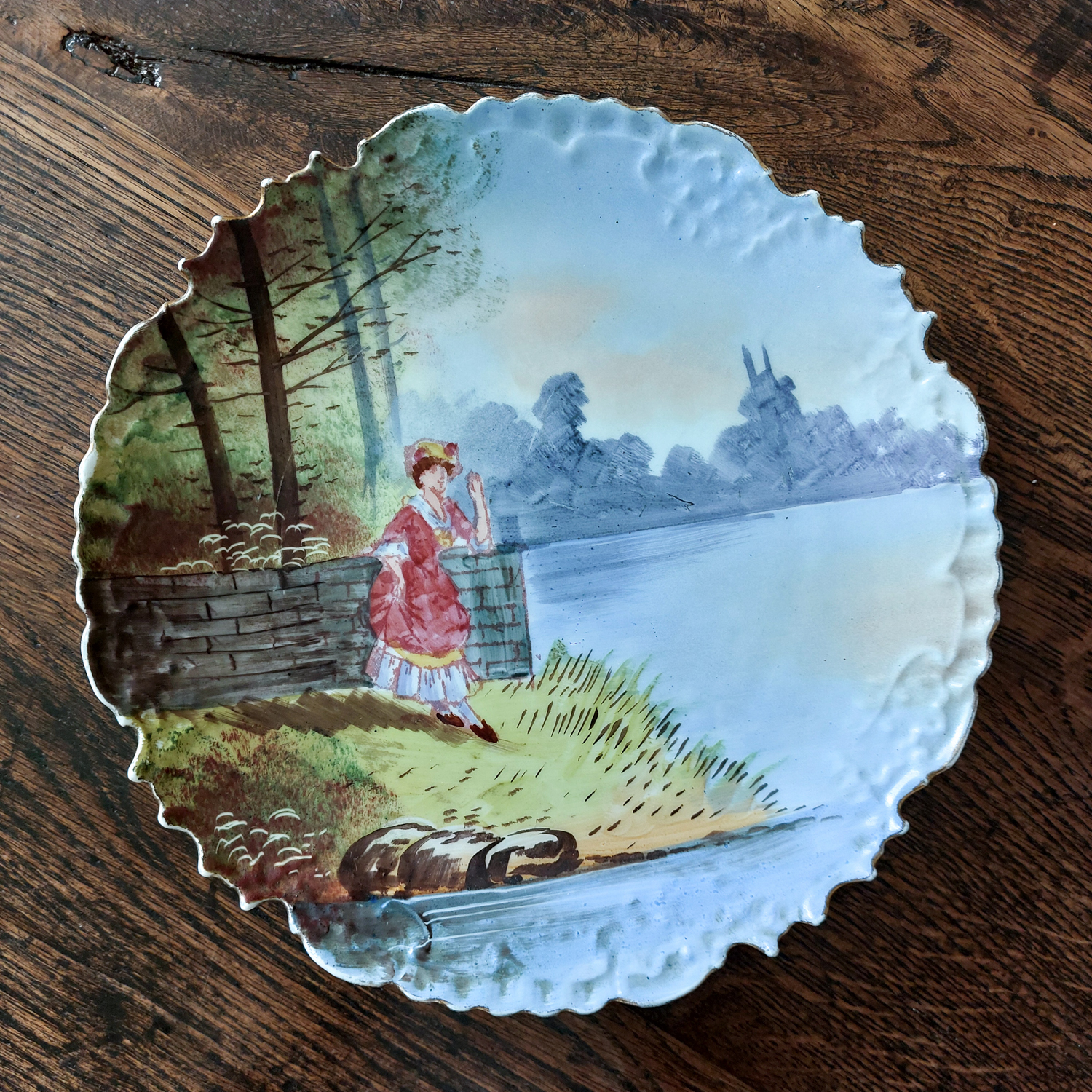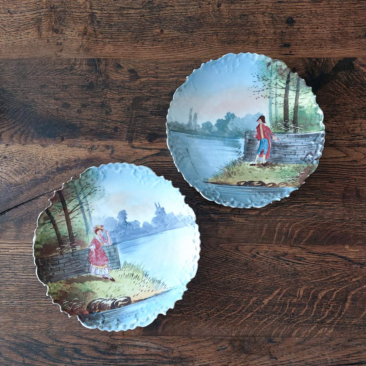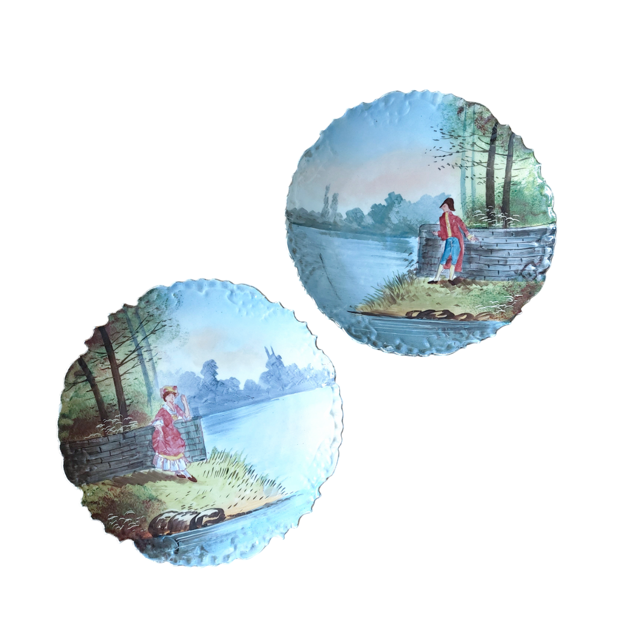 Dekoratyvinės keraminės lėkštės, nutapytos rankomis, vaizduoja romantišką porą prie upės. Išraiškingas reljefinis kraštas, švelnios spalvos ir lengvai sendintas paviršius. Geros būklės.
