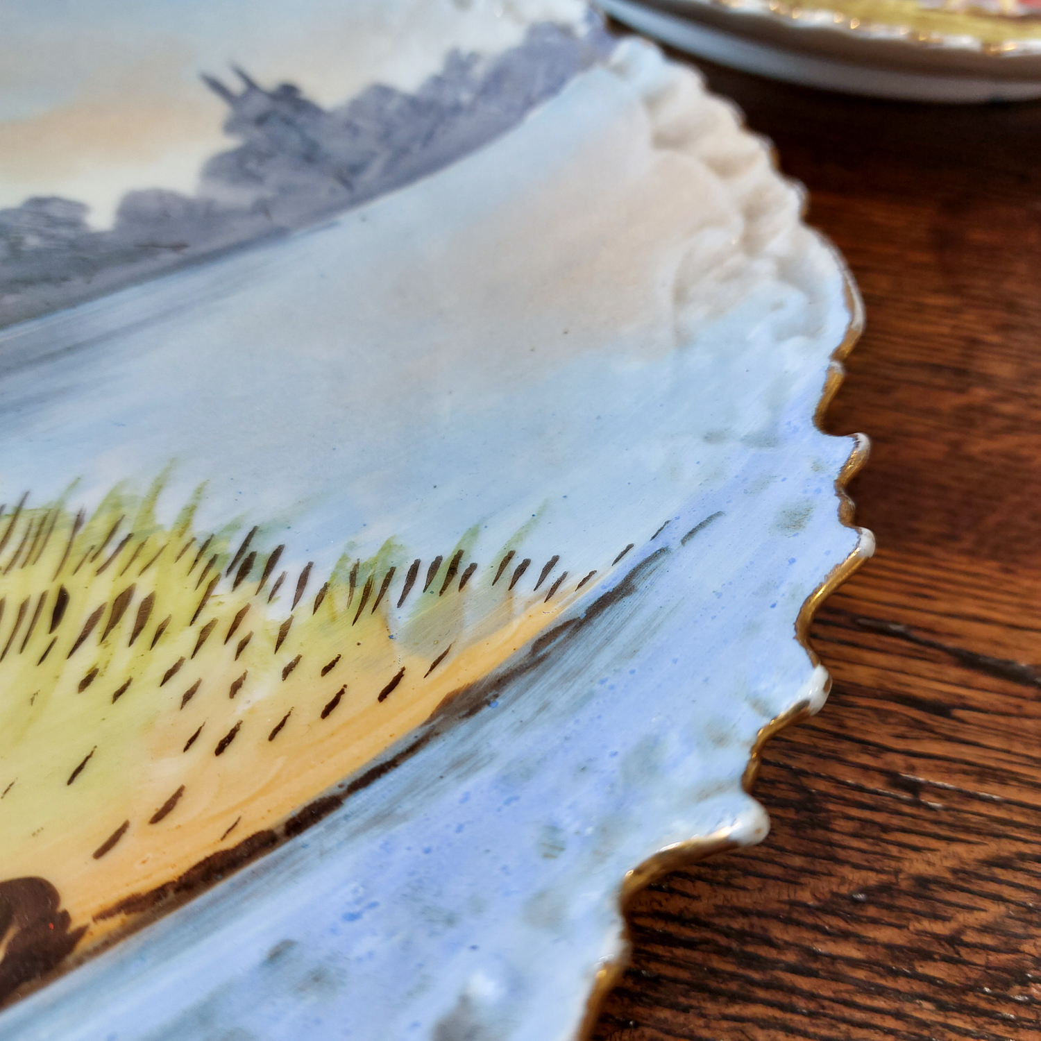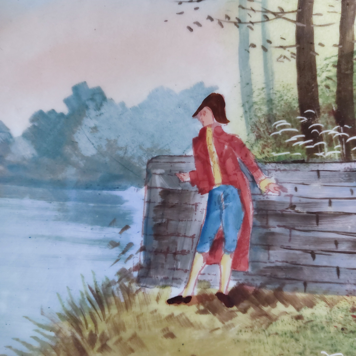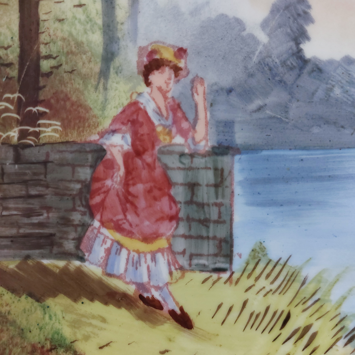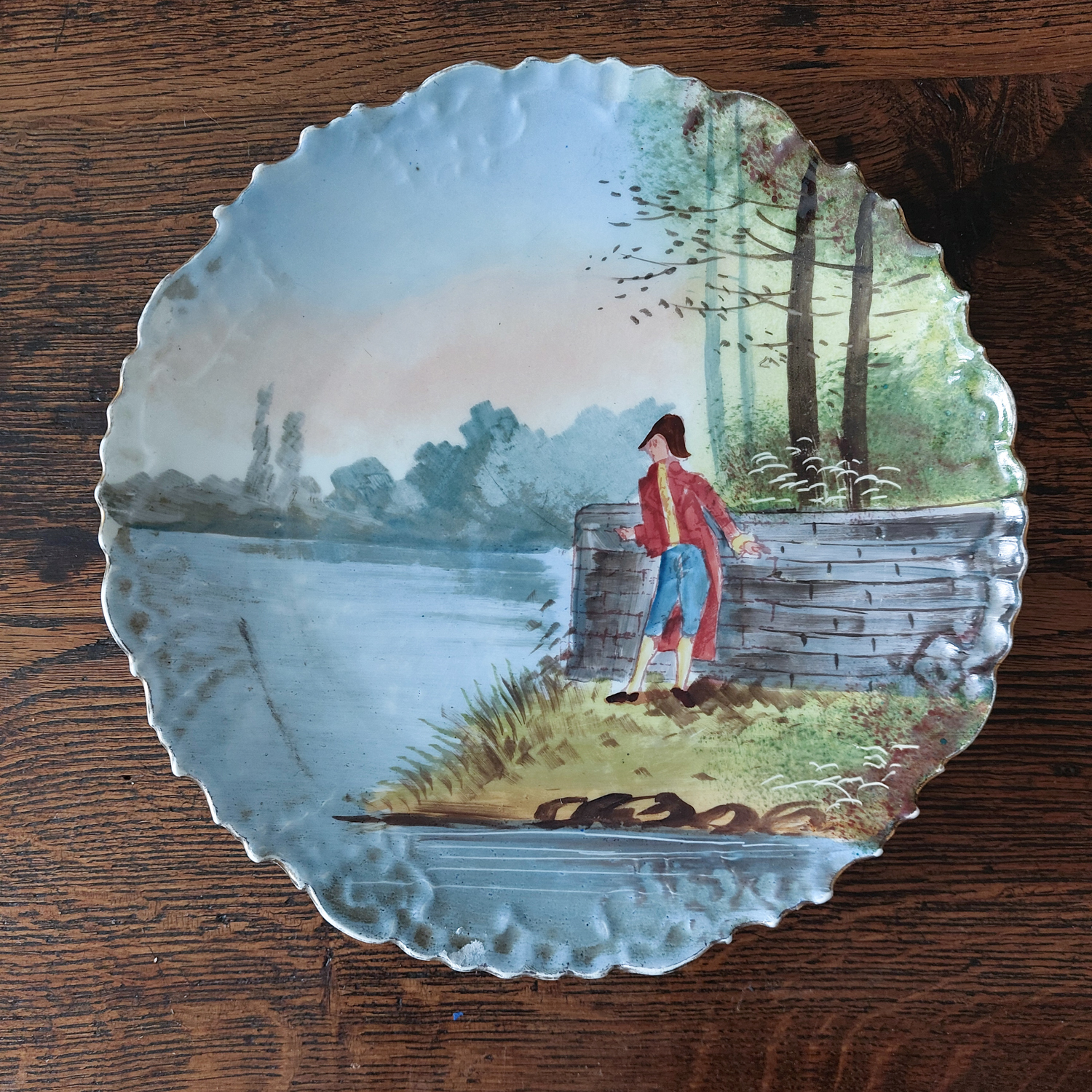 Dekoratyvinės keraminės lėkštės, nutapytos rankomis, vaizduoja romantišką porą prie upės. Išraiškingas reljefinis kraštas, švelnios spalvos ir lengvai sendintas paviršius. Geros būklės.
