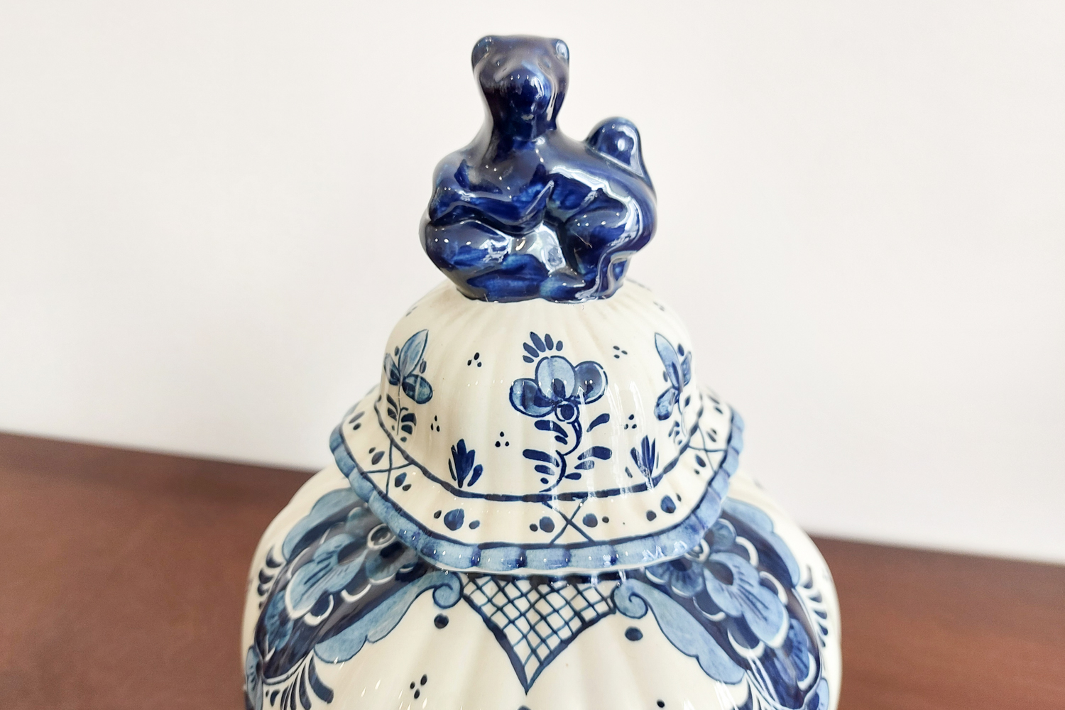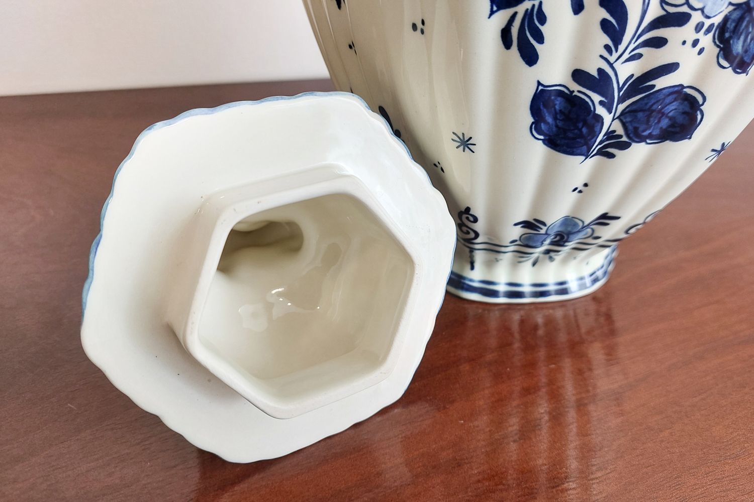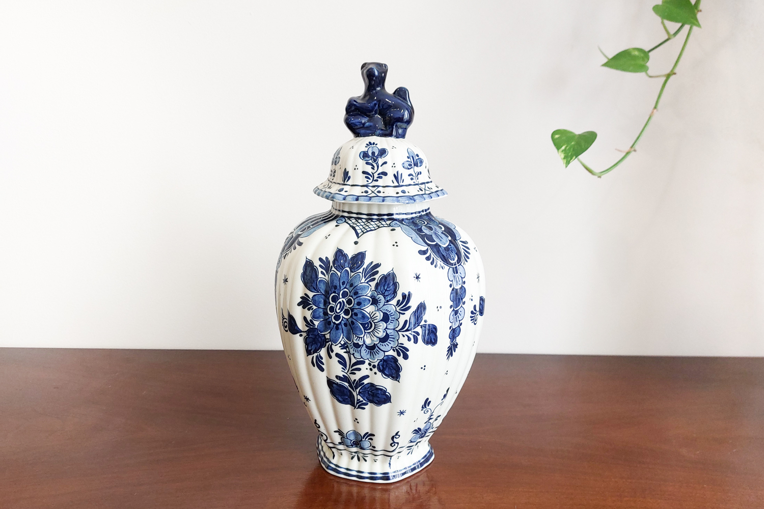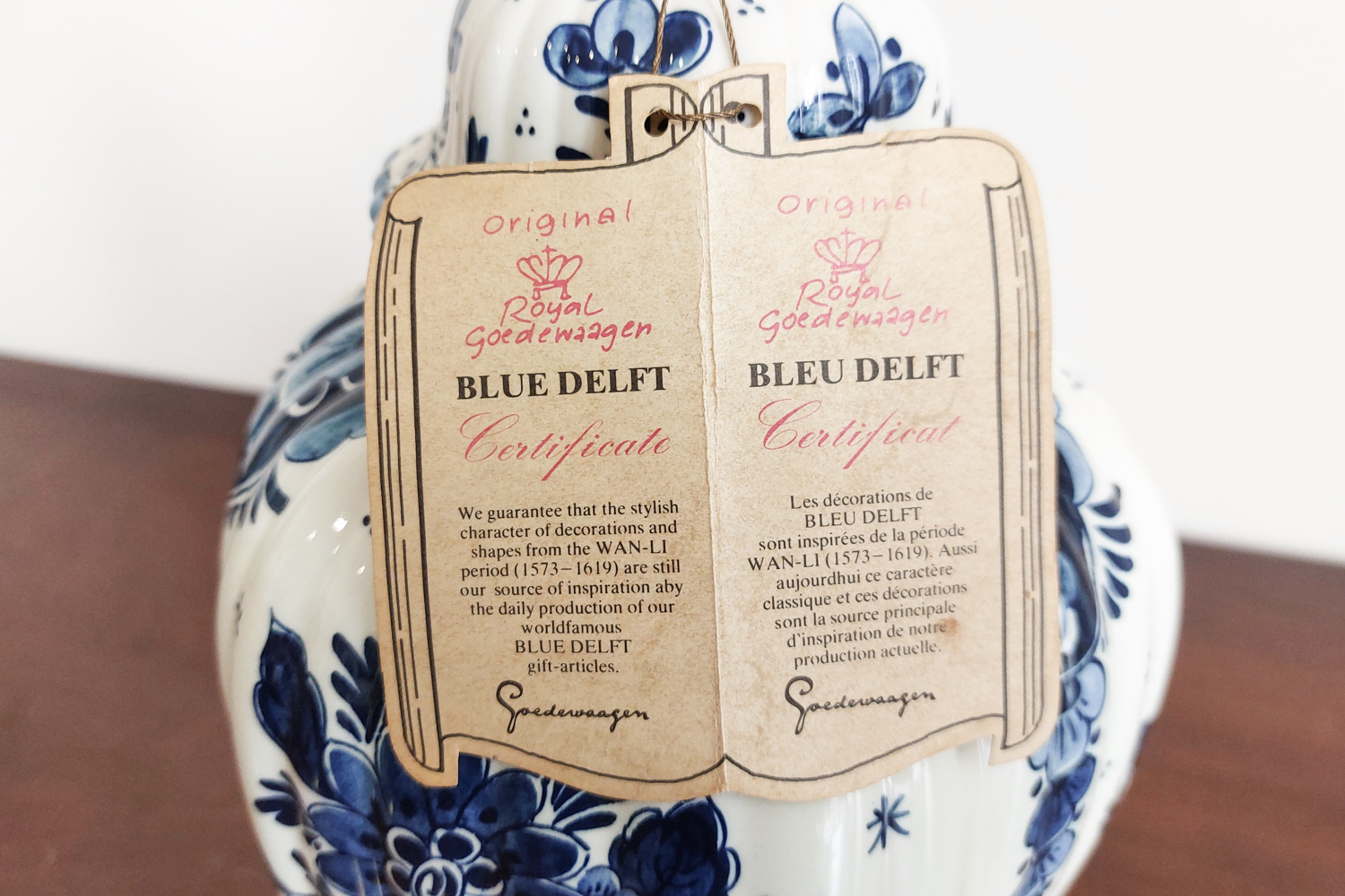 Royal Goedewaagen mėlynojo Delfto vaza yra sukurta 1968 m., Nyderlanduose. Jos dizainas remiasi WAN-LI laikotarpio (1573-1619) motyvais, kurie yra žinomi dėl savo stilizuotų augalinių ir geometrinių raštų. Vaza yra su originaliu autentiškumo sertifikatu, kuris patvirtina jos kilmę ir kokybę. Puiki detalė tiek praktiniam naudojimui, tiek kaip dekoratyvinis elementas. Puikios būklės