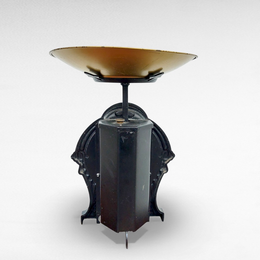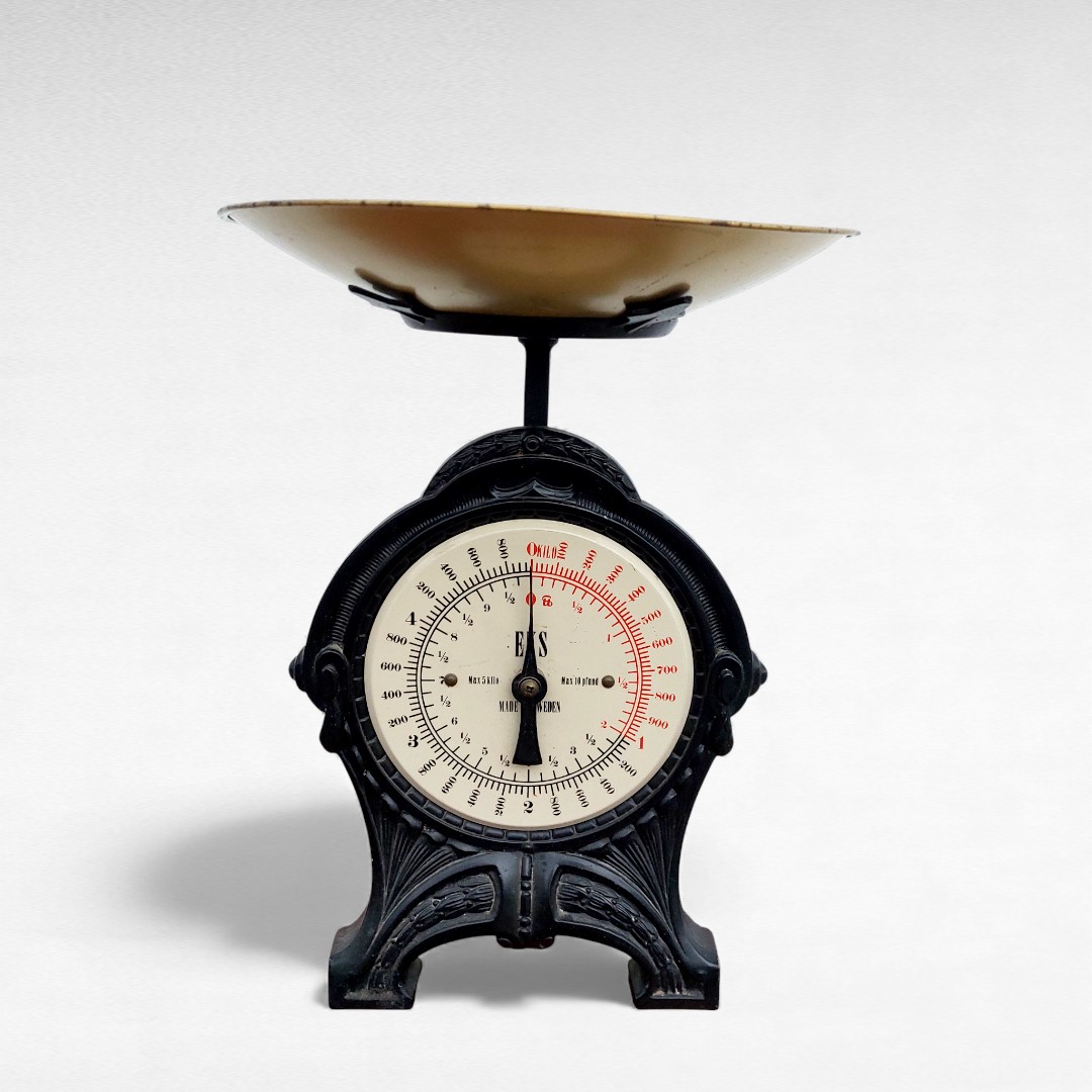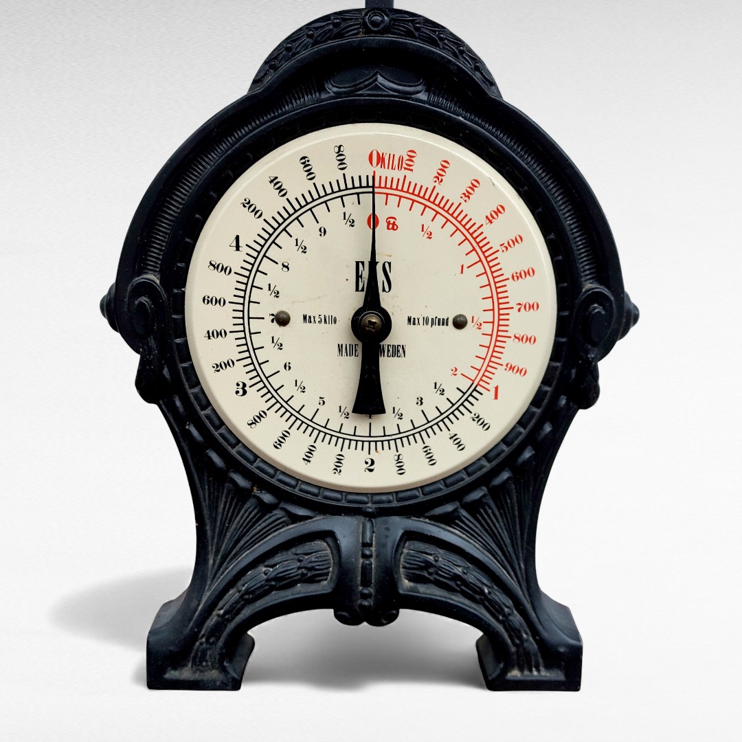 Senovinės mechaninės virtuvinės svarstyklės iš Švedijos, gamintos XX a. viduryje. Tvirtas juodas korpusas, metalinis padėklas, veikiantis mechanizmas. Paviršiuje matosi natūralūs laiko ženklai. Parvežta iš Prancūzijos.