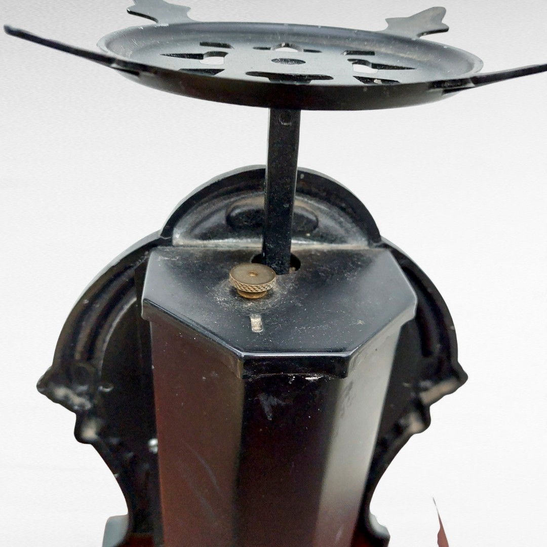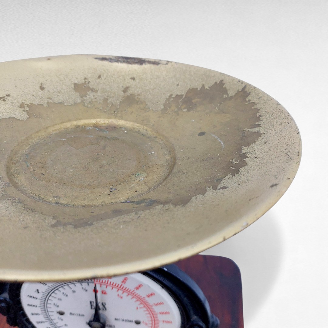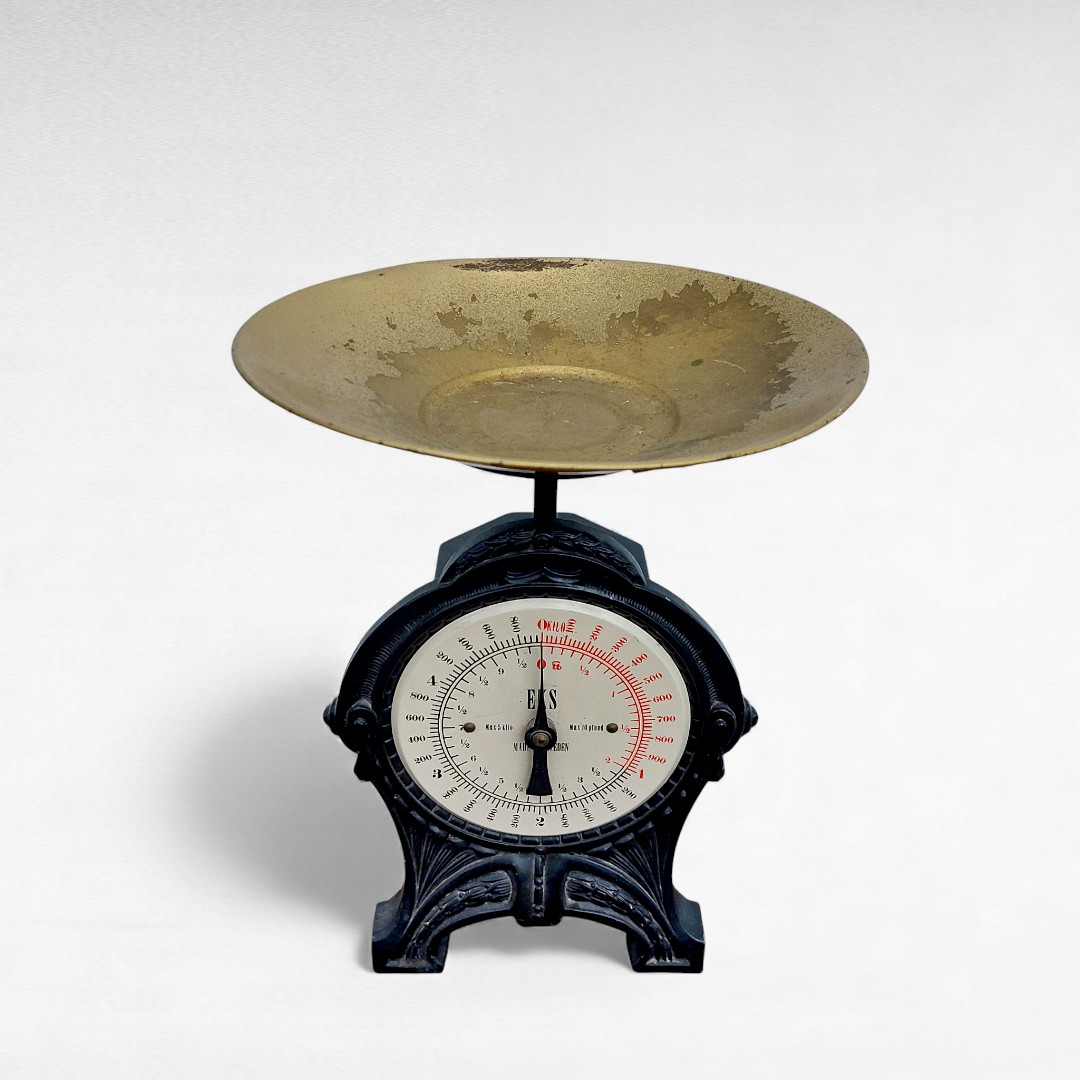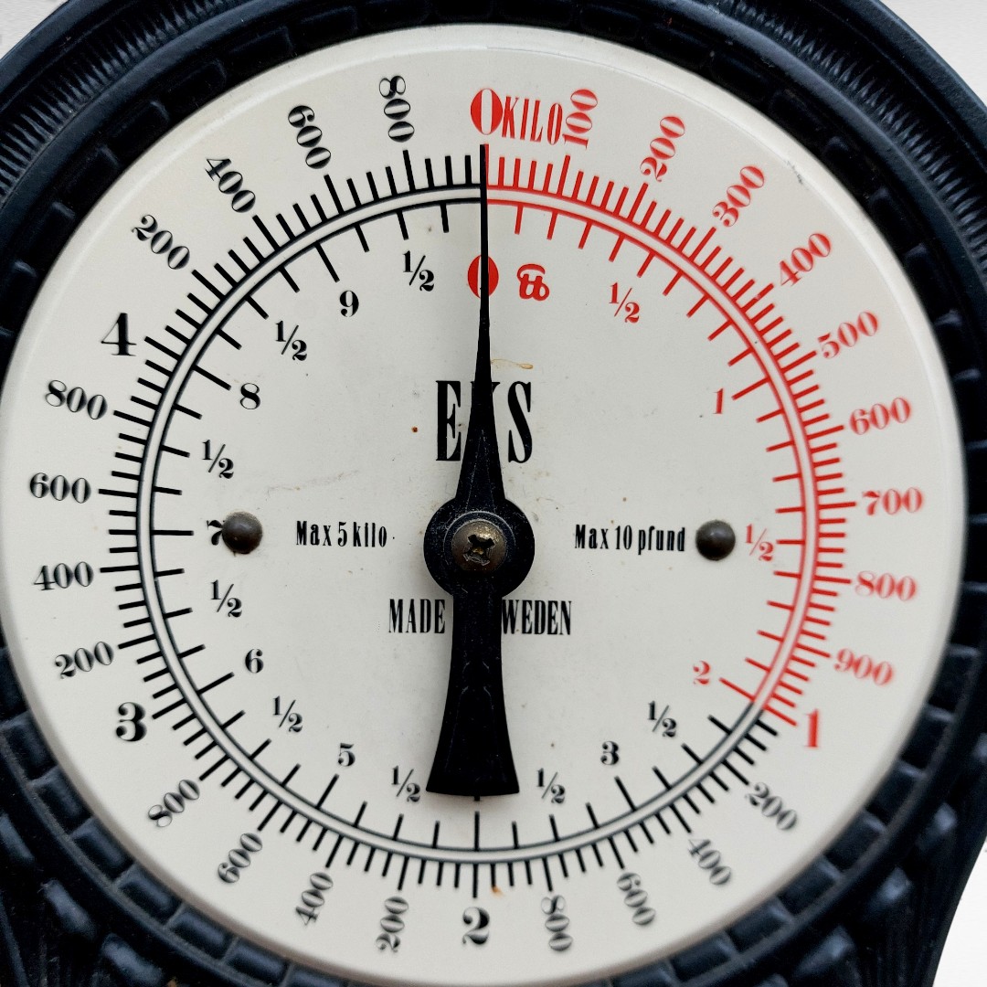 Senovinės mechaninės virtuvinės svarstyklės iš Švedijos, gamintos XX a. viduryje. Tvirtas juodas korpusas, metalinis padėklas, veikiantis mechanizmas. Paviršiuje matosi natūralūs laiko ženklai. Parvežta iš Prancūzijos.