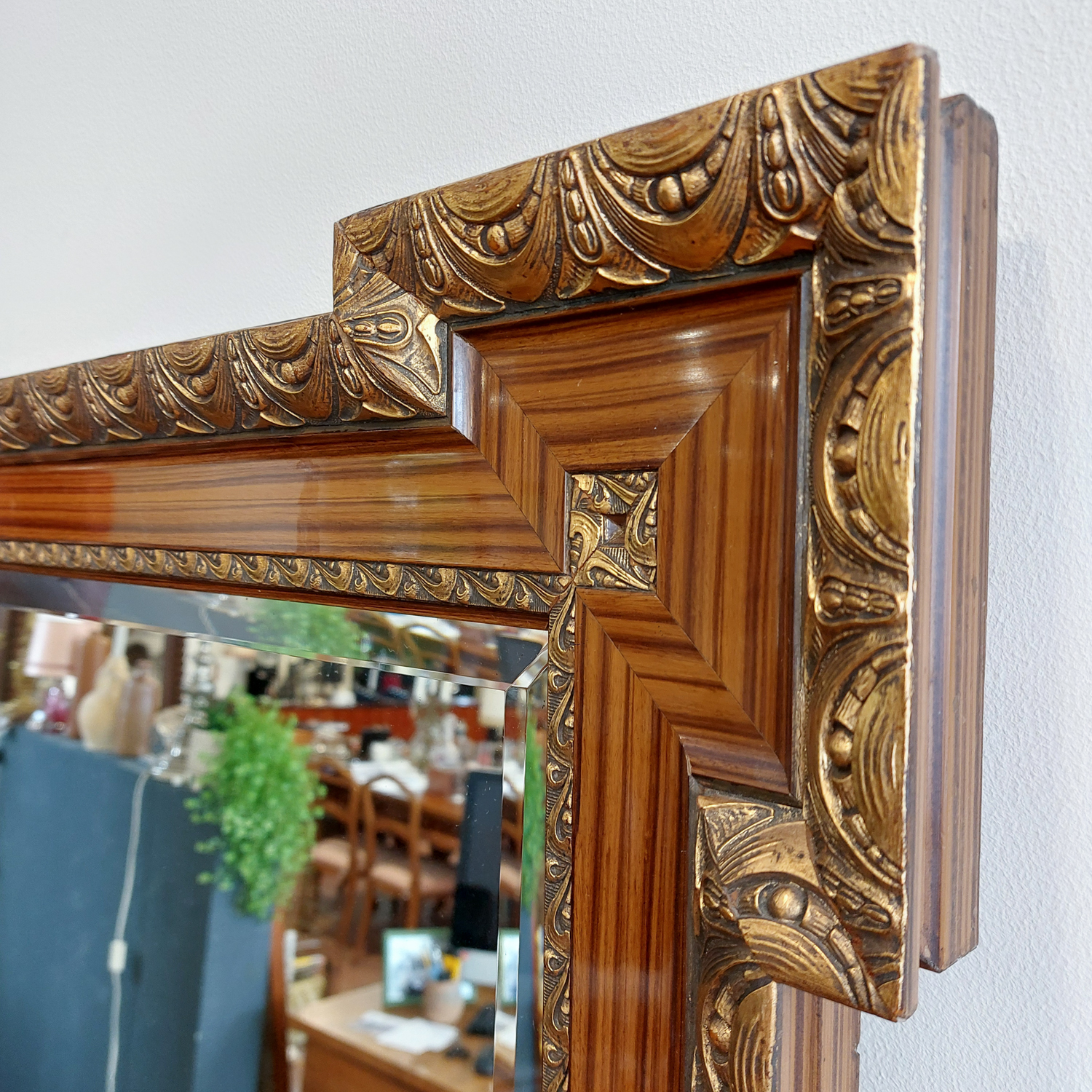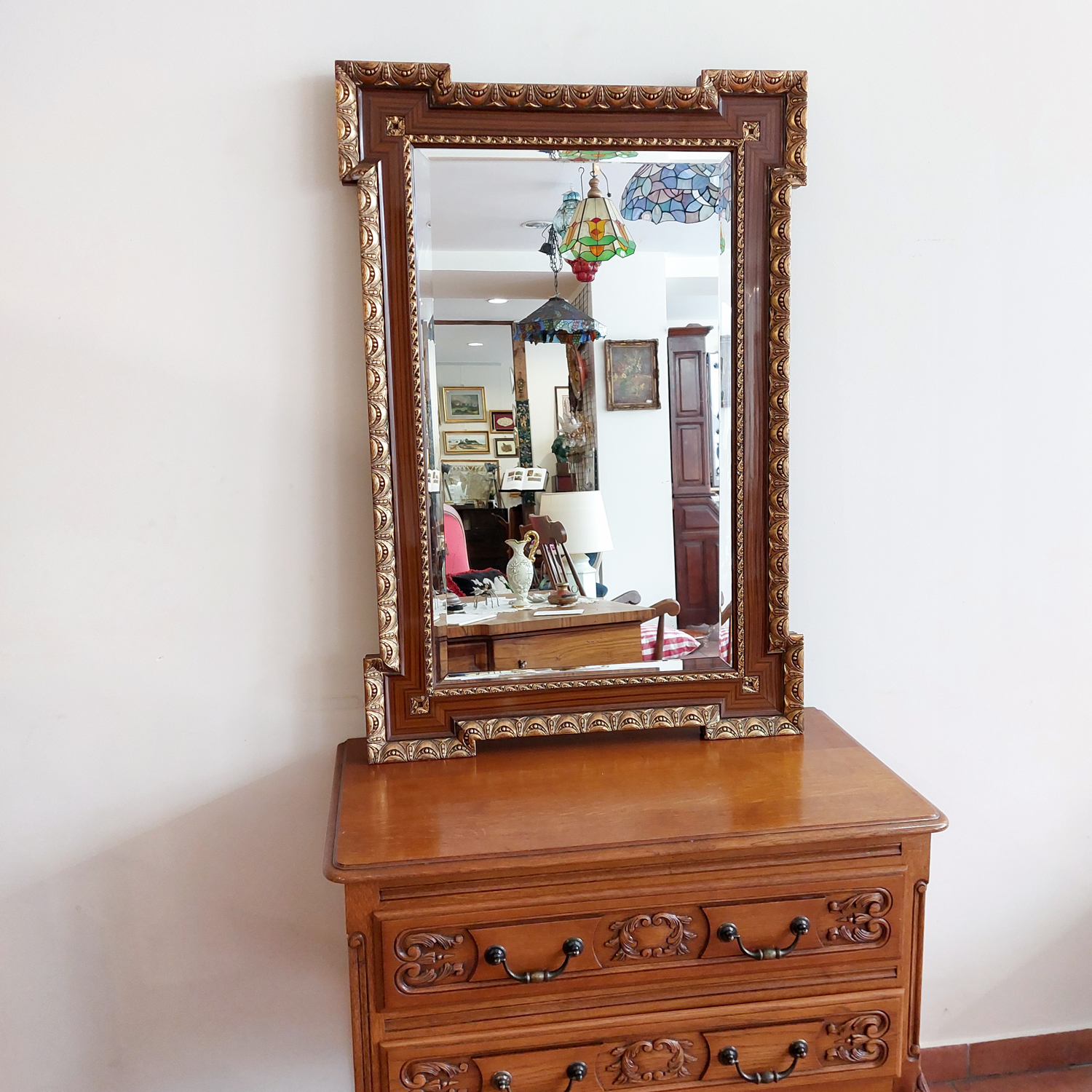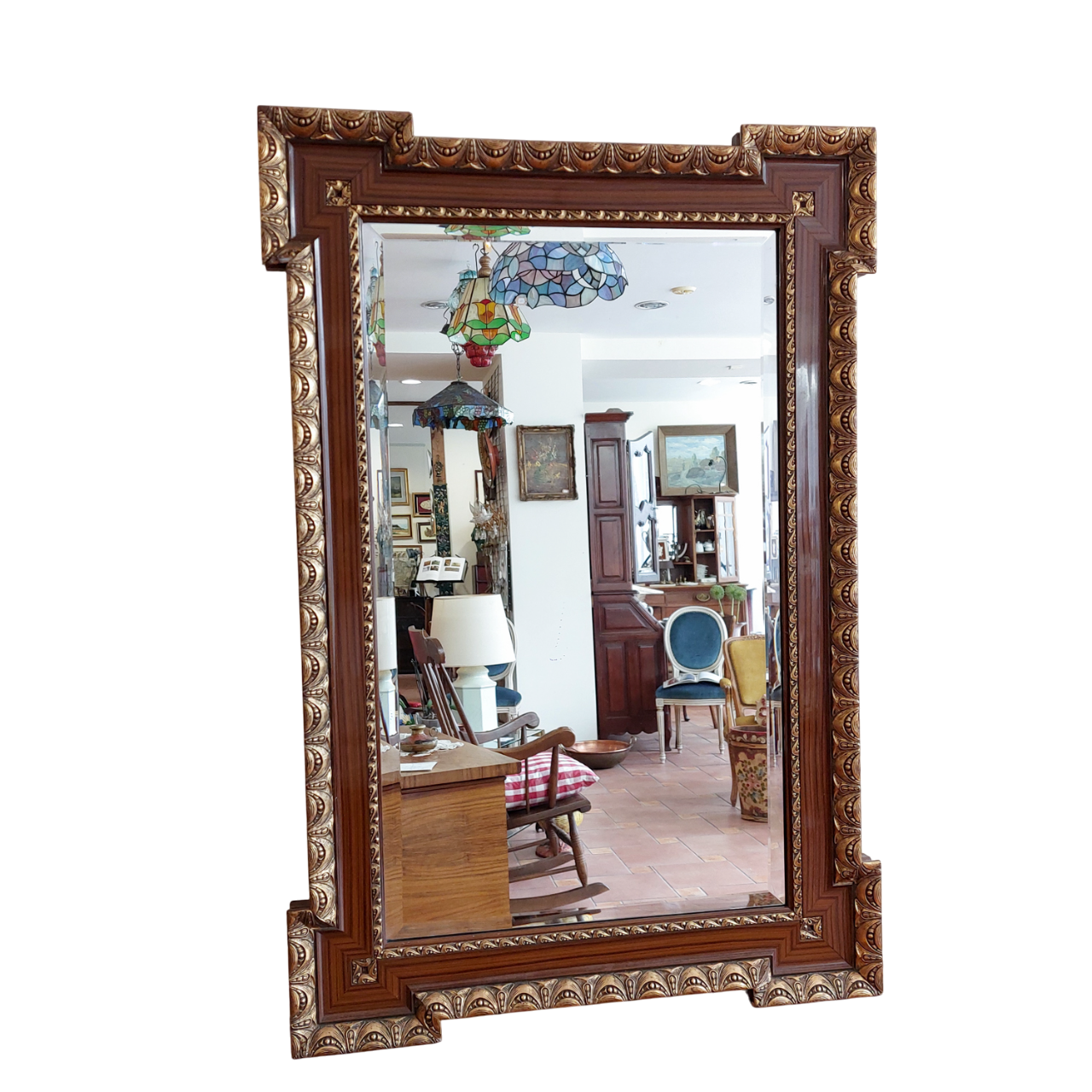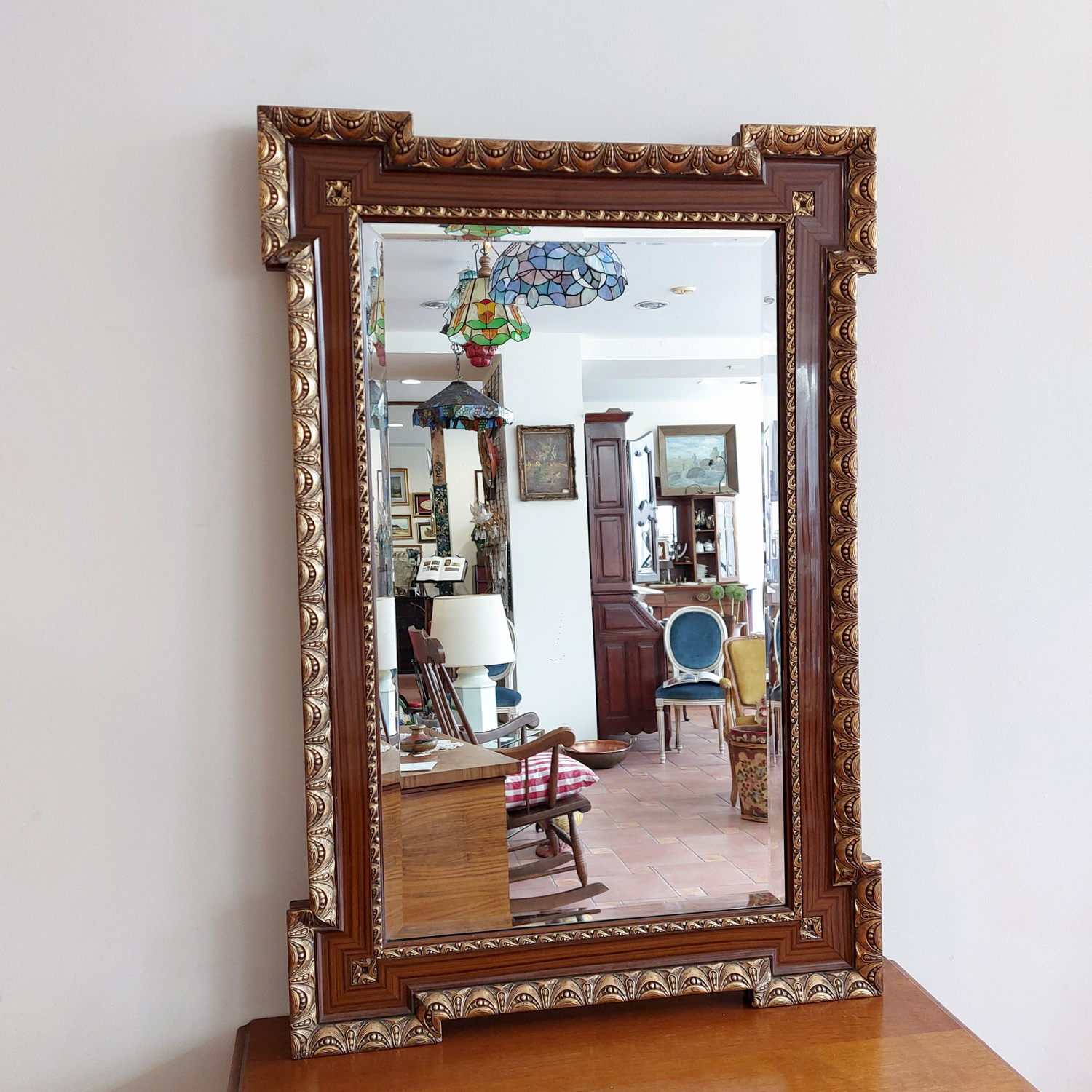 Sieninis veidrodis su dekoruotu rėmu. XX a. antroji pusė. Rėmas iš medžio konstrukcijos su laminuota apdaila. Kampai išsikišantys, dekoruoti reljefiniais auksuotais elementais. Veidrodis tvirtas, su pakabinimo grandine. Būklė gera. Parvežta iš Prancūzijos