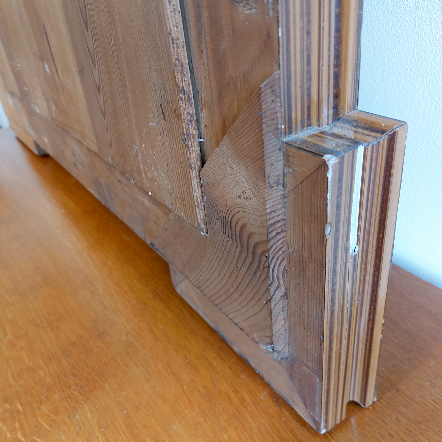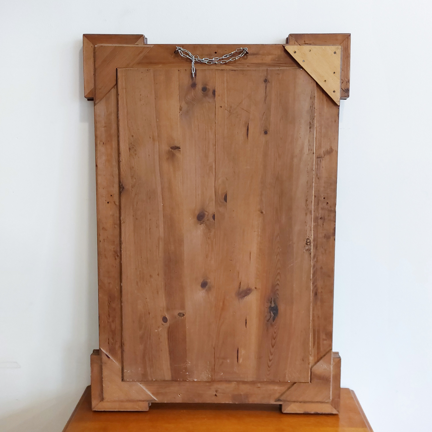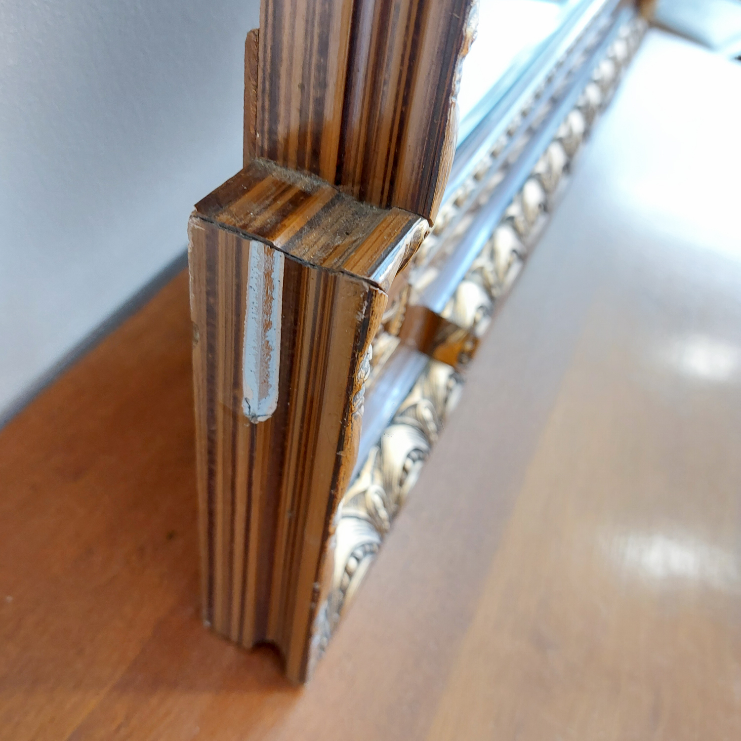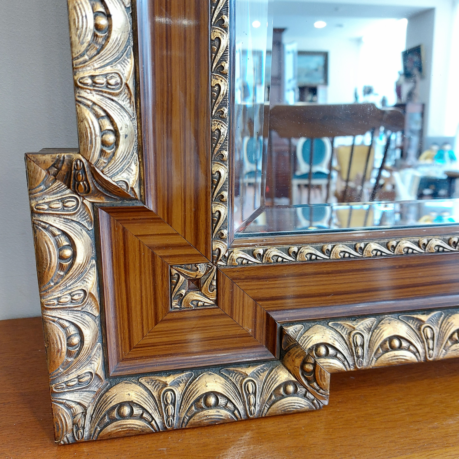 Sieninis veidrodis su dekoruotu rėmu. XX a. antroji pusė. Rėmas iš medžio konstrukcijos su laminuota apdaila. Kampai išsikišantys, dekoruoti reljefiniais auksuotais elementais. Veidrodis tvirtas, su pakabinimo grandine. Būklė gera. Parvežta iš Prancūzijos