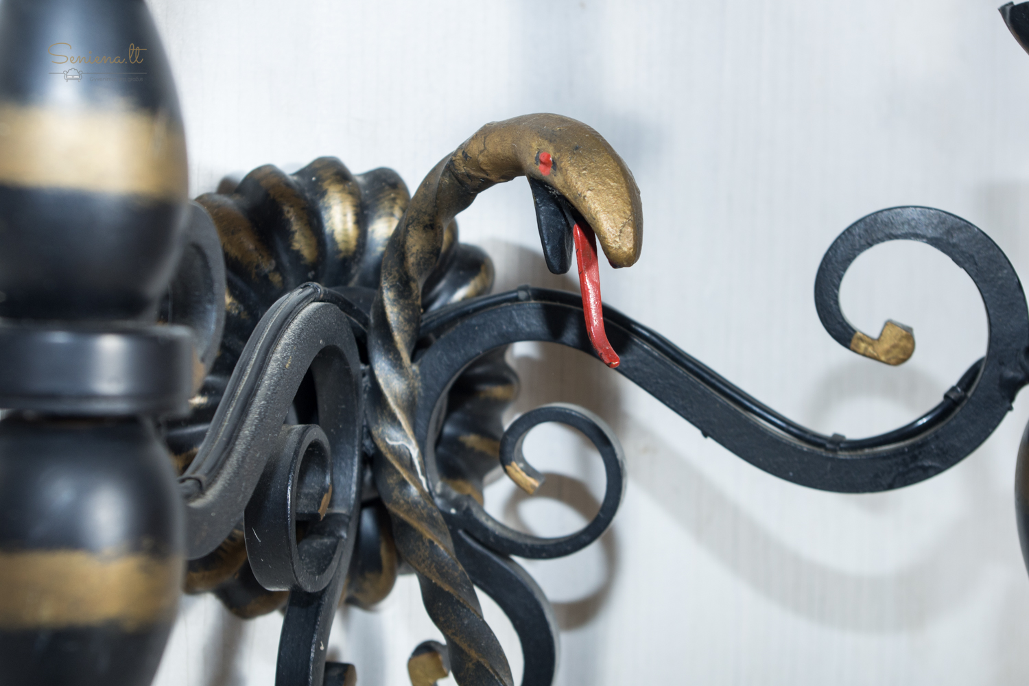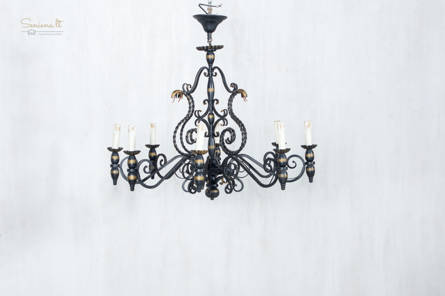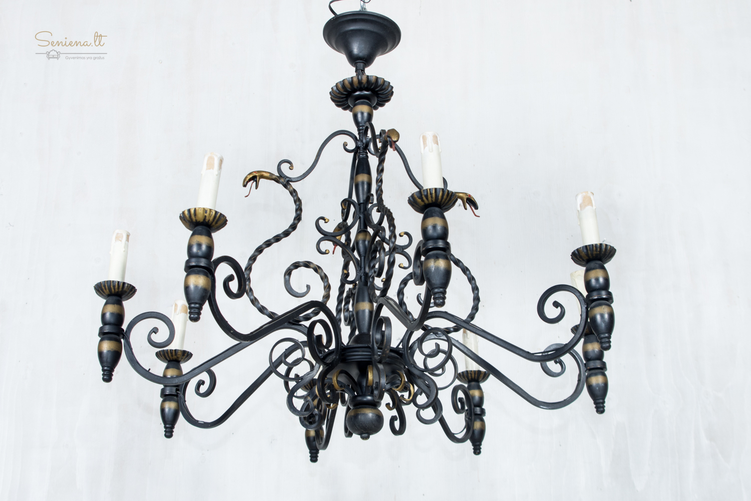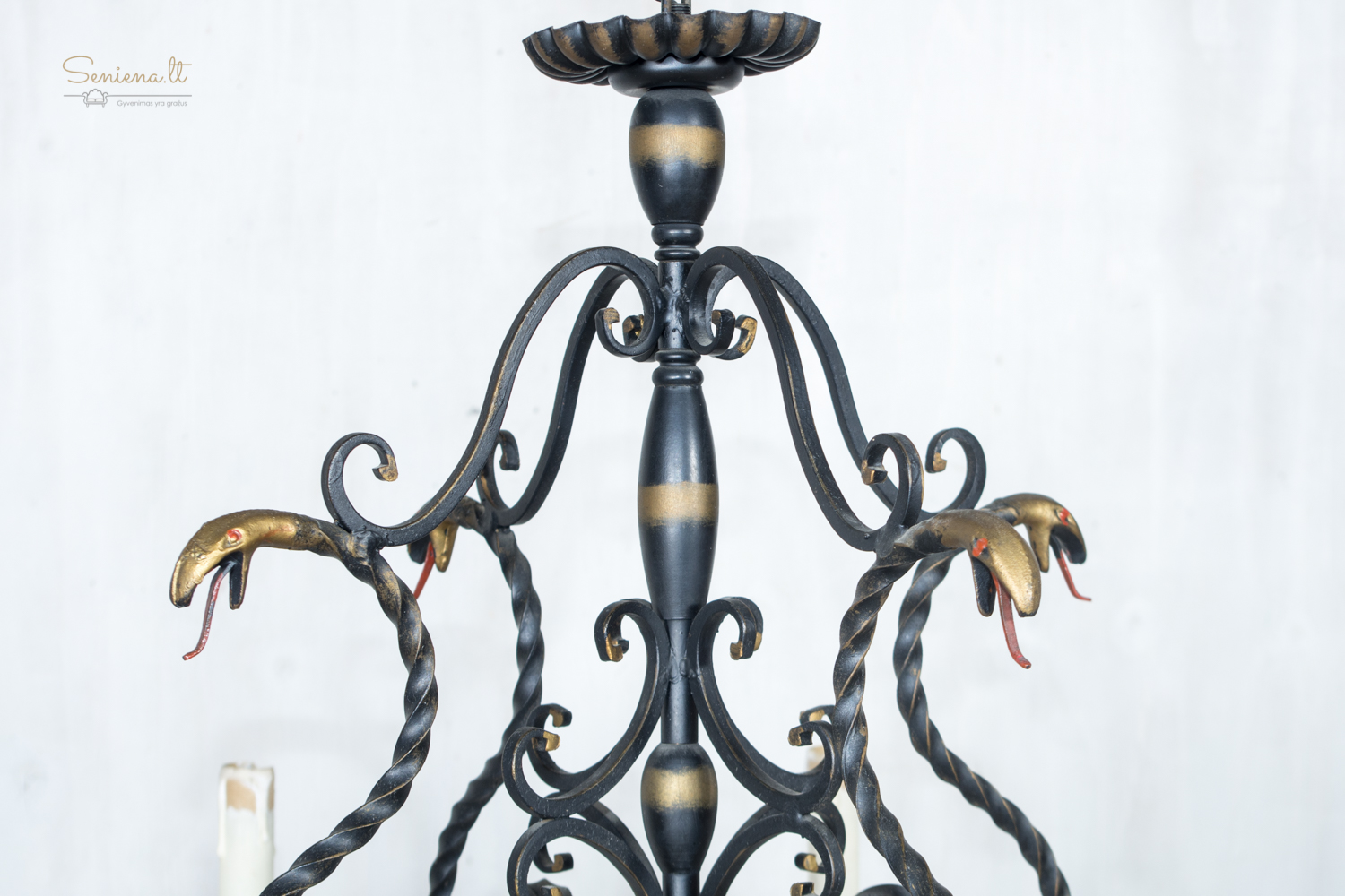 Prancūziškas kaltos geležies šviestuvų komplektas: sietynas ir bra 2 vnt šviestuvai, išsiskiriantys išraiškingu neobaroko ir gotikos stilistikos deriniu. Juodo metalo konstrukcija dekoruota aukso patina, o gyvatiškos formos detalės suteikia kompozicijai teatrališkumo ir charakterio. Apie 1940–1960 m.