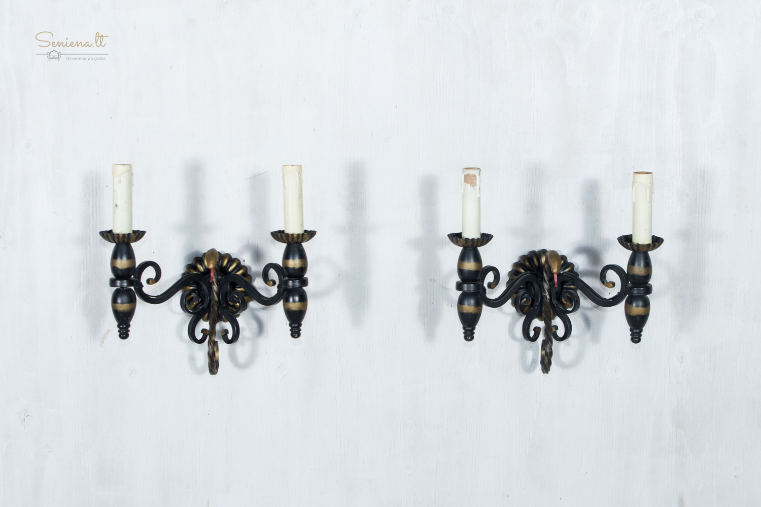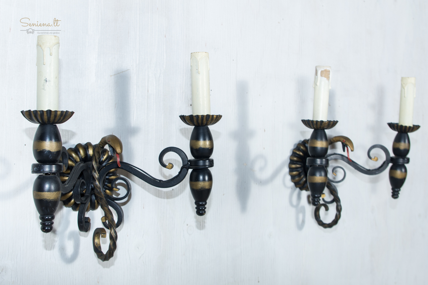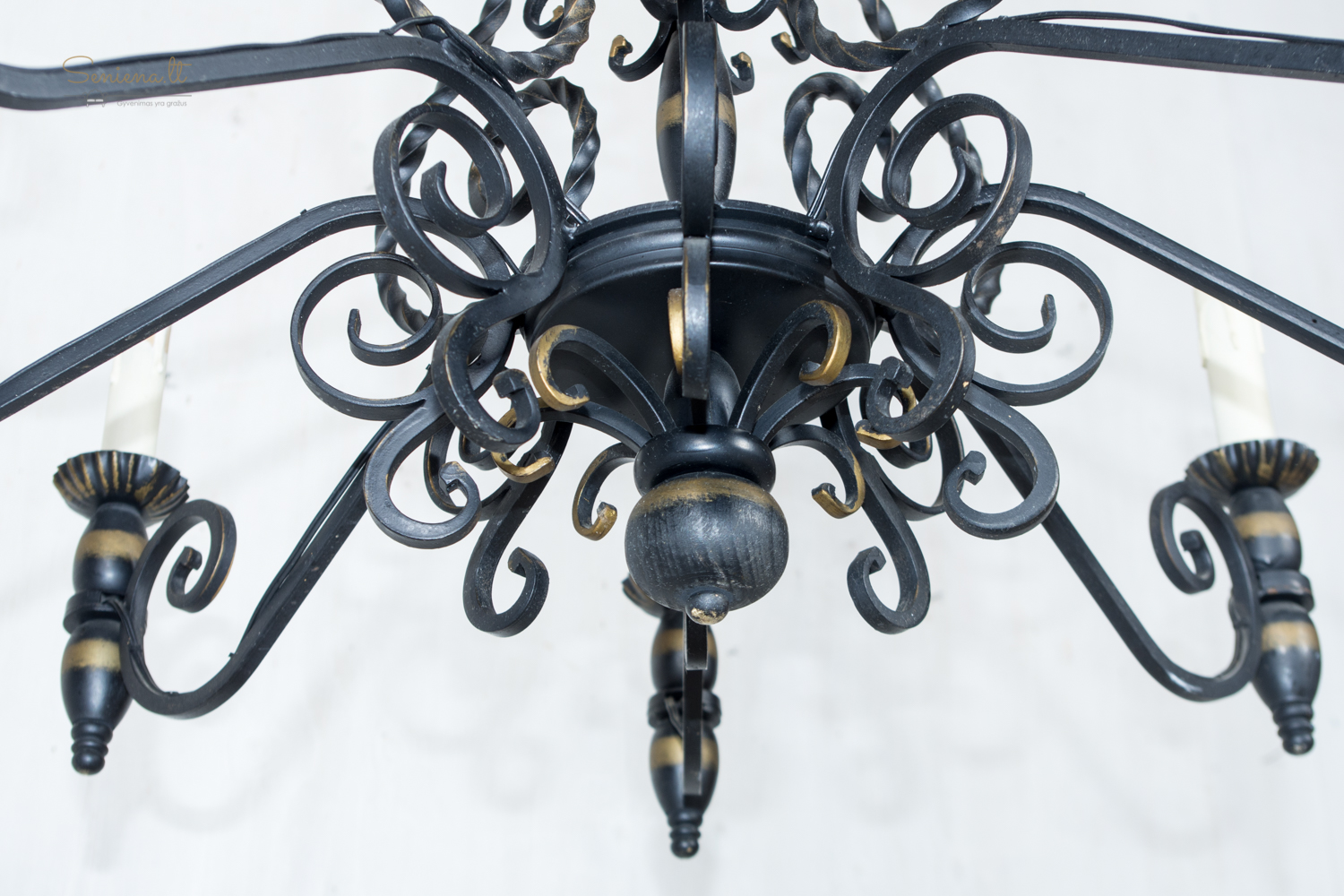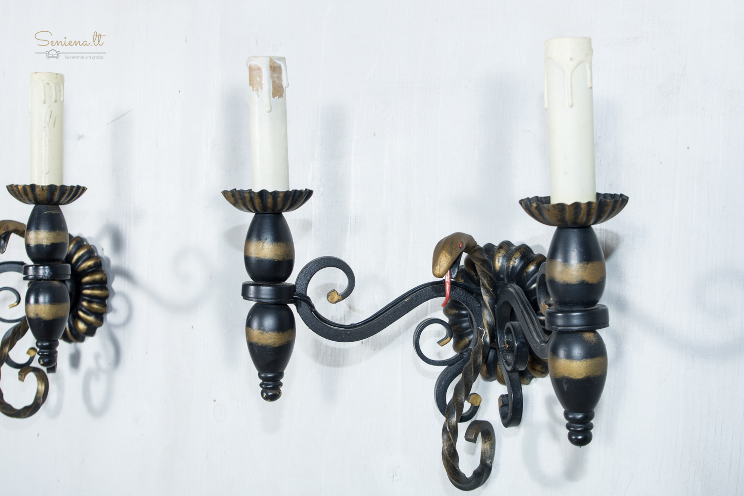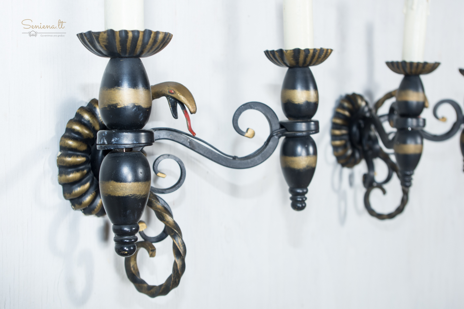Prancūziškas kaltos geležies šviestuvų komplektas: sietynas ir bra 2 vnt šviestuvai, išsiskiriantys išraiškingu neobaroko ir gotikos stilistikos deriniu. Juodo metalo konstrukcija dekoruota aukso patina, o gyvatiškos formos detalės suteikia kompozicijai teatrališkumo ir charakterio. Apie 1940–1960 m.