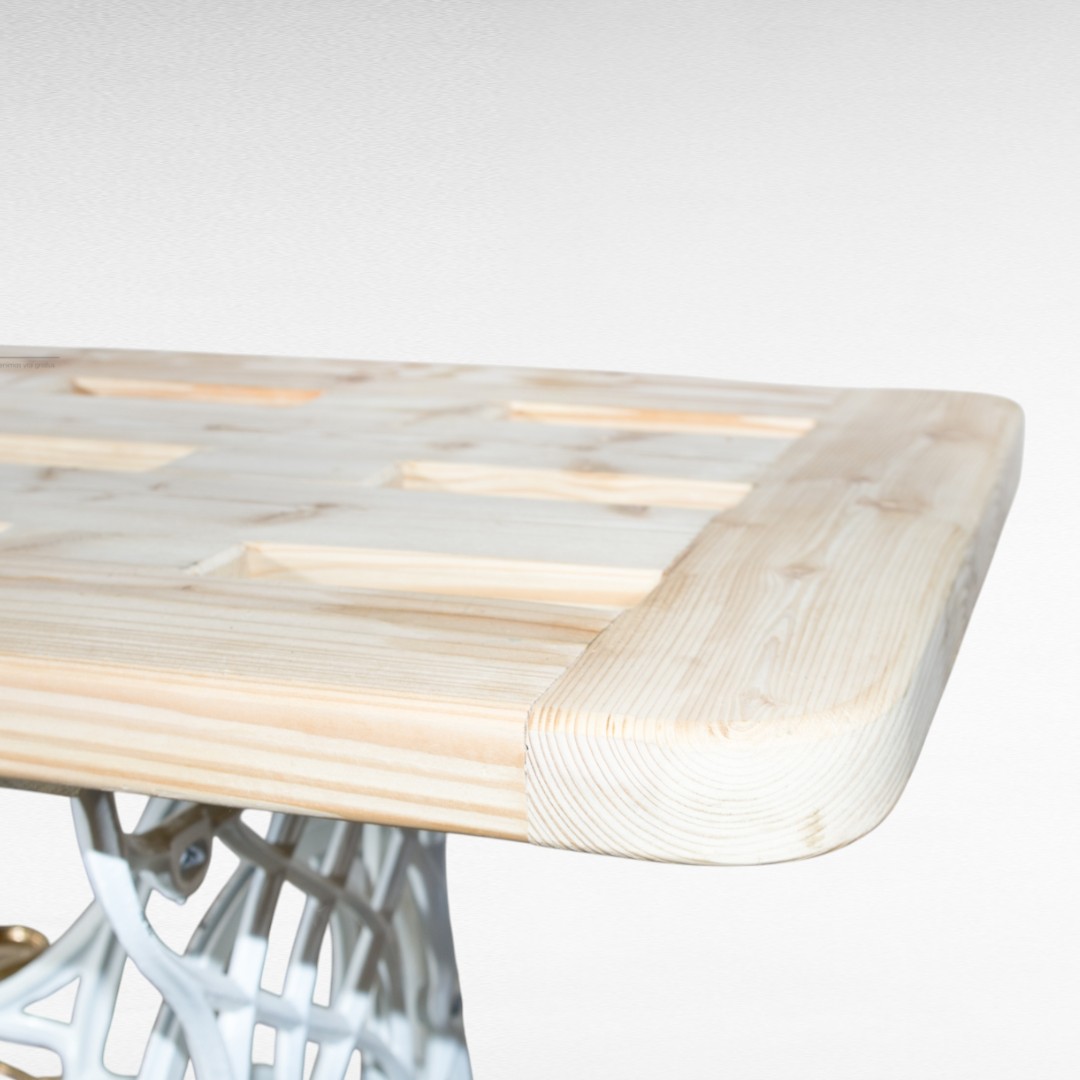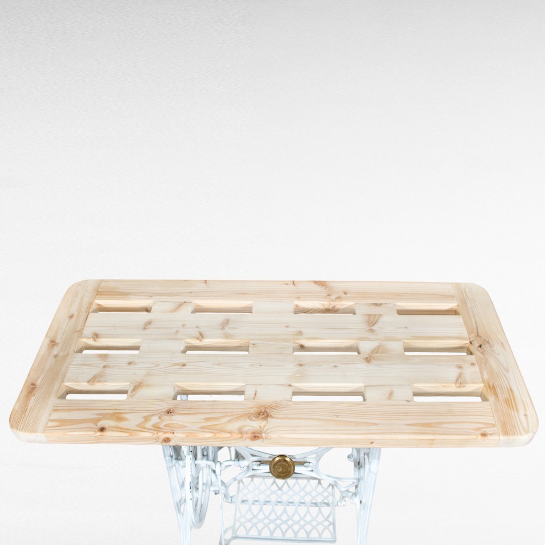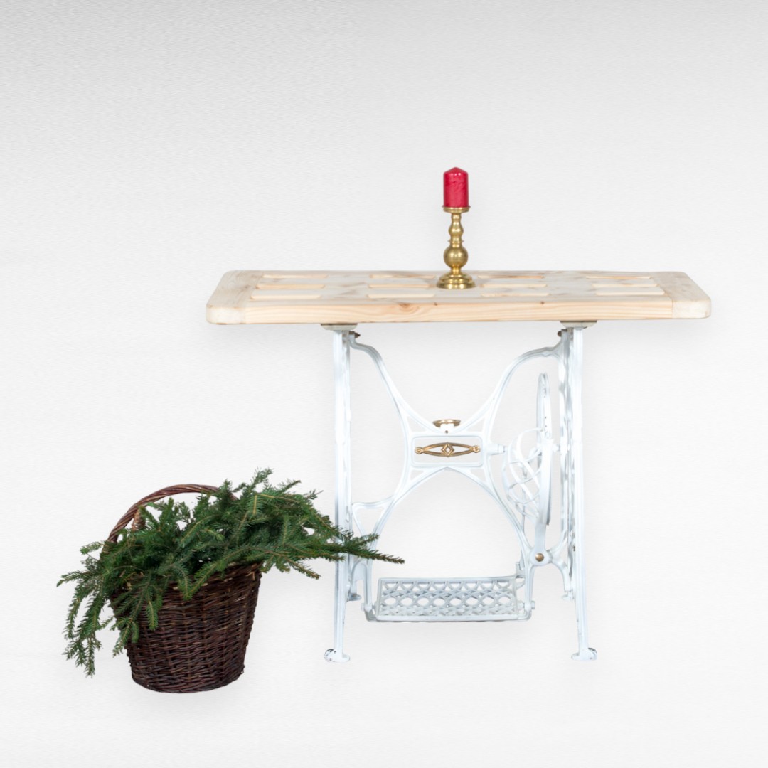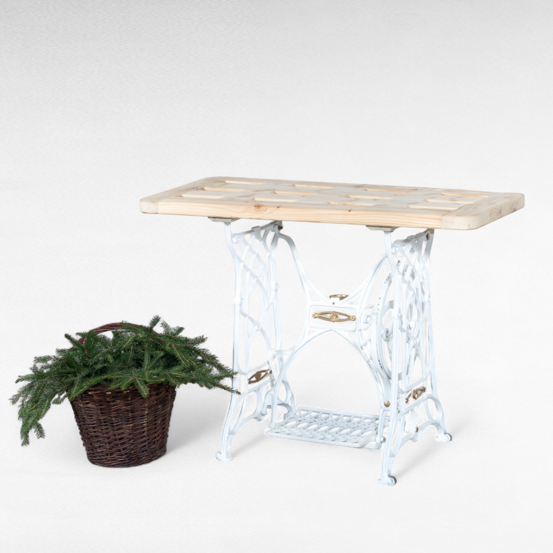Siuvimo mašinos staliukas. Ant seno ketaus siuvimo mašinos pagrindo suformuotas naujas medinis stalviršis.