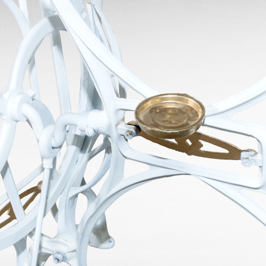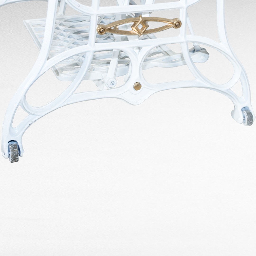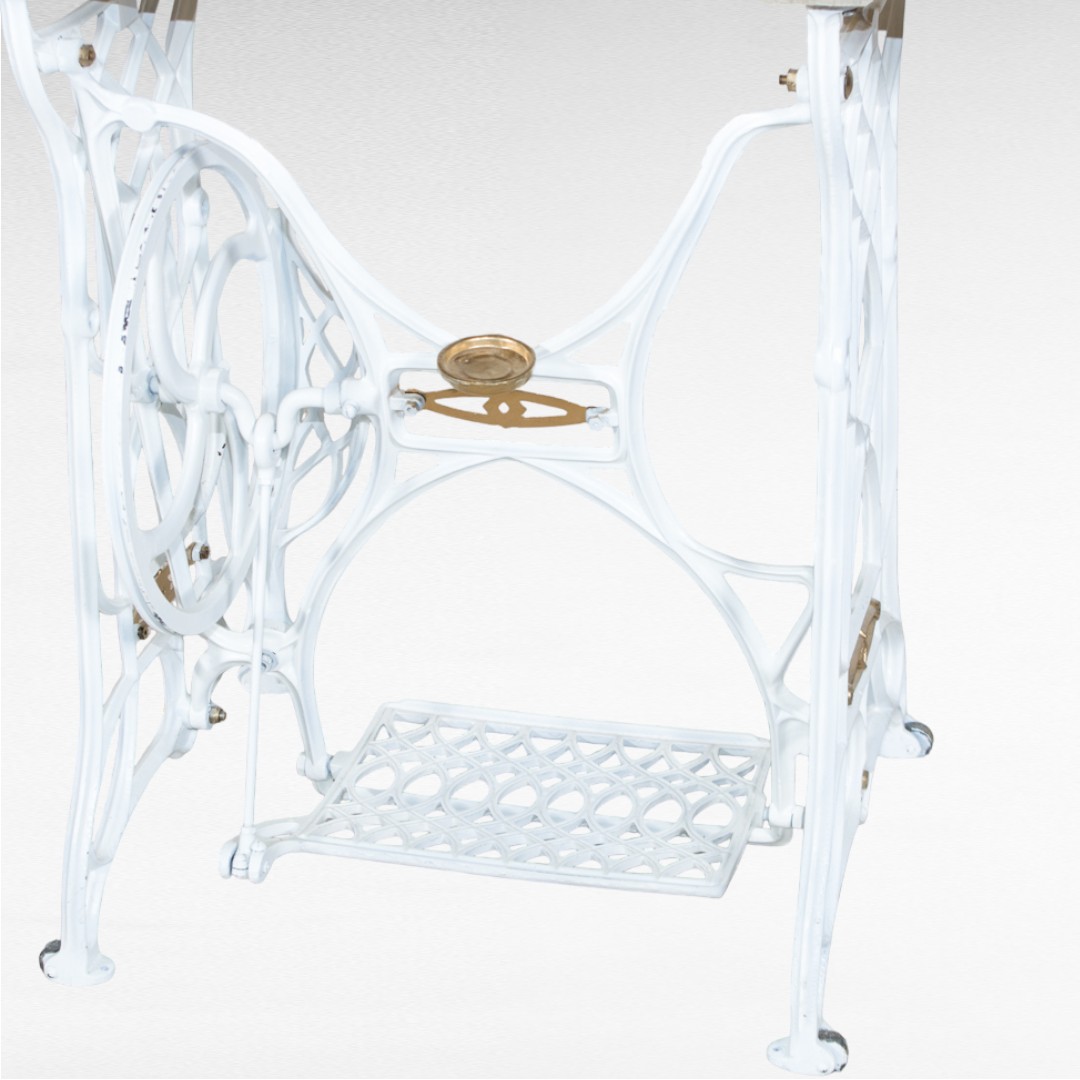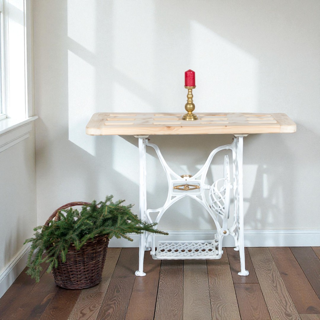 Siuvimo mašinos staliukas. Ant seno ketaus siuvimo mašinos pagrindo suformuotas naujas medinis stalviršis.