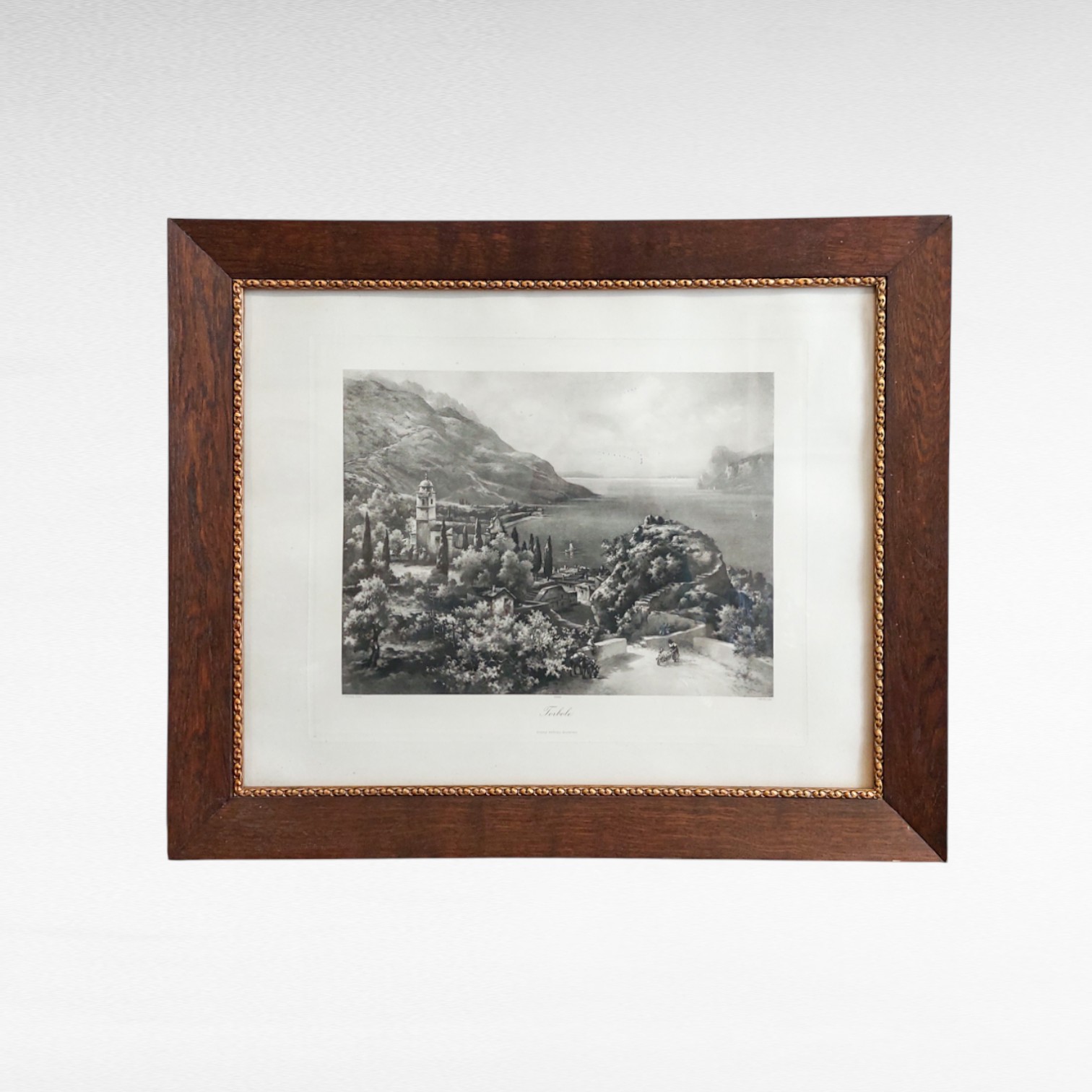 Spaudinys pagal J. Fanti kūrinį, vaizduojantis Torbole miestelį prie Gardos ežero, atspaustas chromolitografijos technika ir įrėmintas mediniu rėmu.