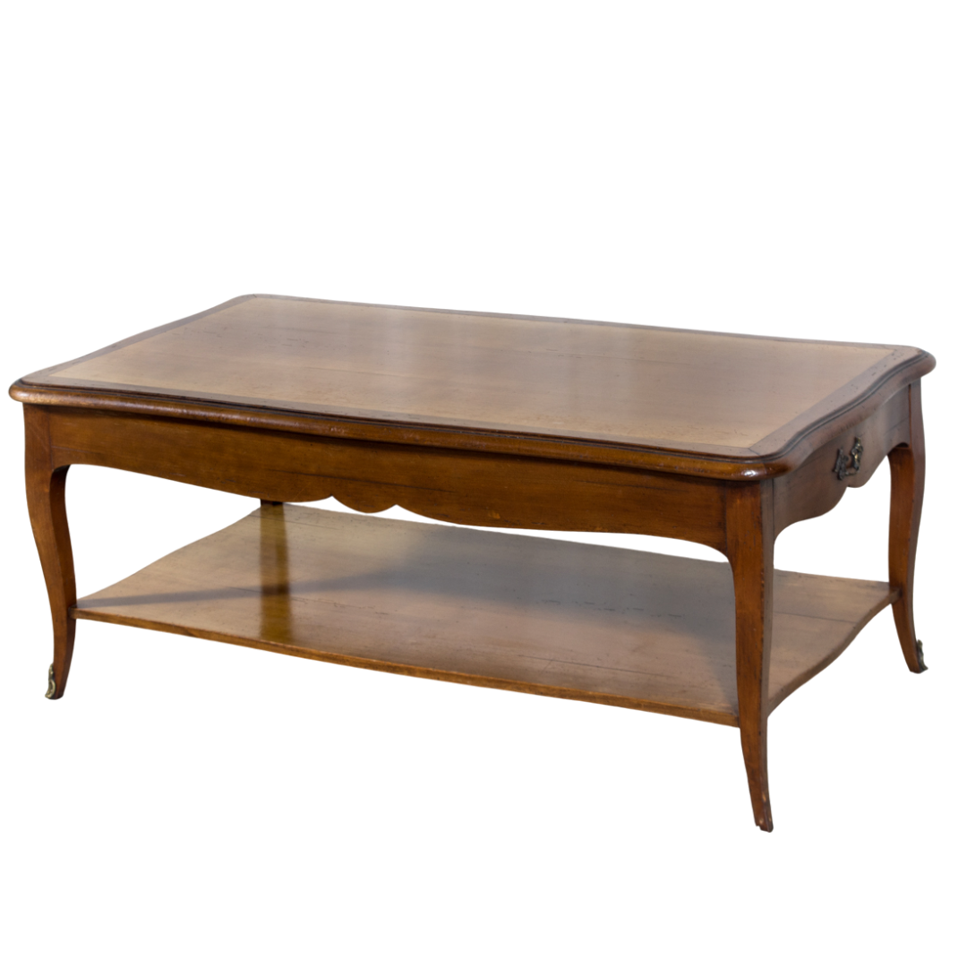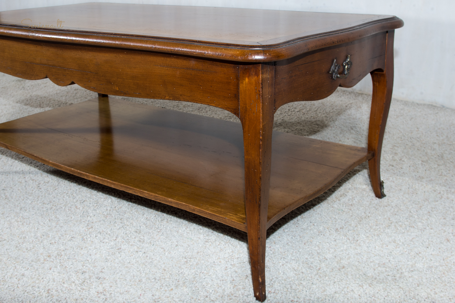 Medinis kavos staliukas, XX a. vid., atvežtas iš Prancūzijos. Banguoti kraštai, lenktos kojelės, šoninis stalčius su metaline rankenėle. Kojeles puošia žalvario apkaustai, vieno trūksta. Apačioje papildoma lentyna. Matosi naudojimo pėdsakai, tačiau staliukas išlikęs tvirtas ir praktiškas.