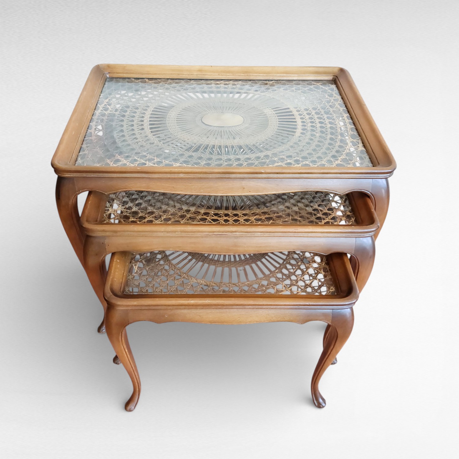 Trijų stalelių komplektas su ratanu po stiklu.