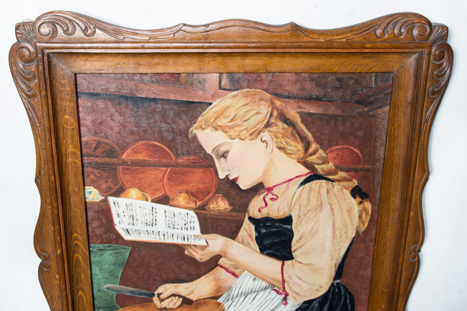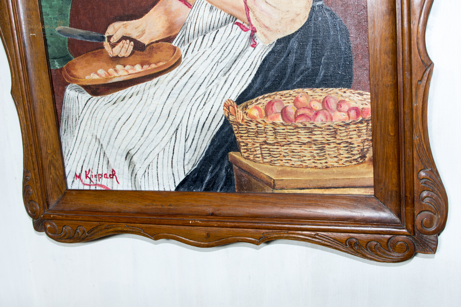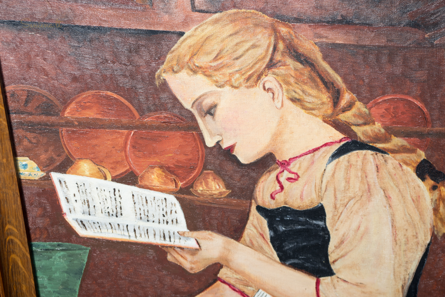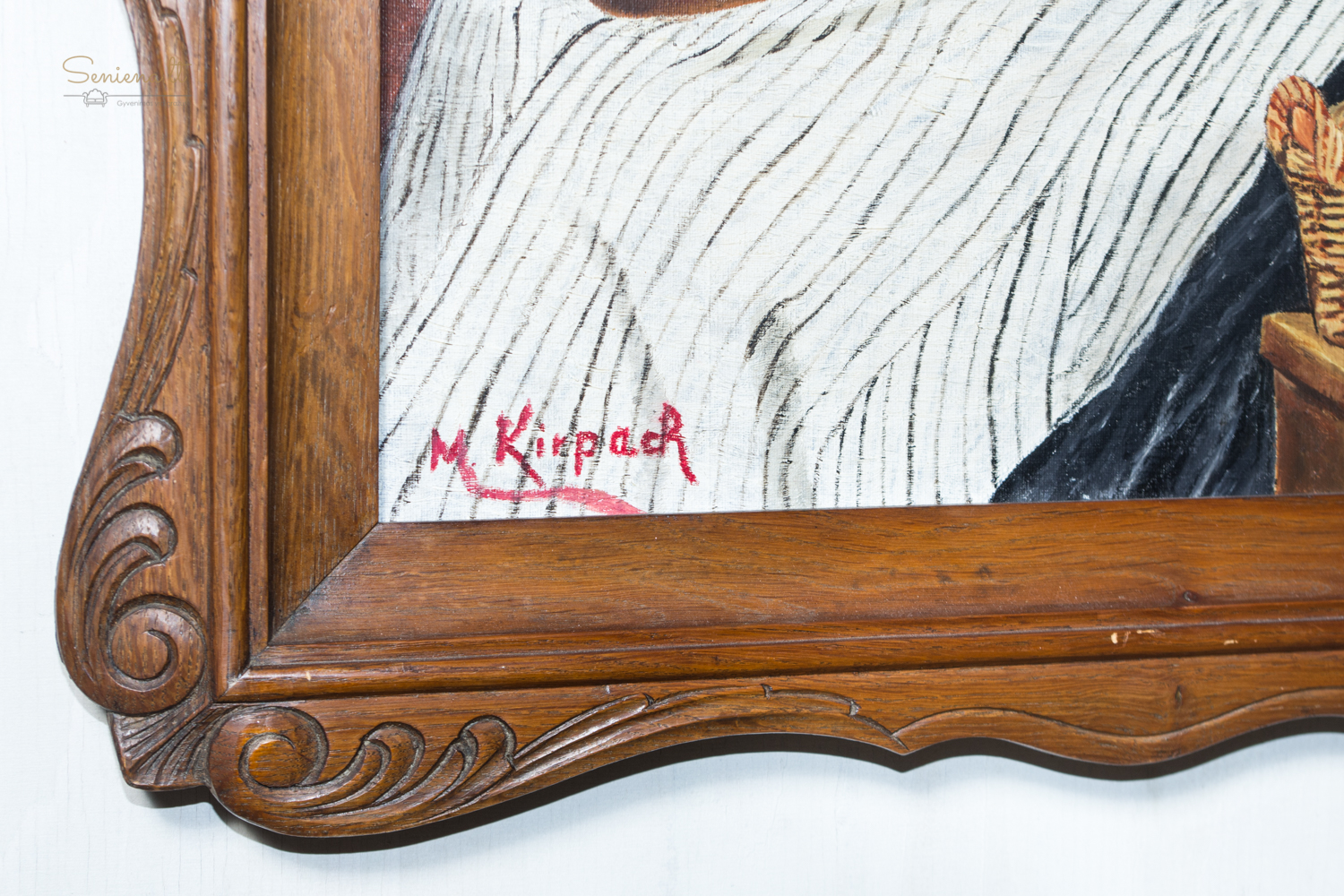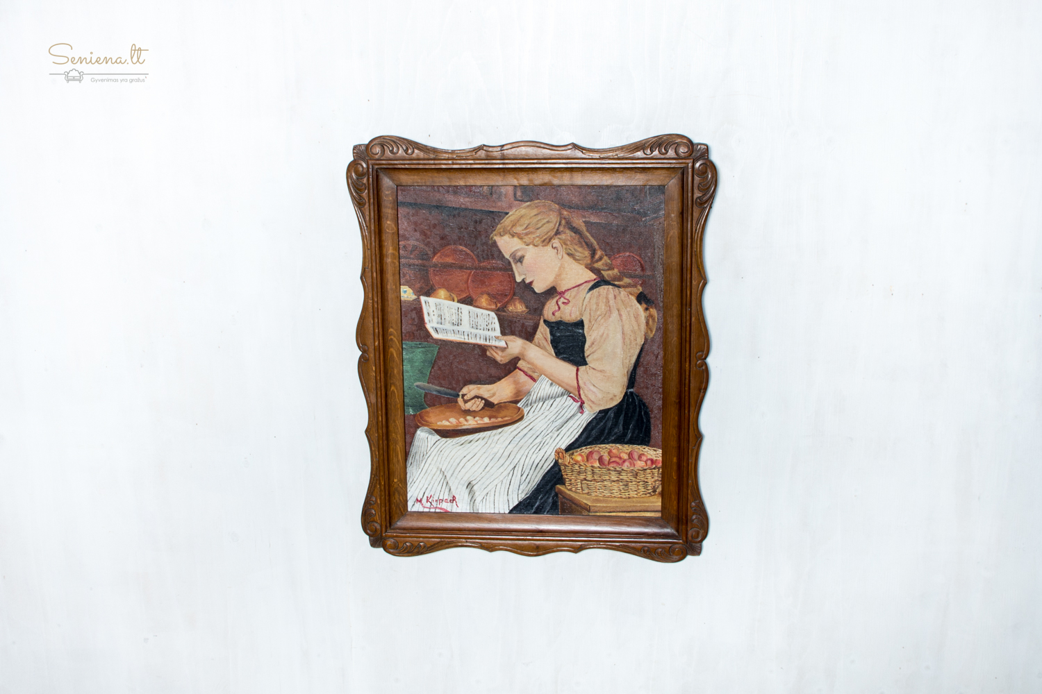 Tai yra garsaus šveicarų dailininko Albert Anker (1831-1910 m.) kūrinio “Skaitanti mergaitė su obuoliais” kopija, pertapyta ir pasirašyta M. Kirpach vardu. Albert Anker kūriniai vertinami už detalumą, šilumą ir gebėjimą perteikti žmogaus emocijas. Jis ypač išgarsėjo dėl vaikų portretų.