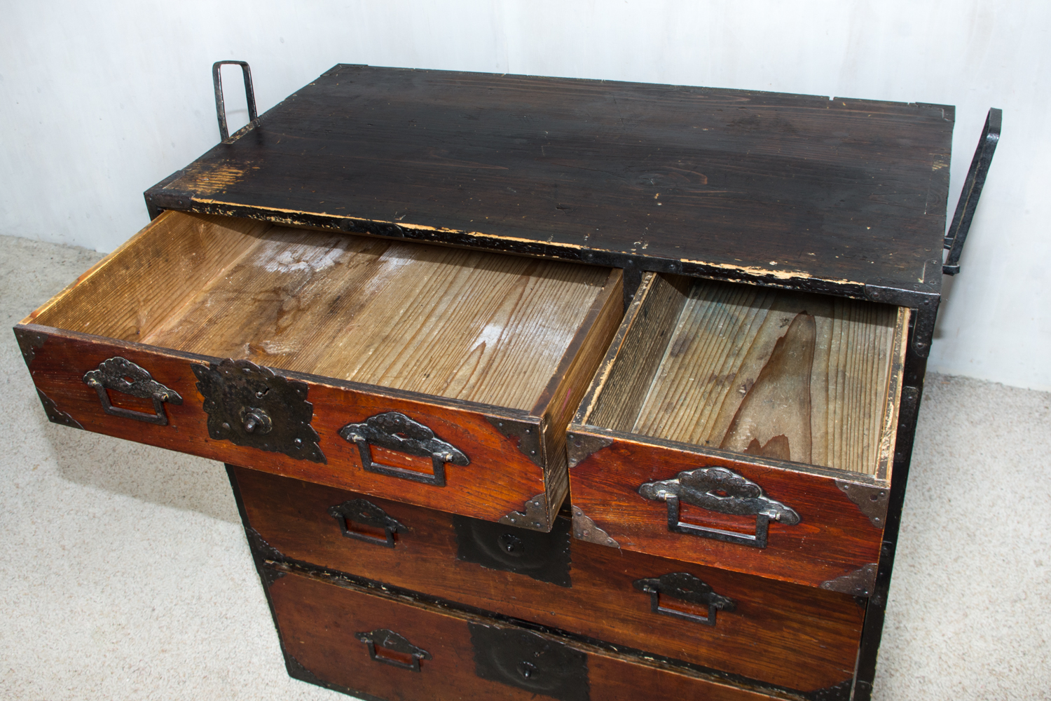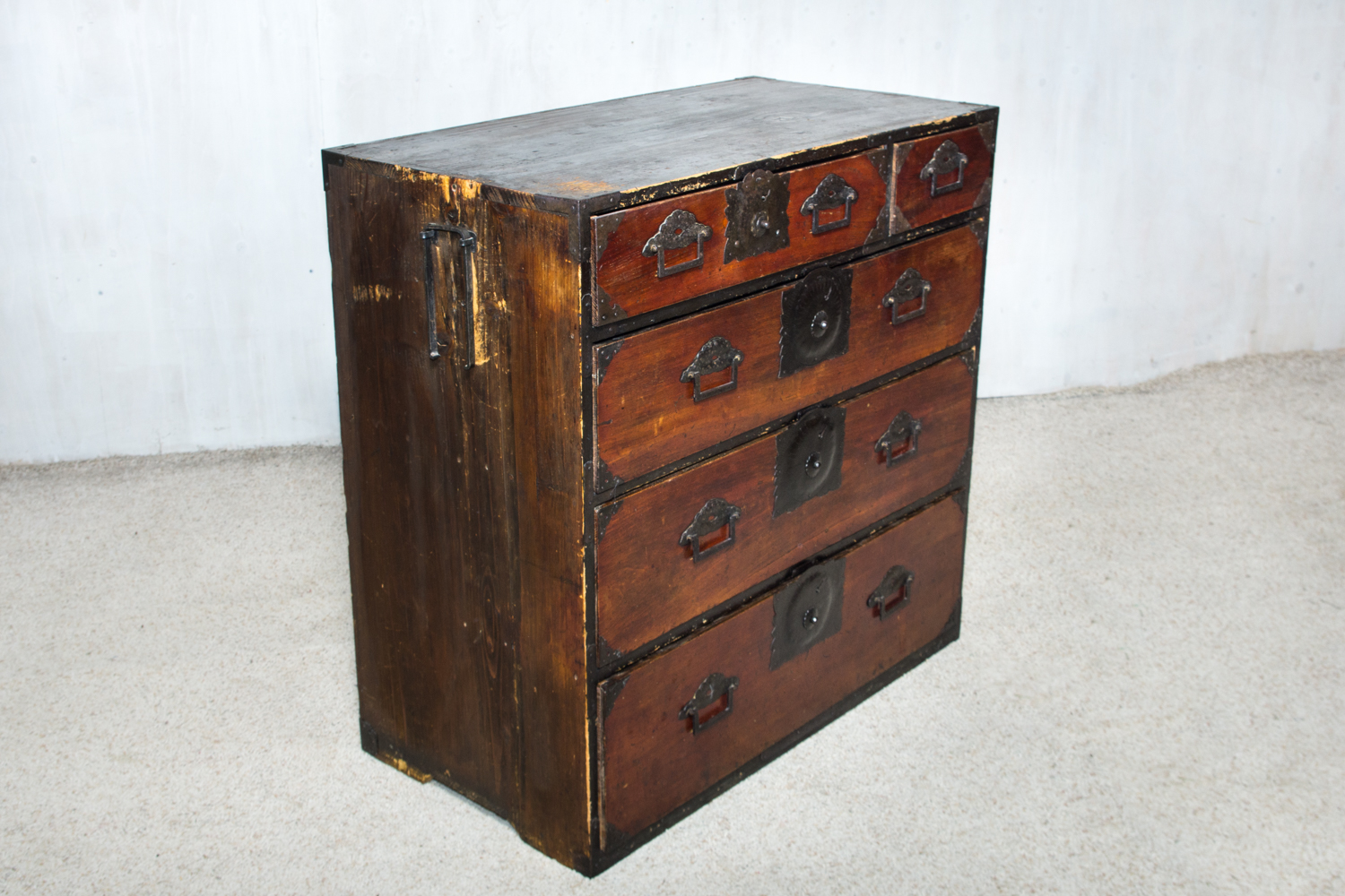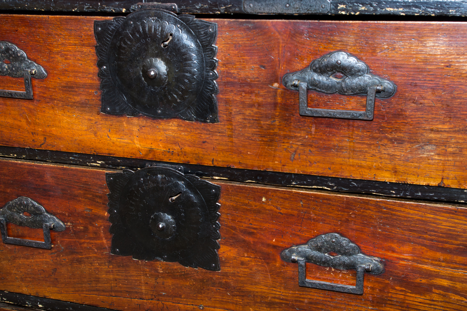 Tradicinė japoniška Ko-dansu komoda, datuojama Meidži laikotarpiu (1868–1912). Pagaminta iš natūralios medienos, greičiausiai kedro. Komoda išsiskiria rankų darbo juodinto metalo apkaustais su tradiciniais japoniškais motyvais. Stalčiai lengvai darinėjasi, geros būklės.