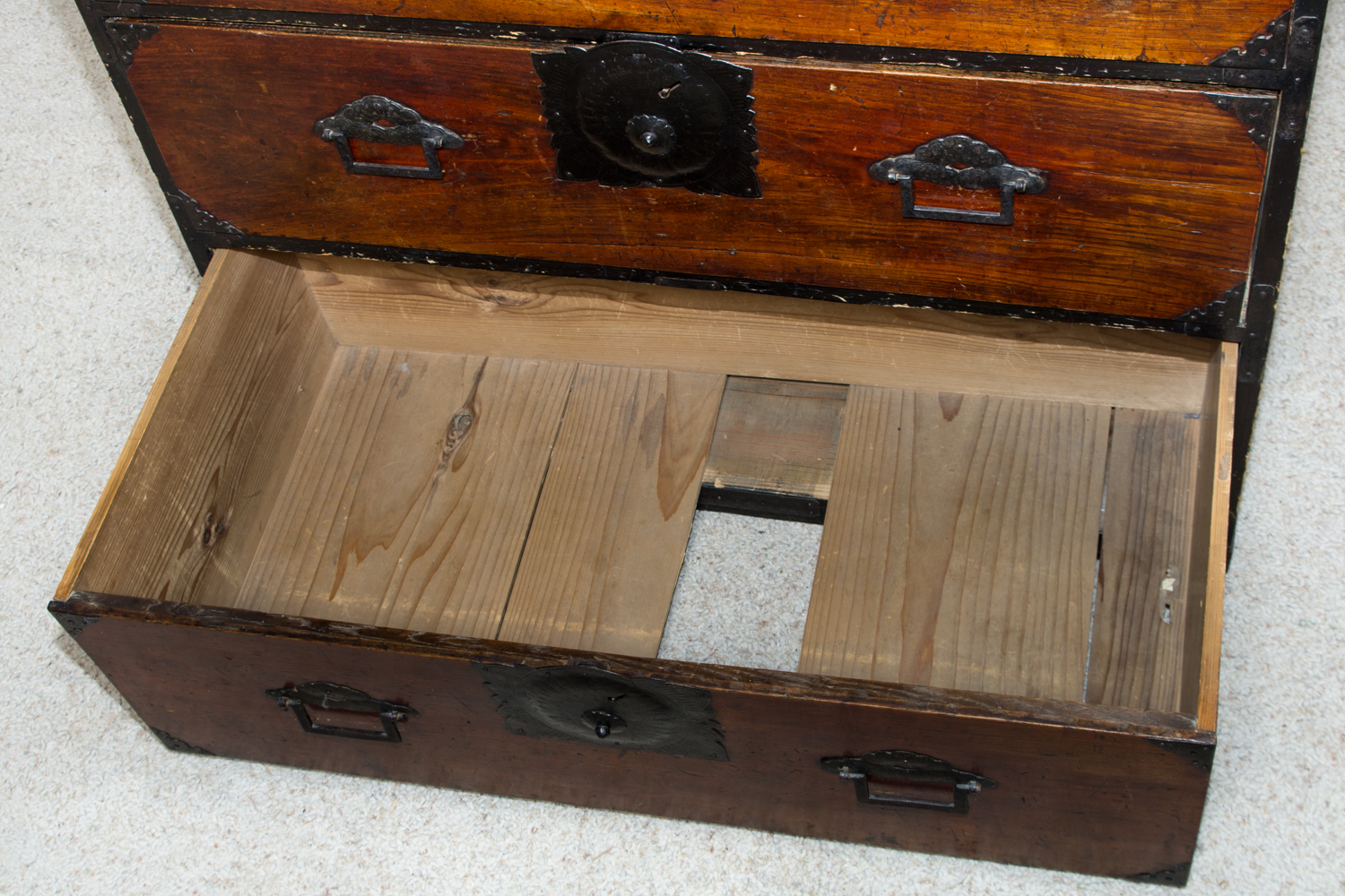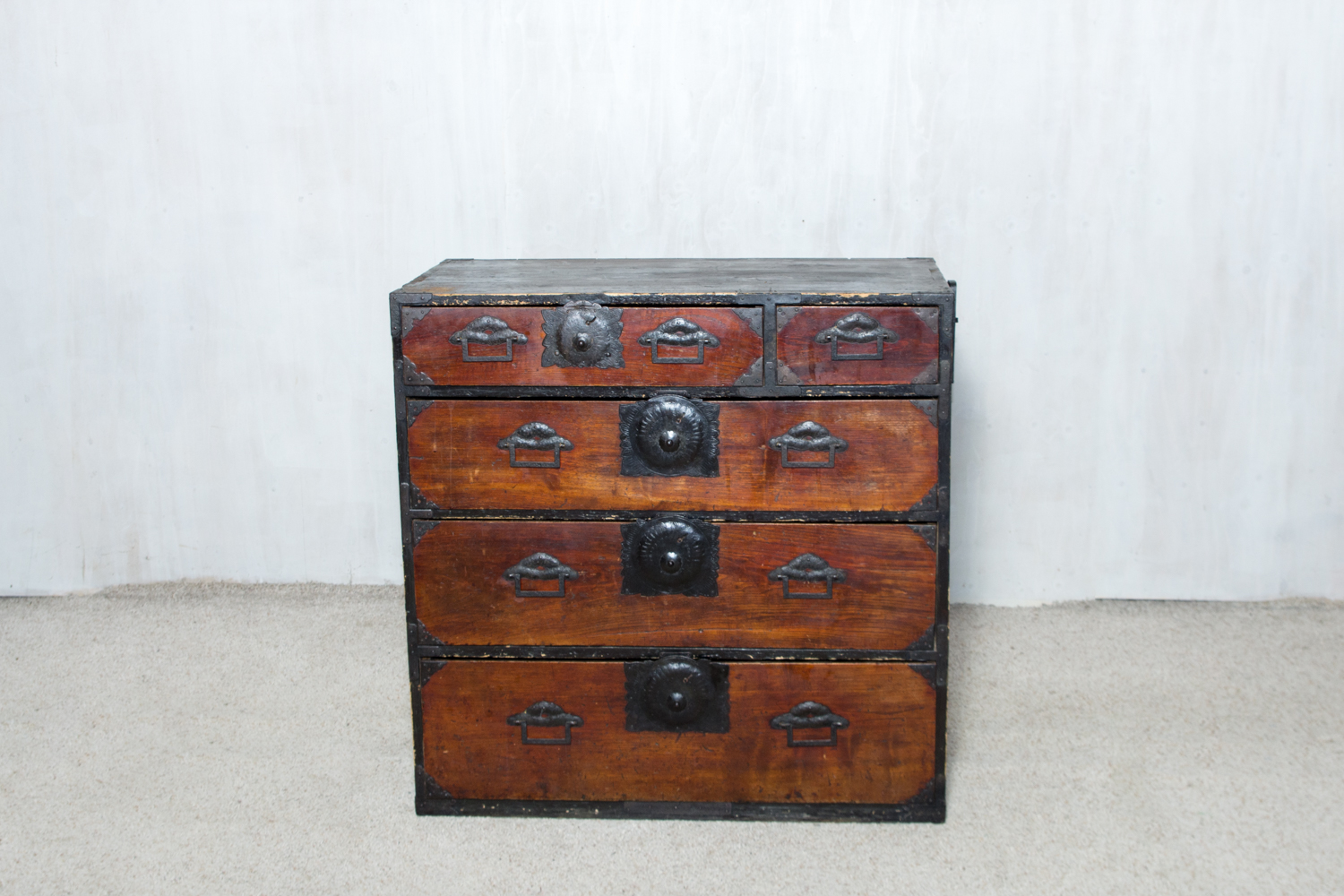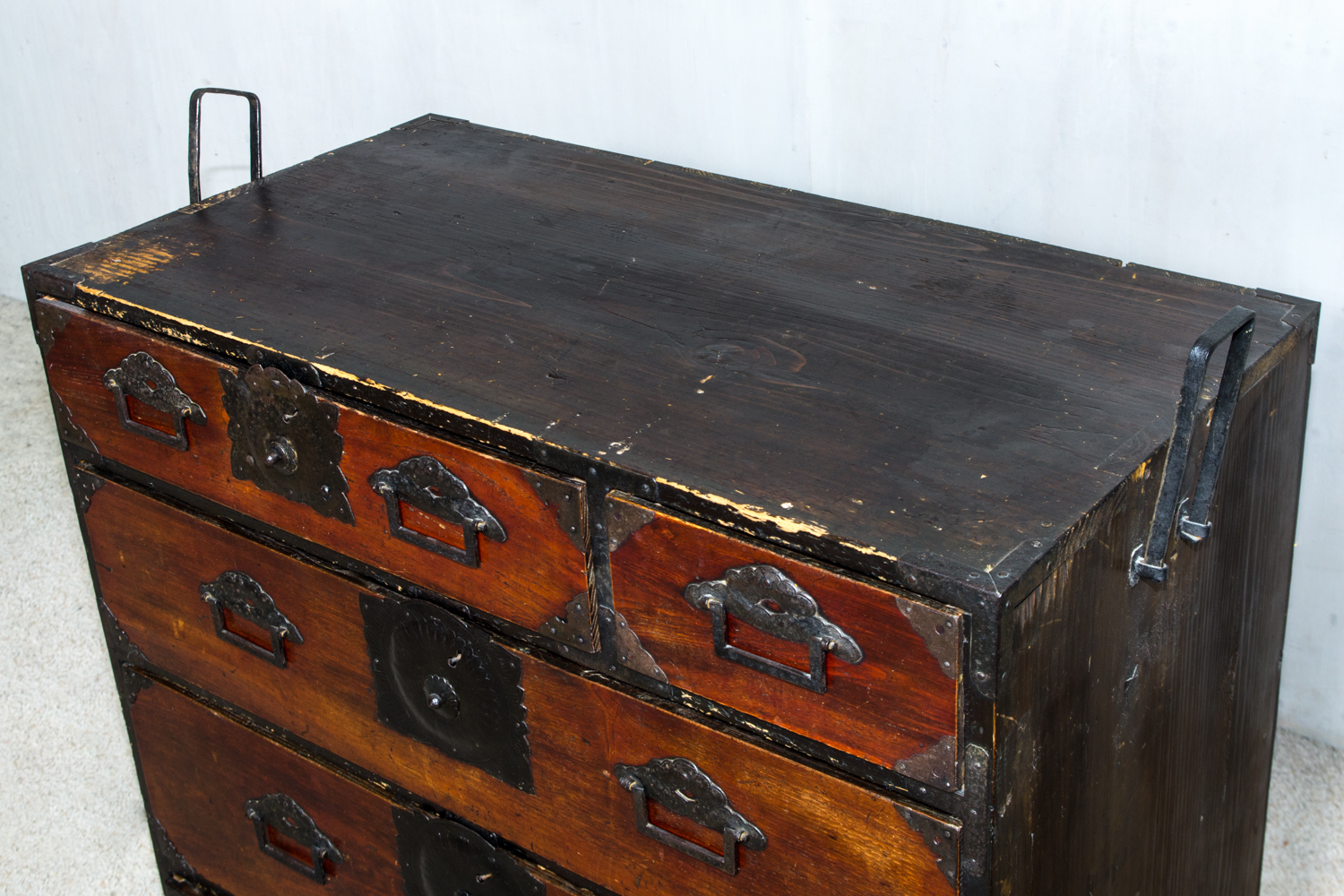 Tradicinė japoniška Ko-dansu komoda, datuojama Meidži laikotarpiu (1868–1912). Pagaminta iš natūralios medienos, greičiausiai kedro. Komoda išsiskiria rankų darbo juodinto metalo apkaustais su tradiciniais japoniškais motyvais. Stalčiai lengvai darinėjasi, geros būklės.