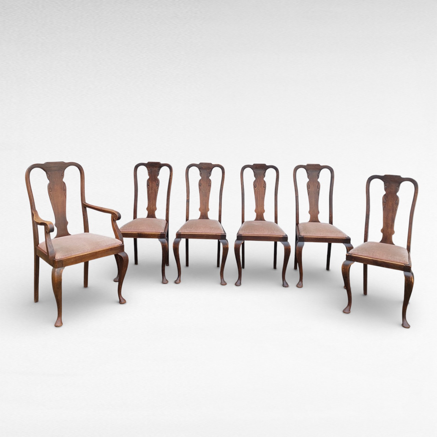 Antikvarinės valgomojo kėdės su lenktomis kojomis ir raižytu atlošo viduriu. Komplekte penkios kėdės be porankių ir viena su porankiais. Audinys švelnaus barchato, visos kėdės stabilios, matosi natūralių naudojimo žymių.  Apie 1930–1950 m. Parvežta iš Prancūzijos.