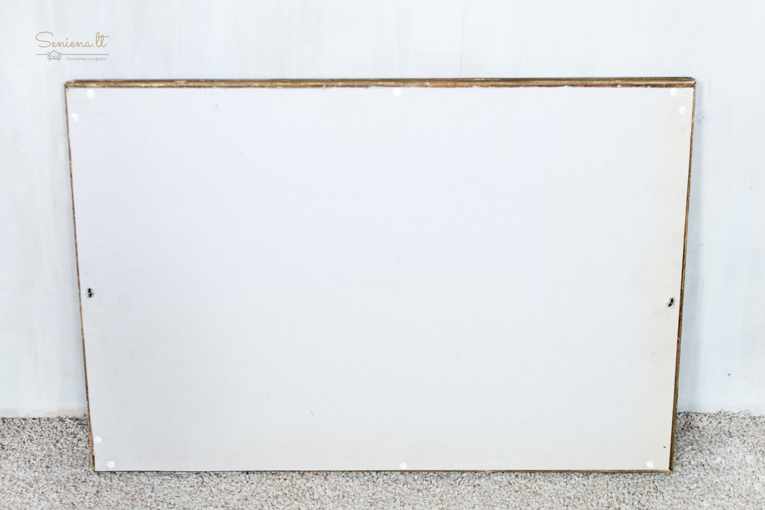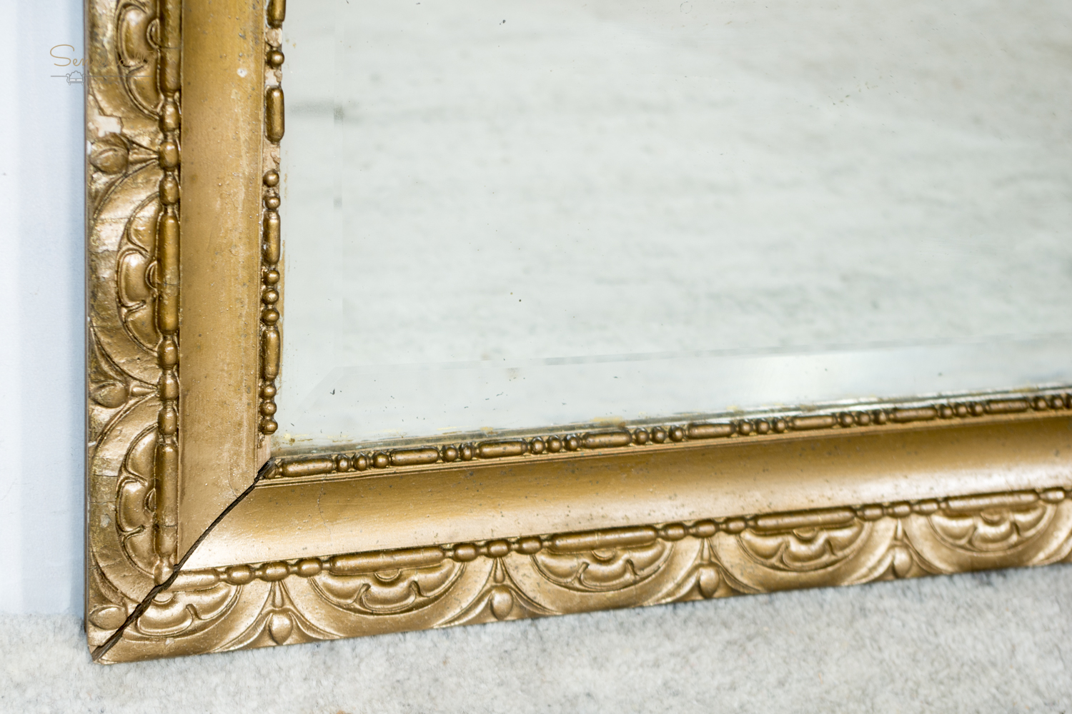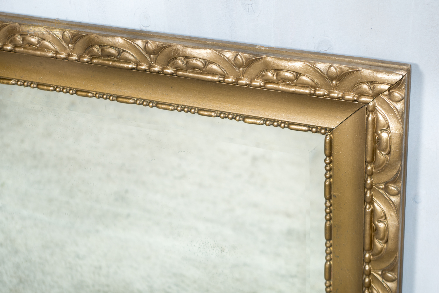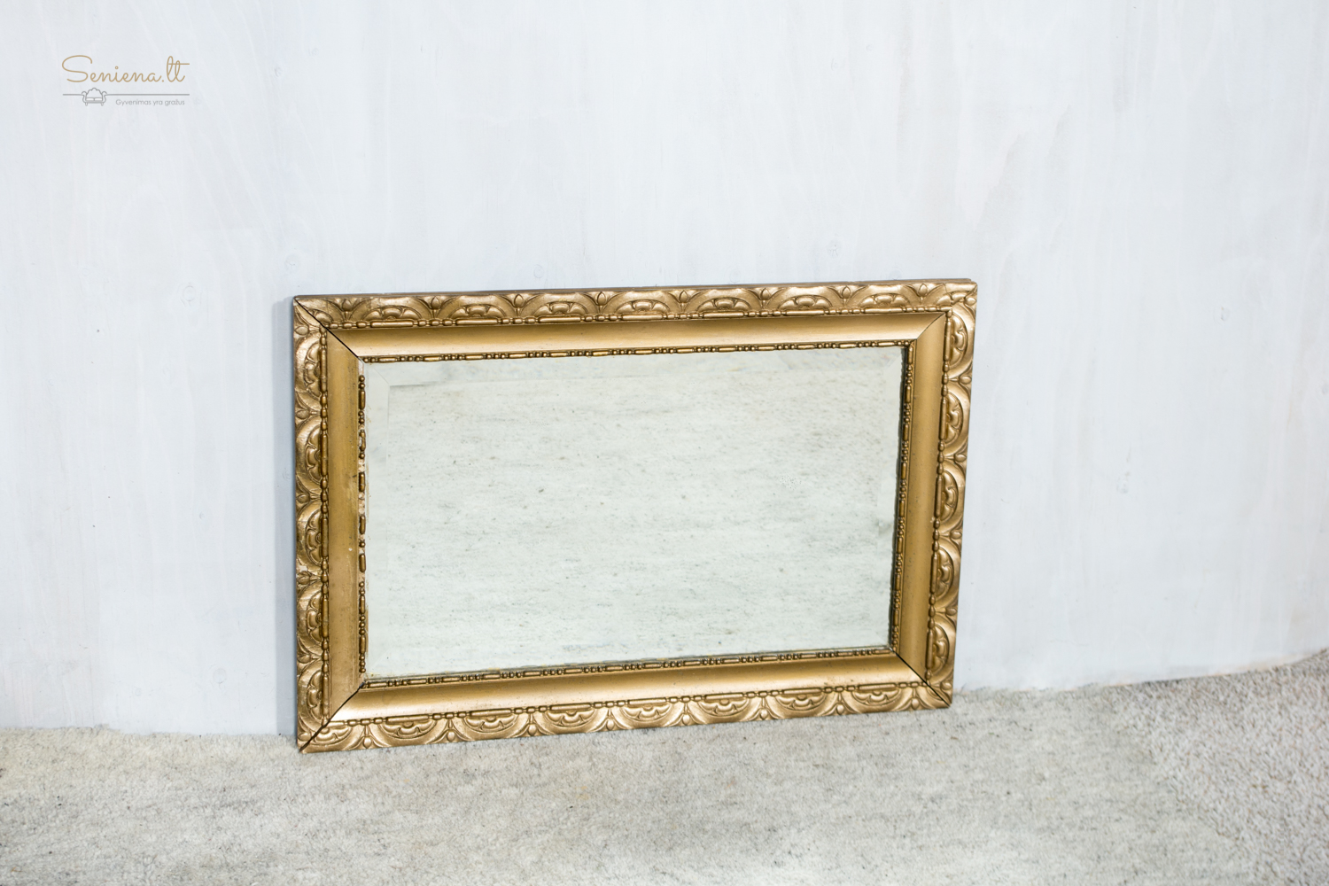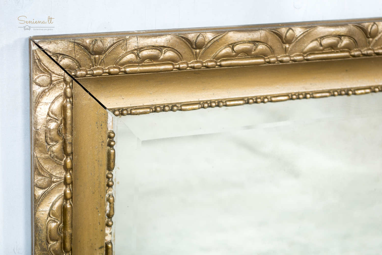 Paauksuoto rėmo veidrodis. Dekoruotas medinis rėmas su ritminiu arkų ornamentu ir karoliukų juostelėmis. Veidrodis parvežtas iš Prancūzijos