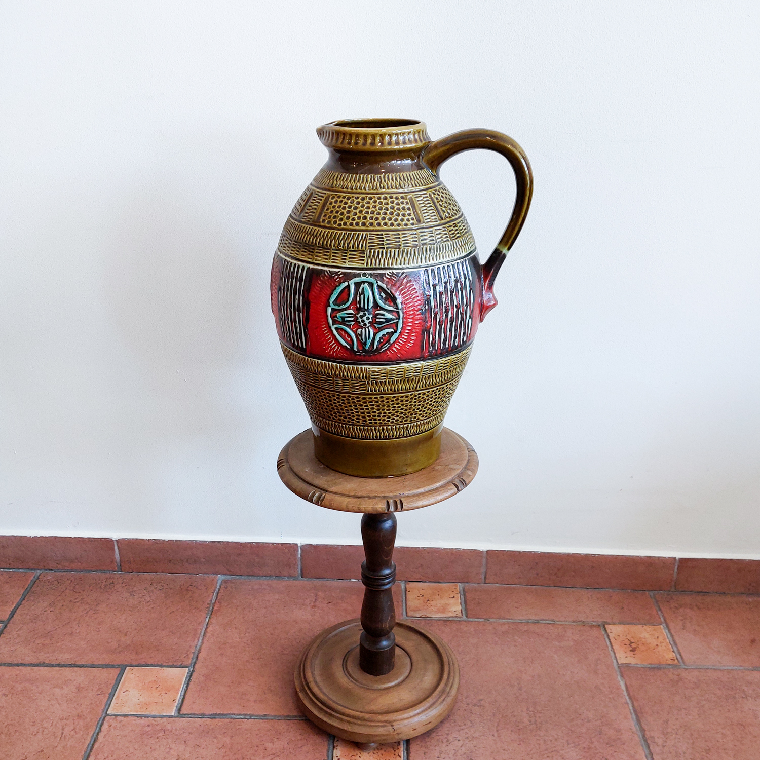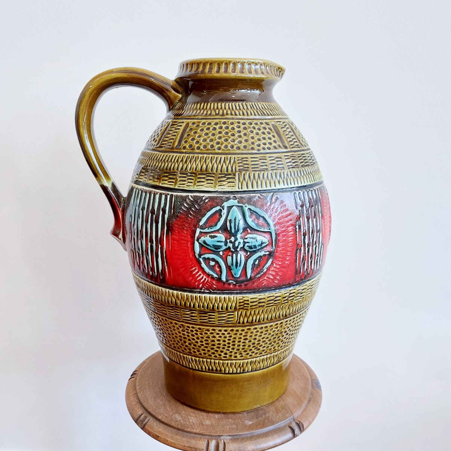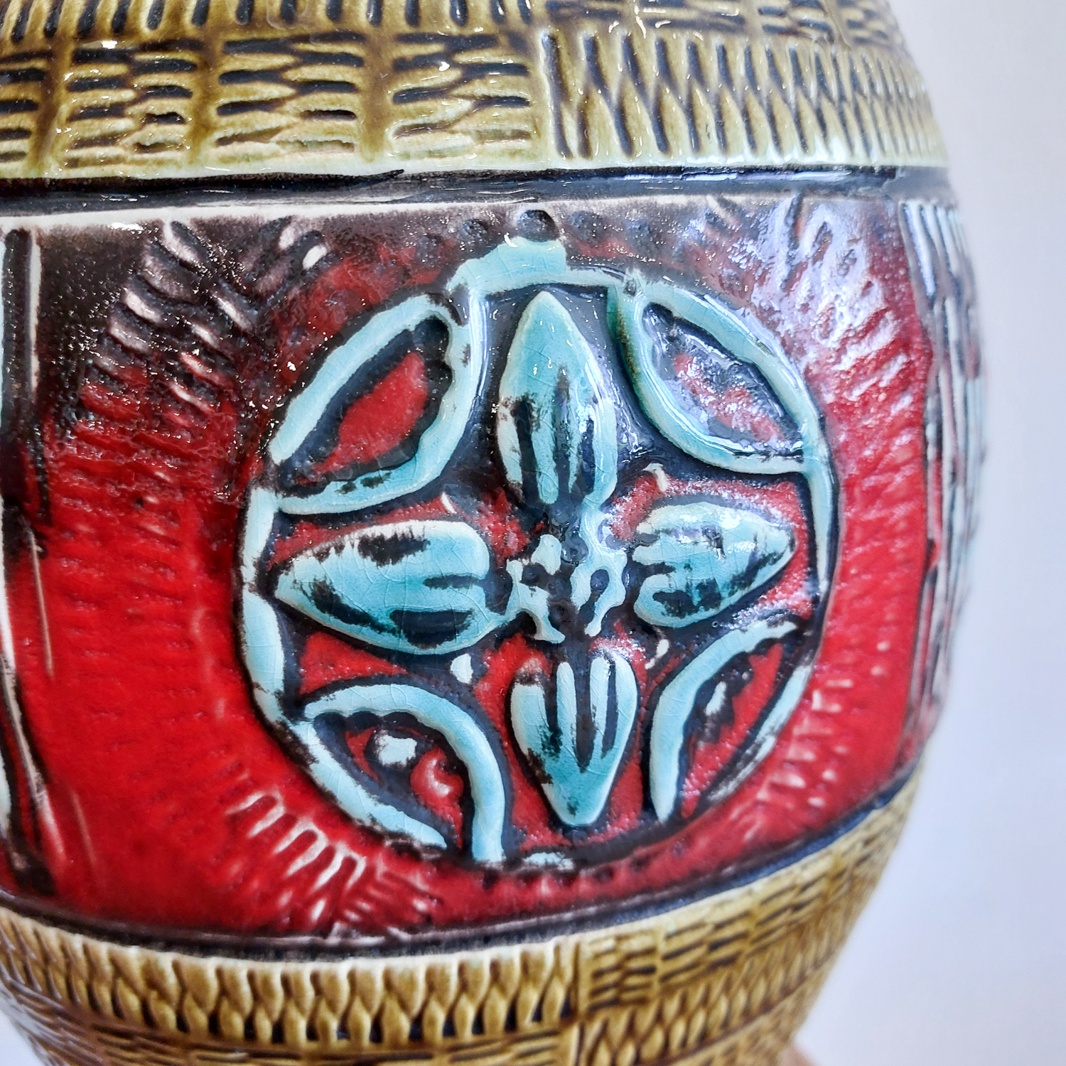 Vintažinė keramikinė vaza „Fat Lava“ stiliuje, pagaminta apie 1960 m. Vakarų Vokietijoje. Ryškus dekoras su reljefine gėle, raudonos ir alyvuogių spalvos derinys, išraiškingi faktūriniai raštai. Žymėta „W. Germany 212-40“.